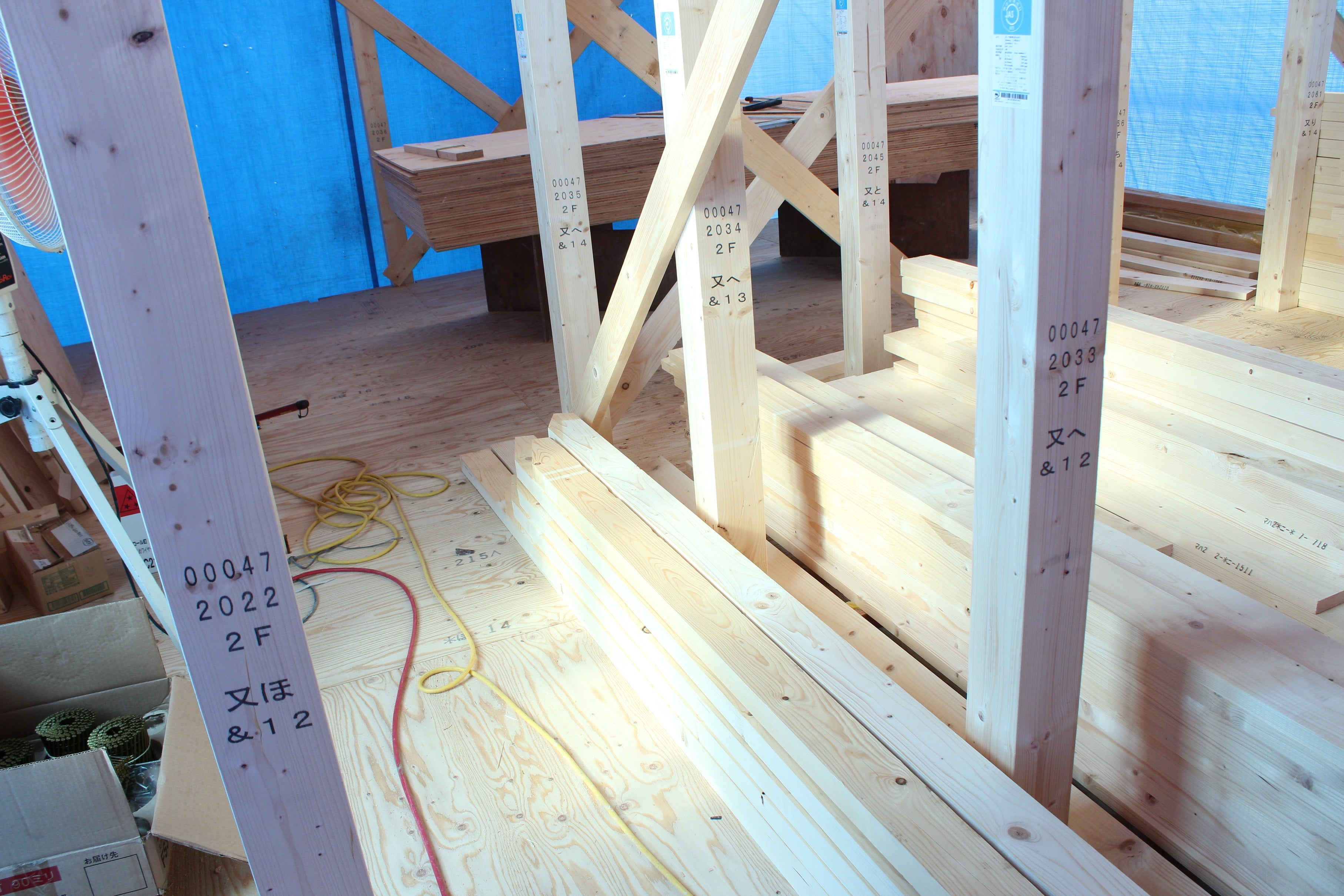 柱のひとつひとつに プレカットの番号が割り振られてます上差し