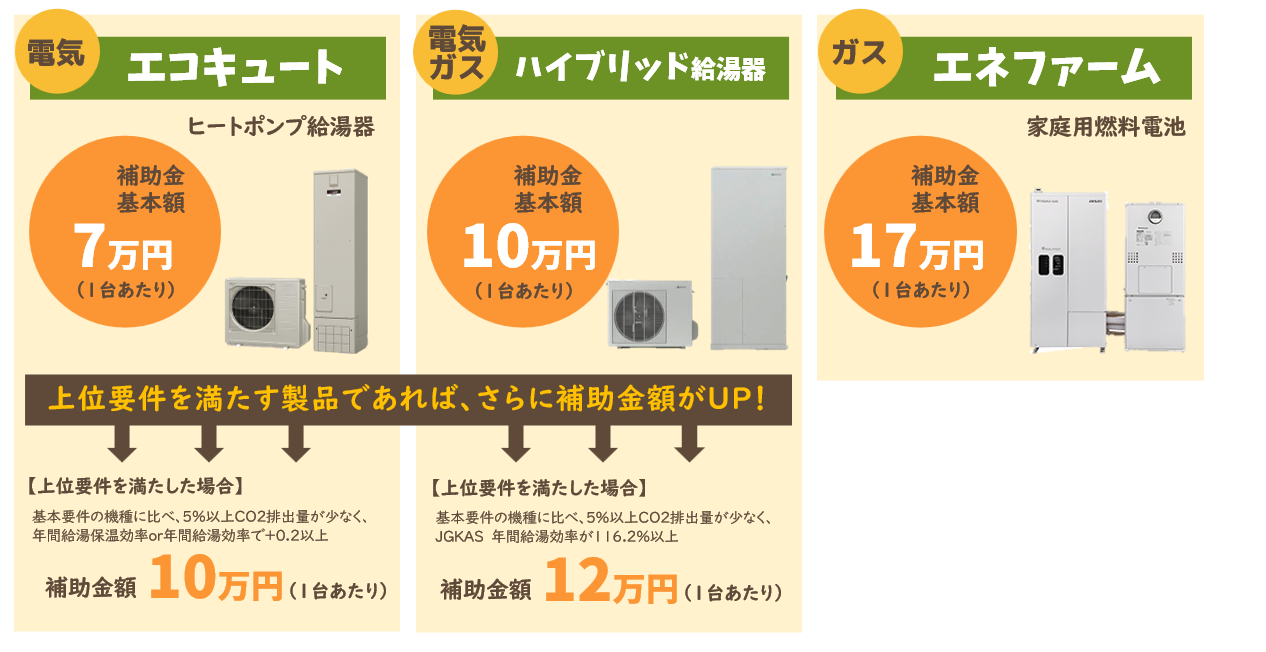 エコキュート・・・基本額7万円/台 ※上位要件を満たせば 10万円/台