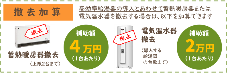 電気温水器を撤去する場合・・・ 補助額 2万円/台 (導入給湯器の台数まで)