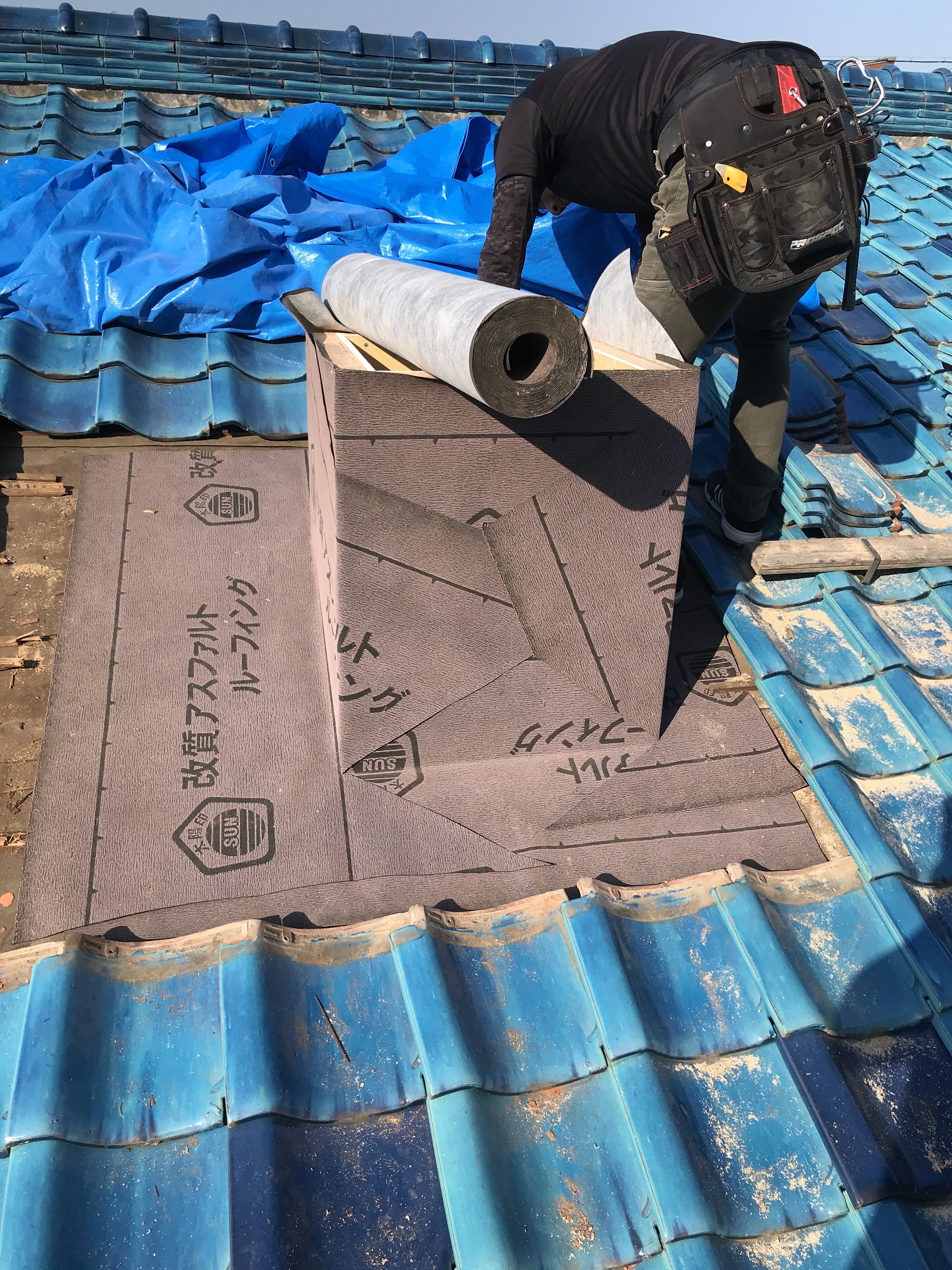 屋根瓦を一部 取り外して 煙突を通す穴を開けていきます![]()