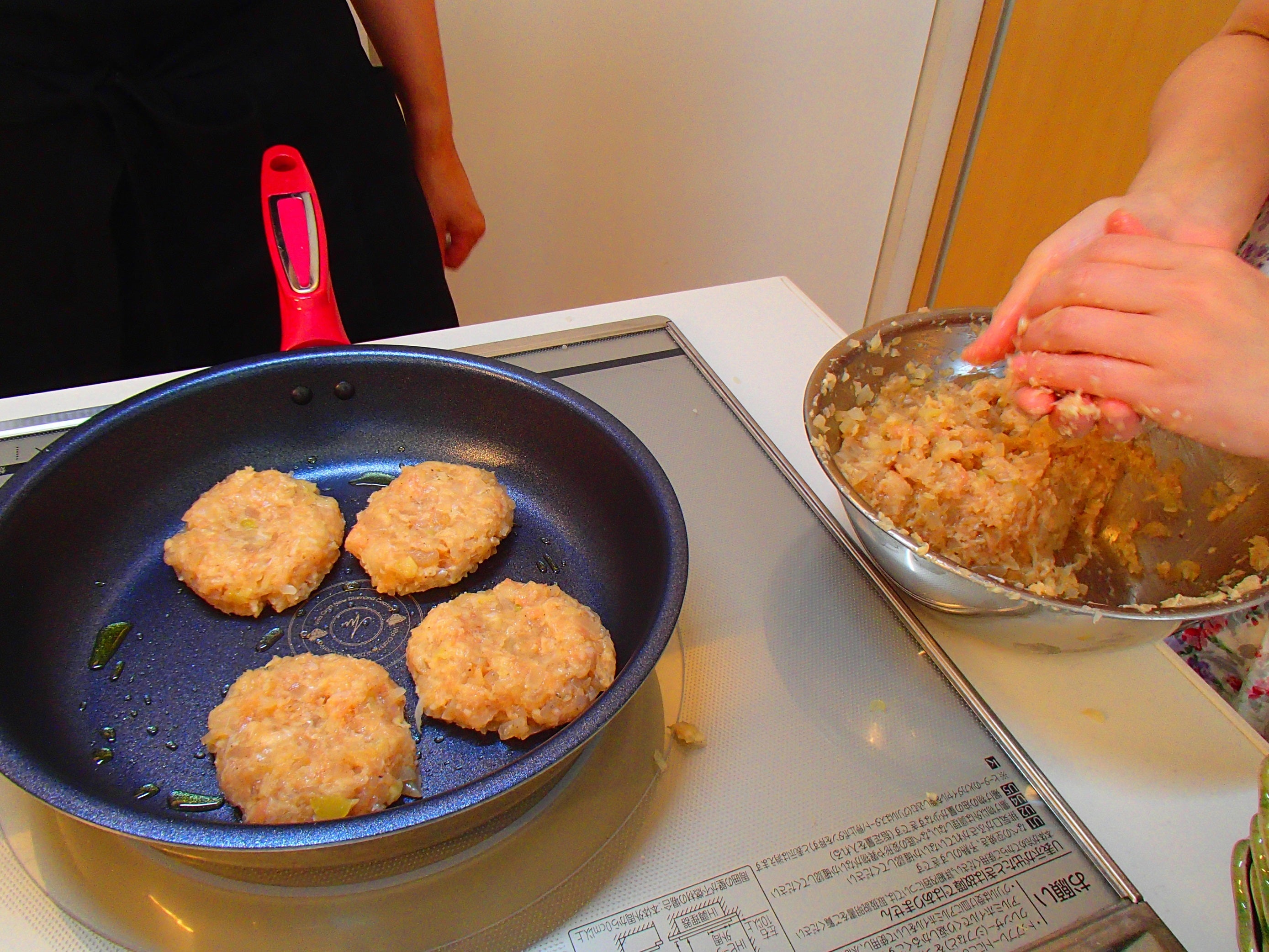 鶏ミンチ・たまねぎ・しょうが・調味料も混ぜ合わせて丸め、