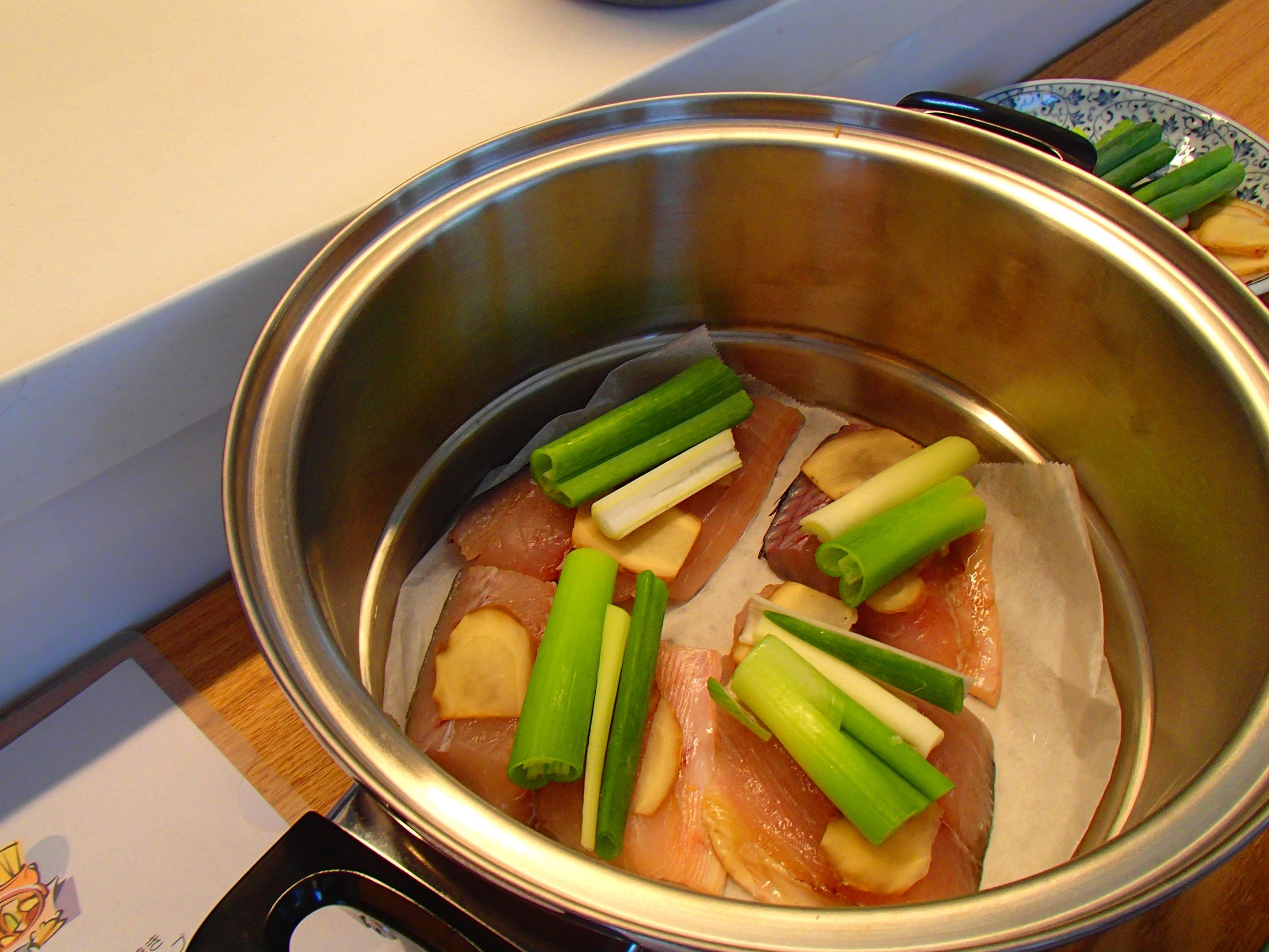 しょうが・ネギを載せ 蒸し器で蒸します![]()