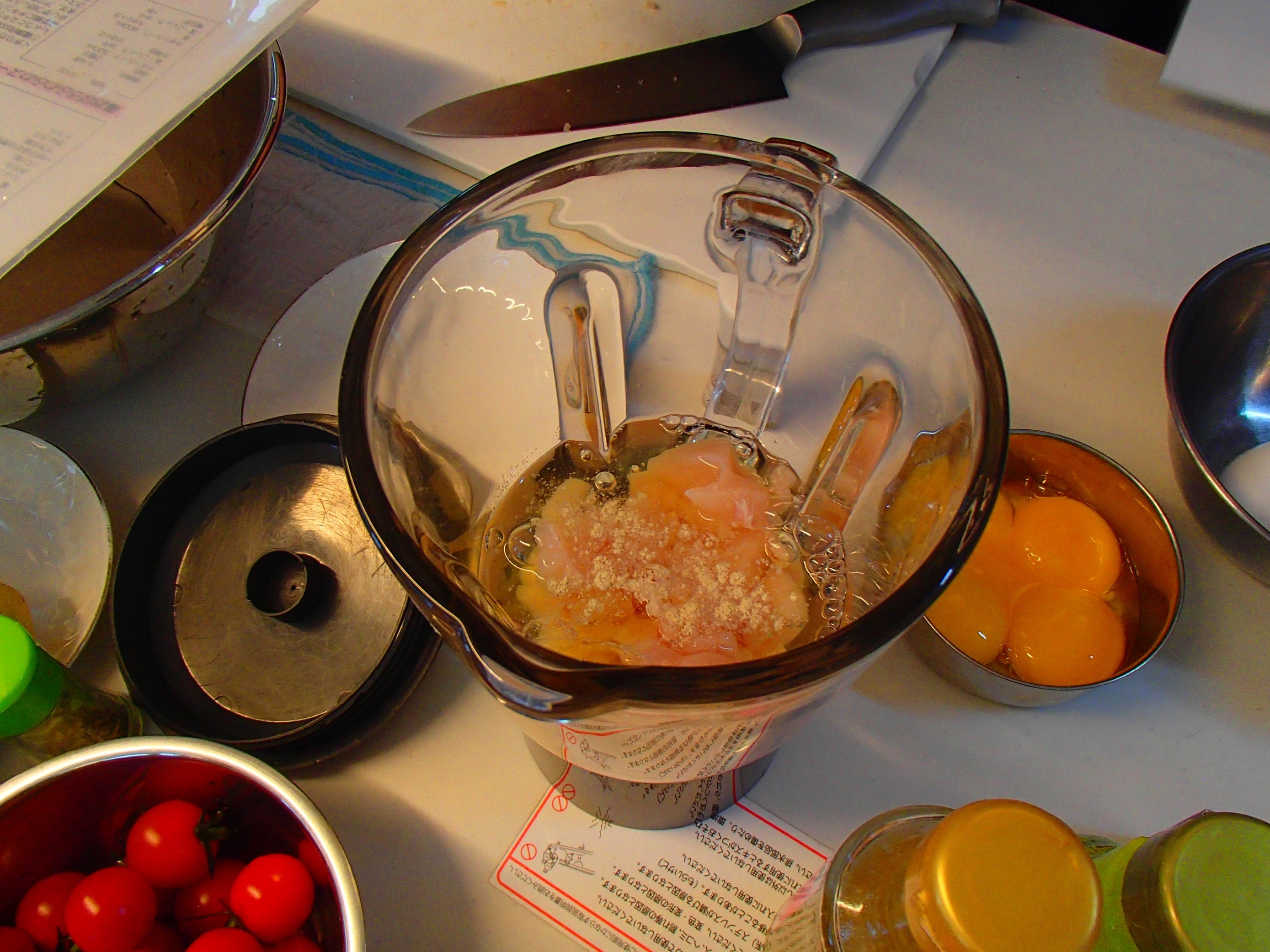 細かく切った鶏むね肉・卵白・チキンスープ をミキサーにかけて