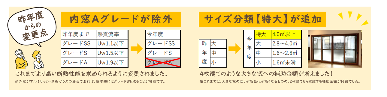 本年度は 内窓グレードAが対象から外れ、 グレードS以上が必要となりました☝️