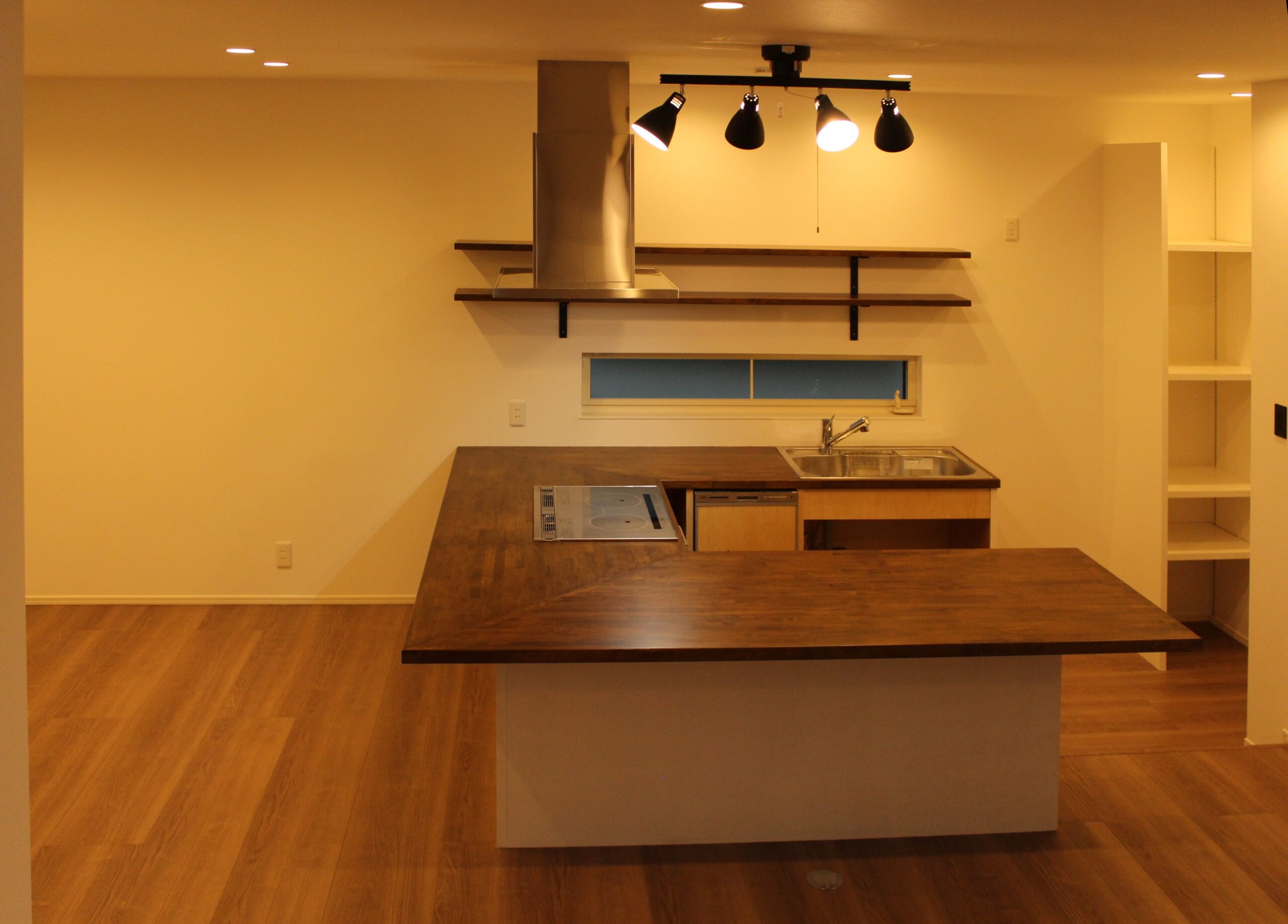 キッチンは絶対コの字型!!そして、カウンターは段差なしで作業もできて食事もできるようにしたい。とのご希望でしたので、キッチンは全て造作にておつくりしました。