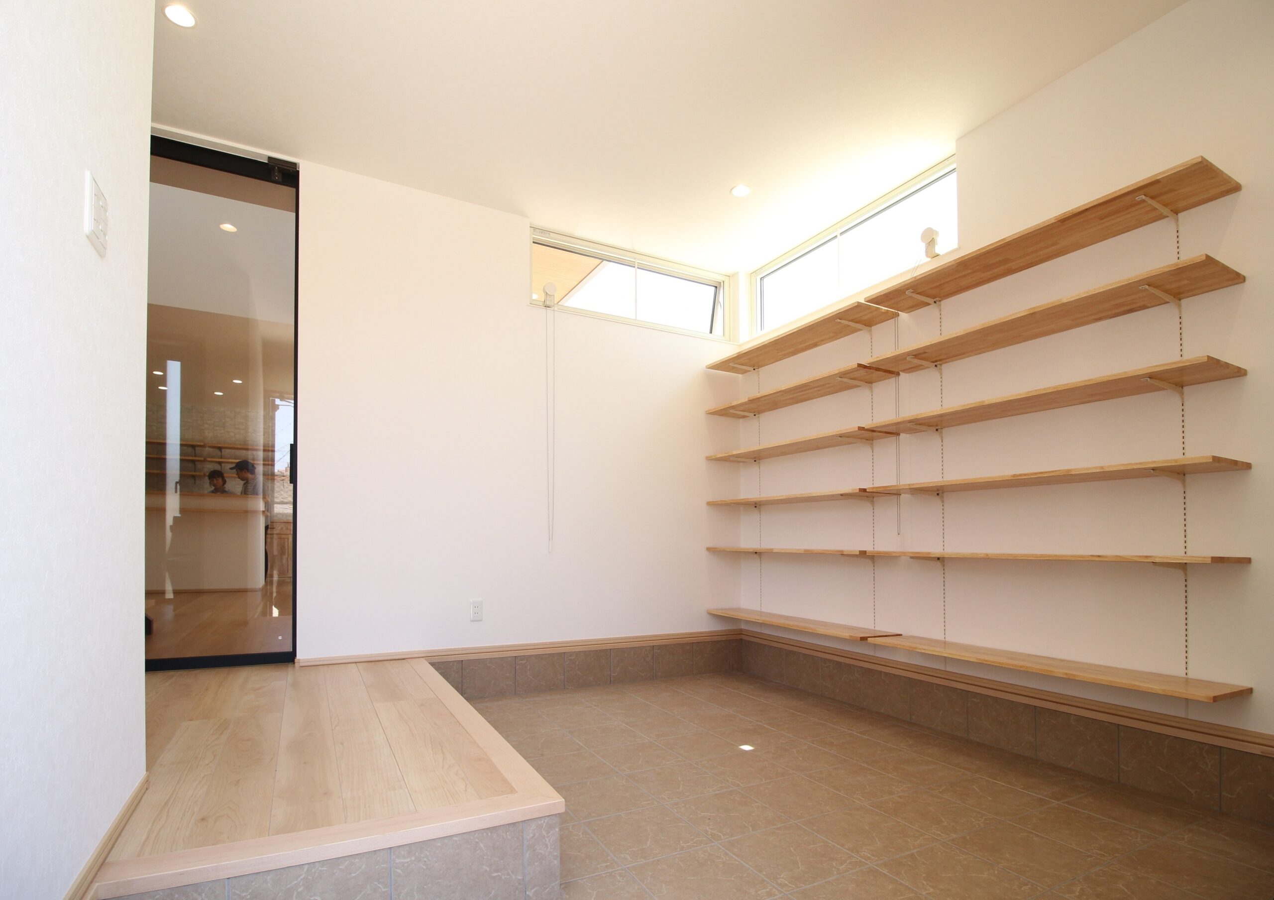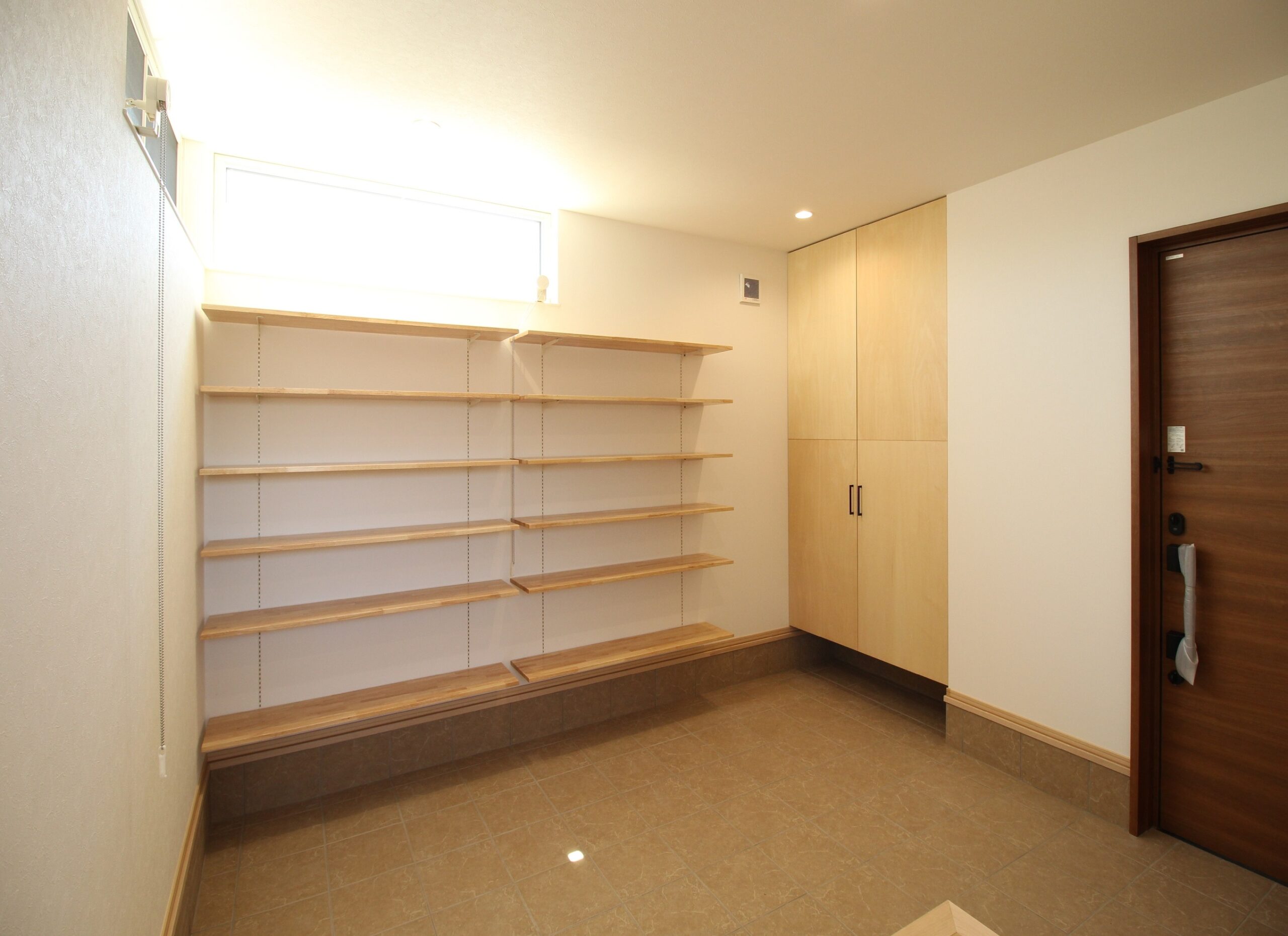 玄関土間は、窓の位置を高くして明るさは確保しながら、大容量の収納も確保しました。