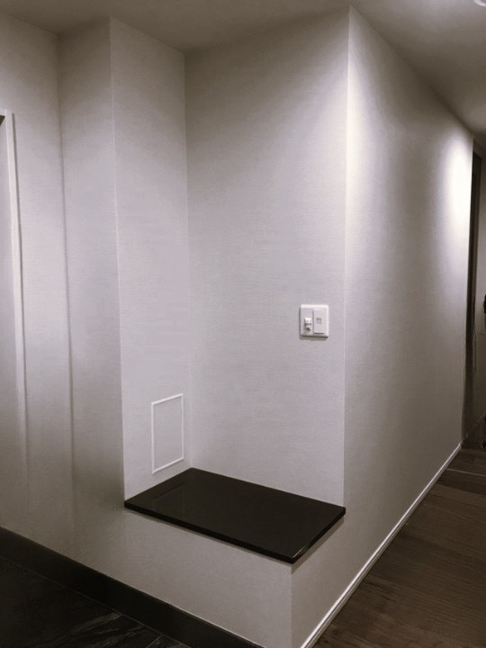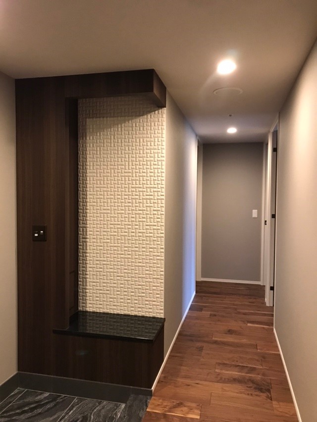 玄関を入ったところにはエコカラットと、木目のクロスでアクセントをつけ、LED照明も取り付けることで雰囲気も演出しました。