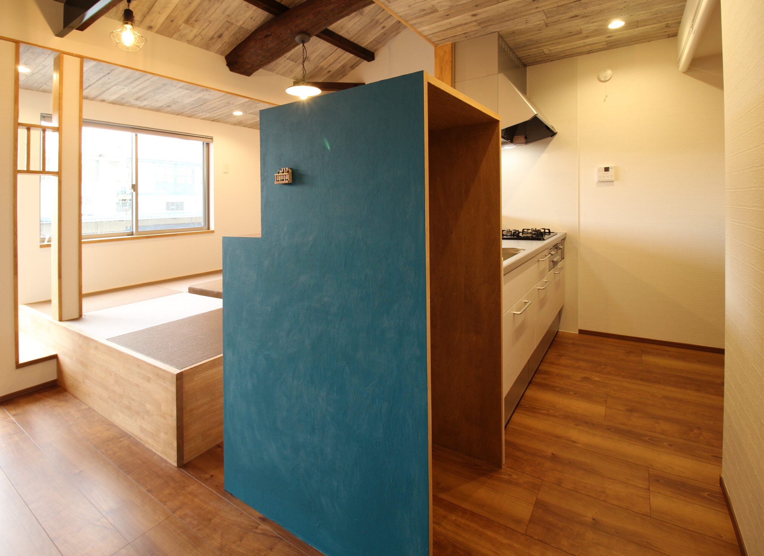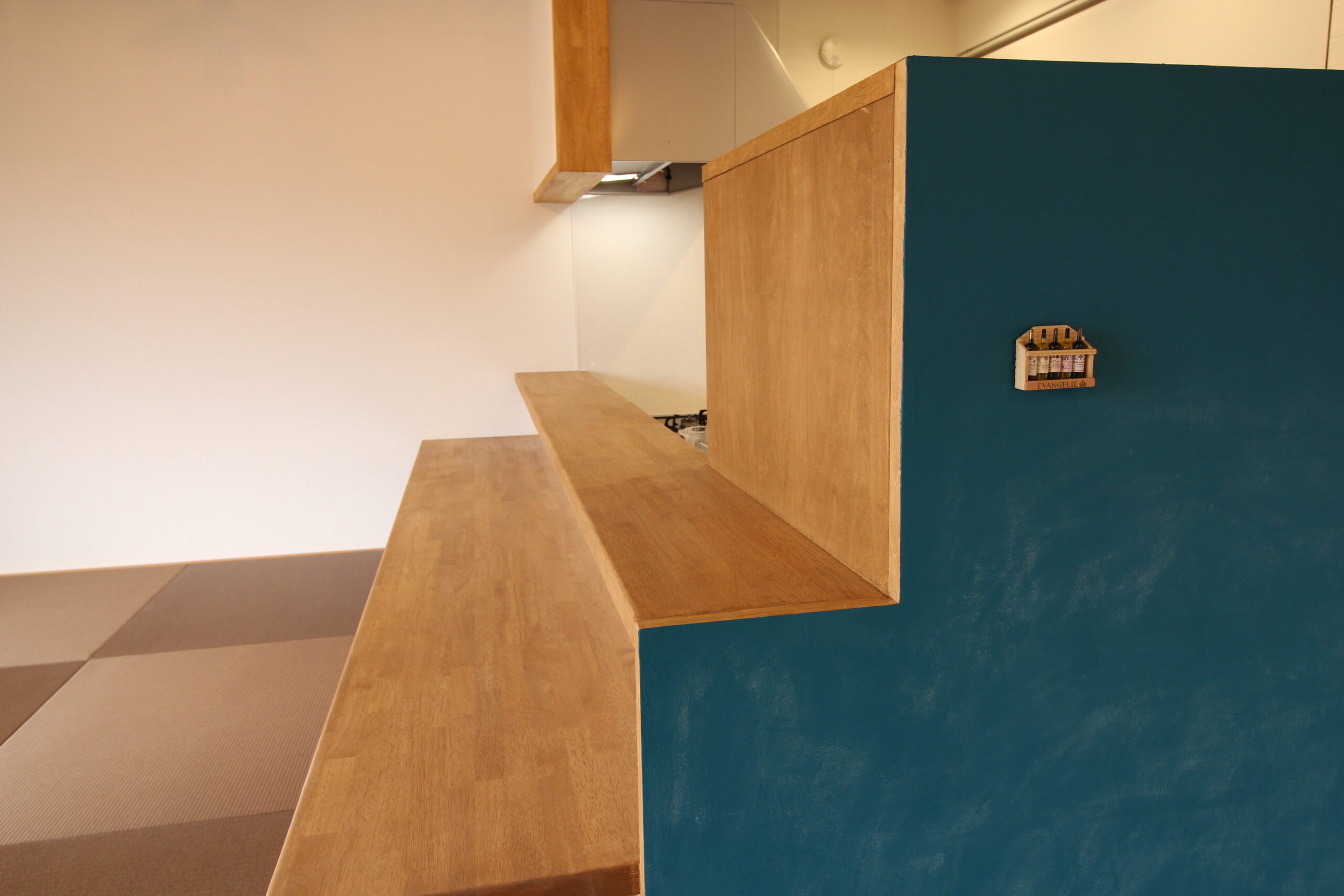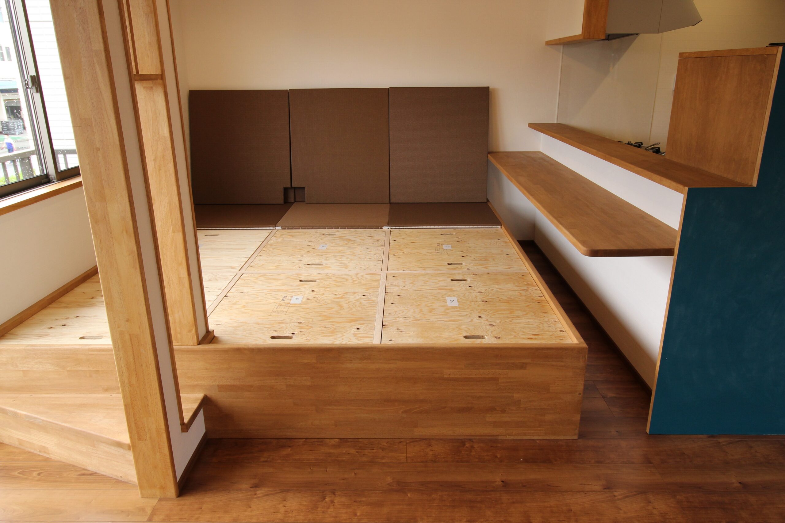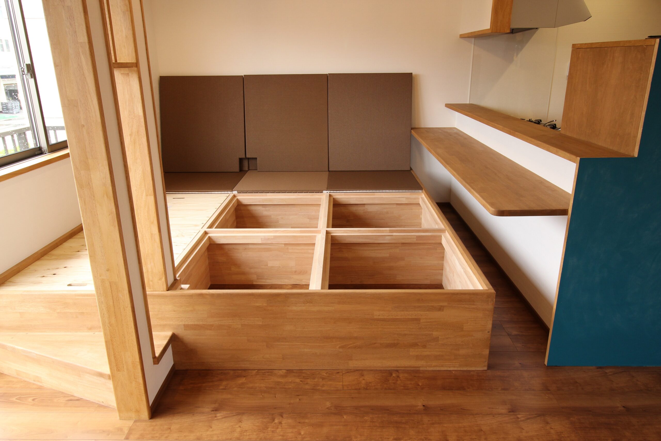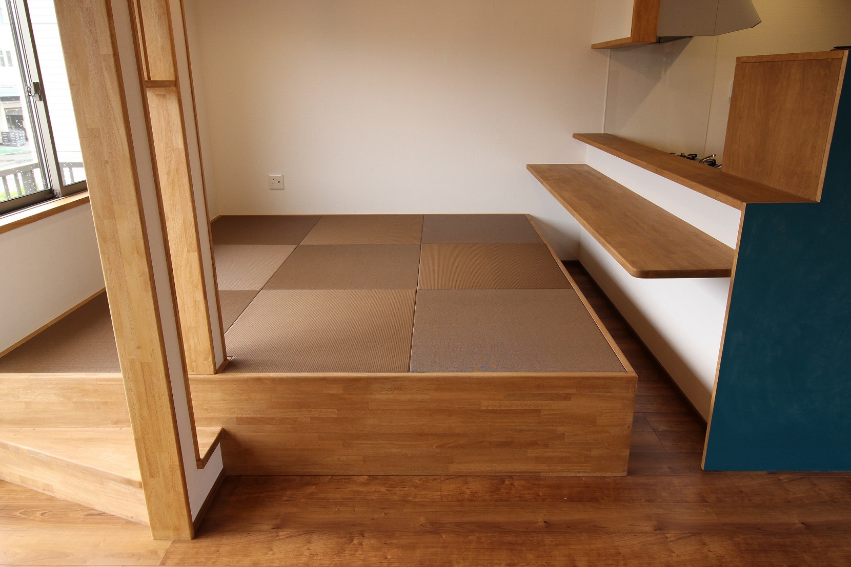 また、対面キッチンのカウンターに座って食事をしたり、そのままごろんと横になれたり、畳を上げれば季節ものの収納ができるような小上がりスペースも設置しました。