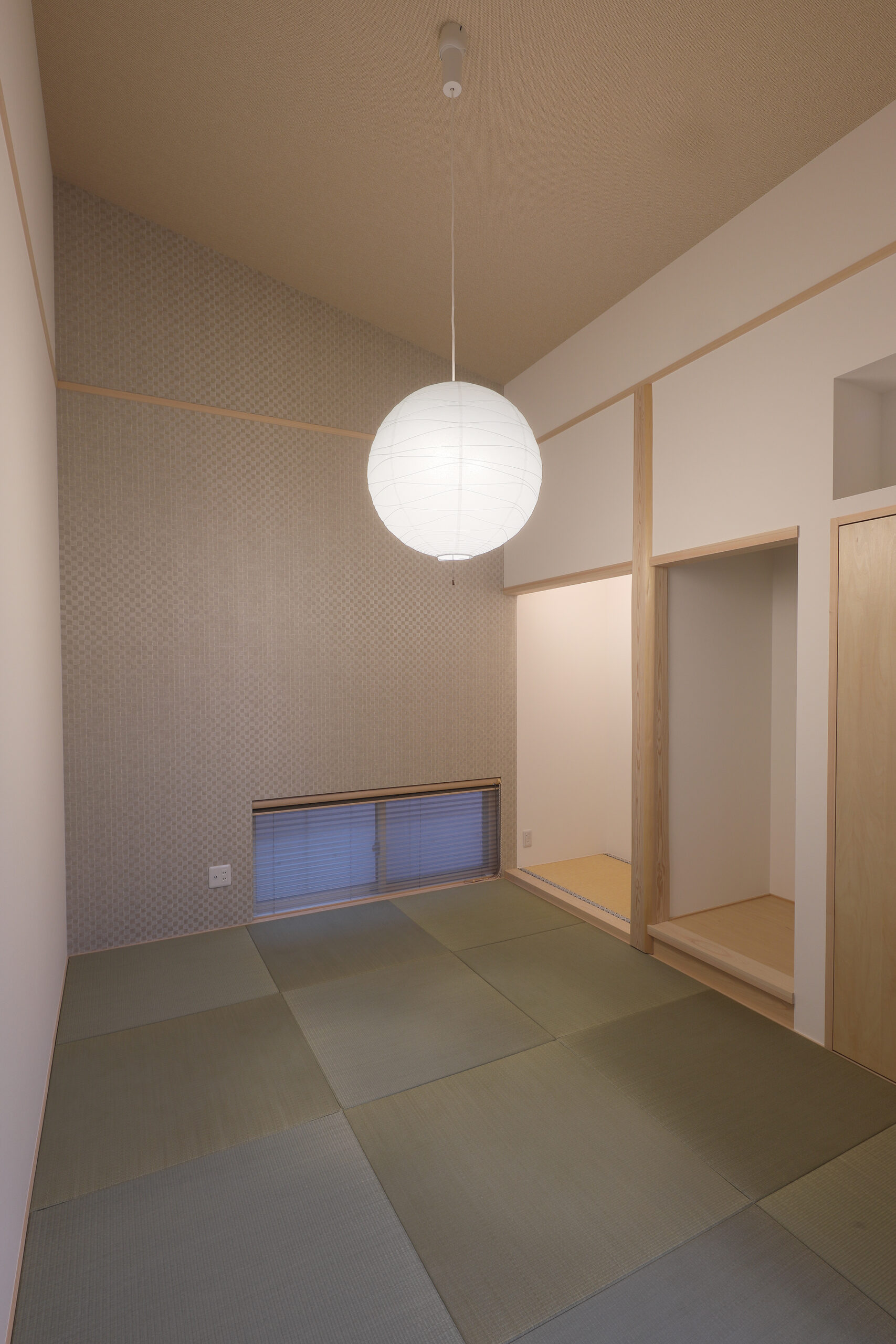 玄関脇の和室は、勾配屋根の高い天井にすることで圧迫感をなくしました。位置的に少し独立しているので、来客時にも大変便利です。