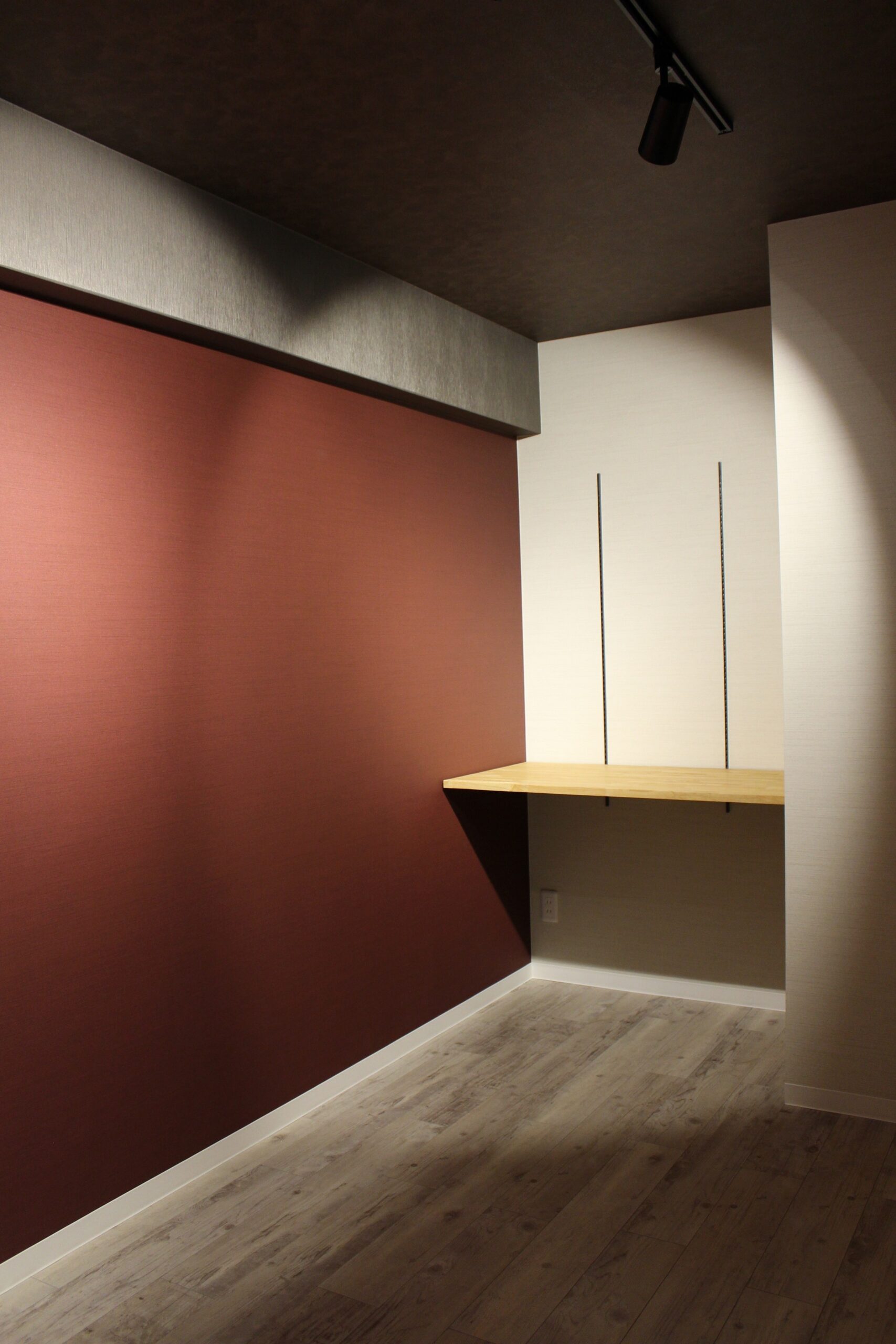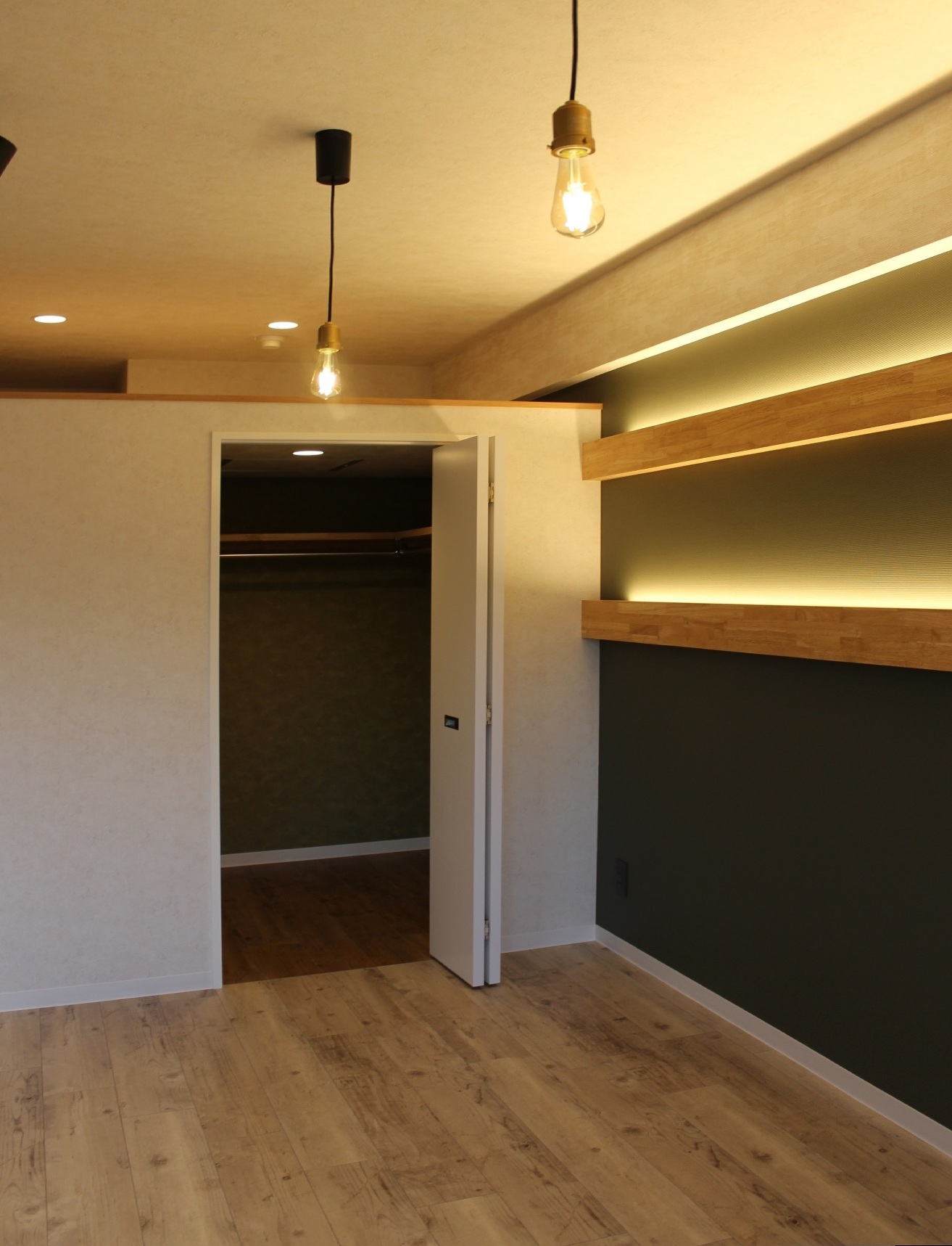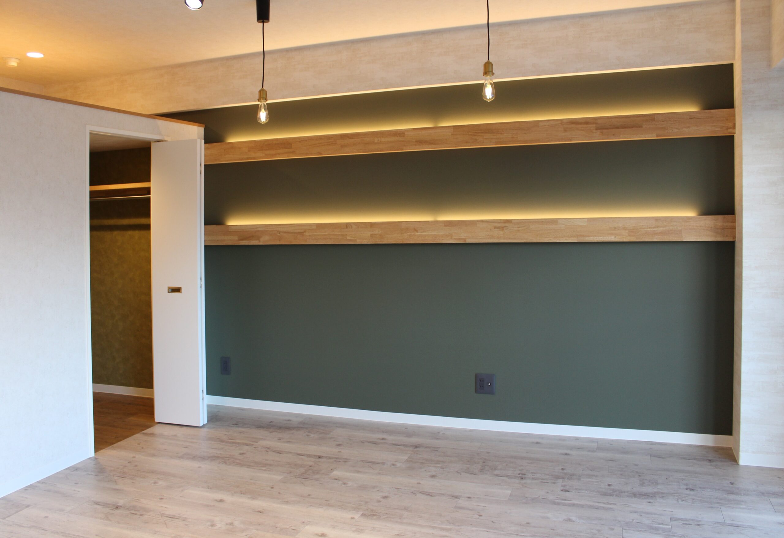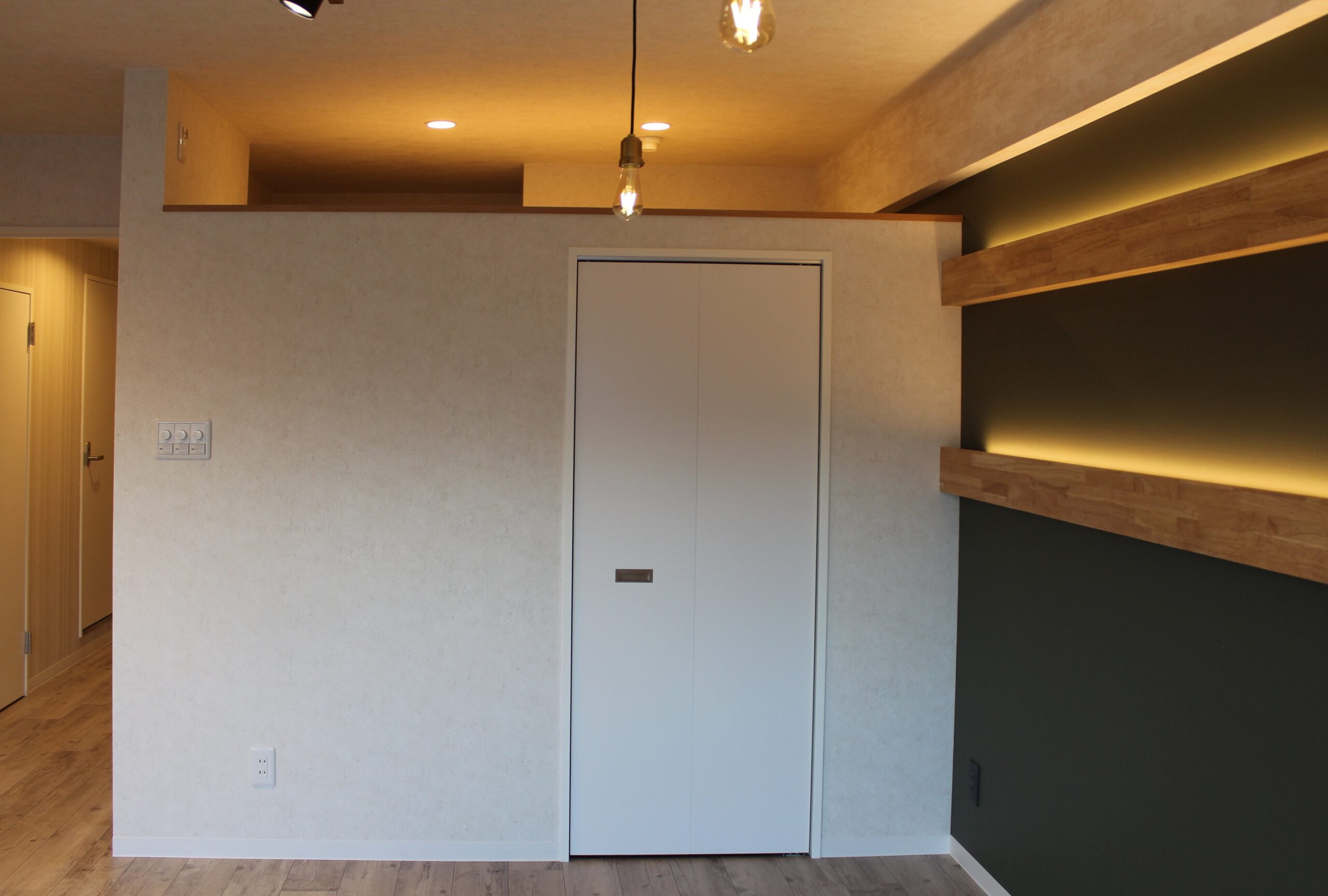 リビングの壁はアクセントで濃い色のクロスをチョイス、間接照明を使って 雰囲気あるリビングに仕上げました。ご要望どおり壁には ギター・ベースを掛けて収納できるようにしました。