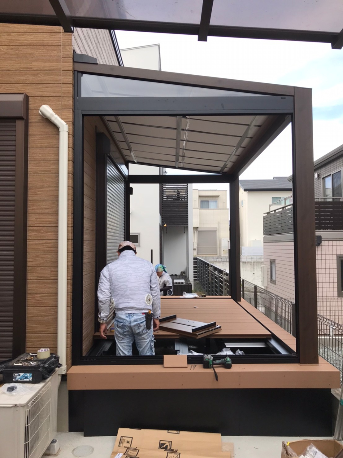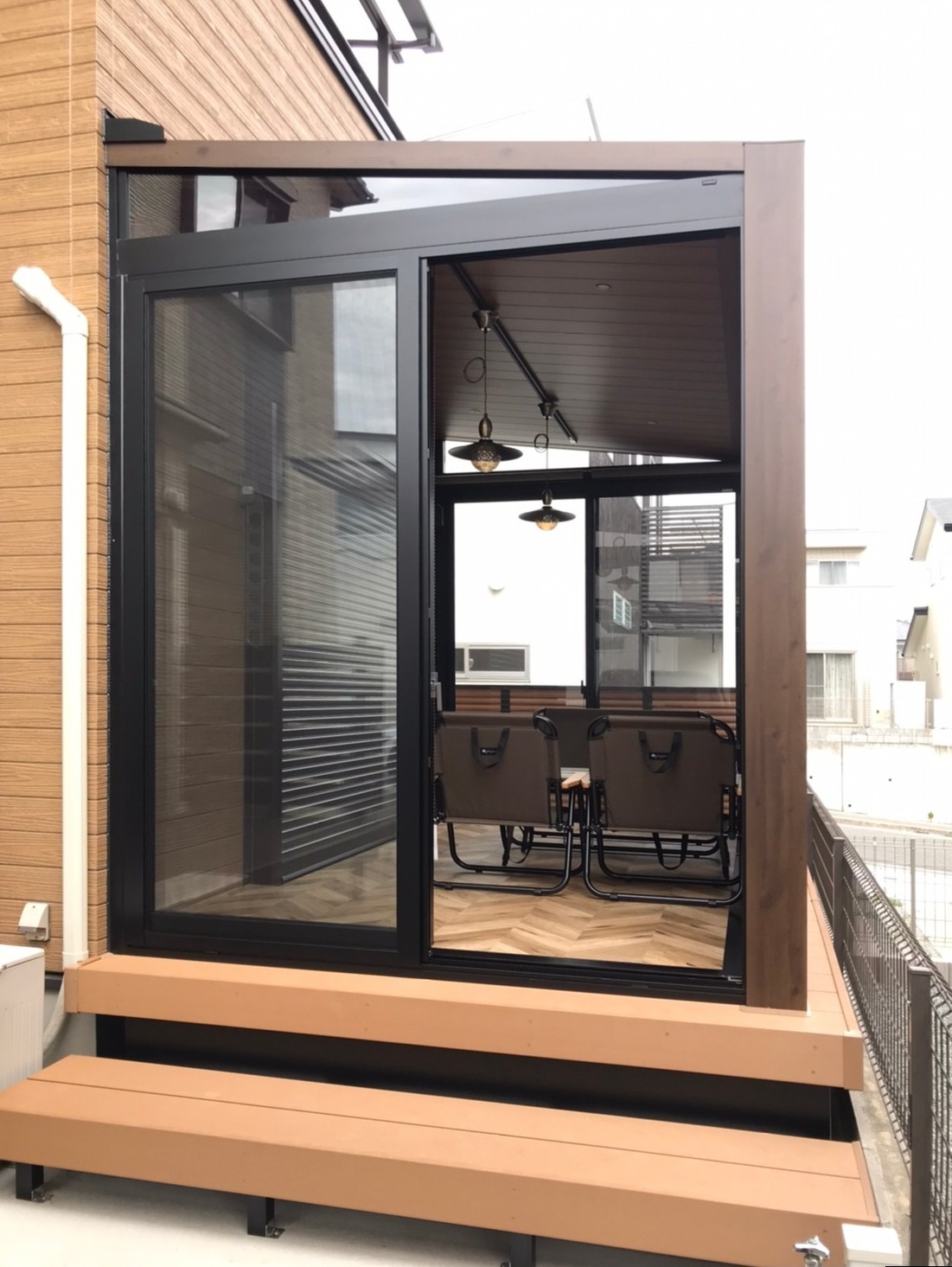 本体の色・化粧カバーの色も おうちの外壁の色にも馴染むような色をお選びいただき、雰囲気のあるかっこいいガーデンルームになりました。