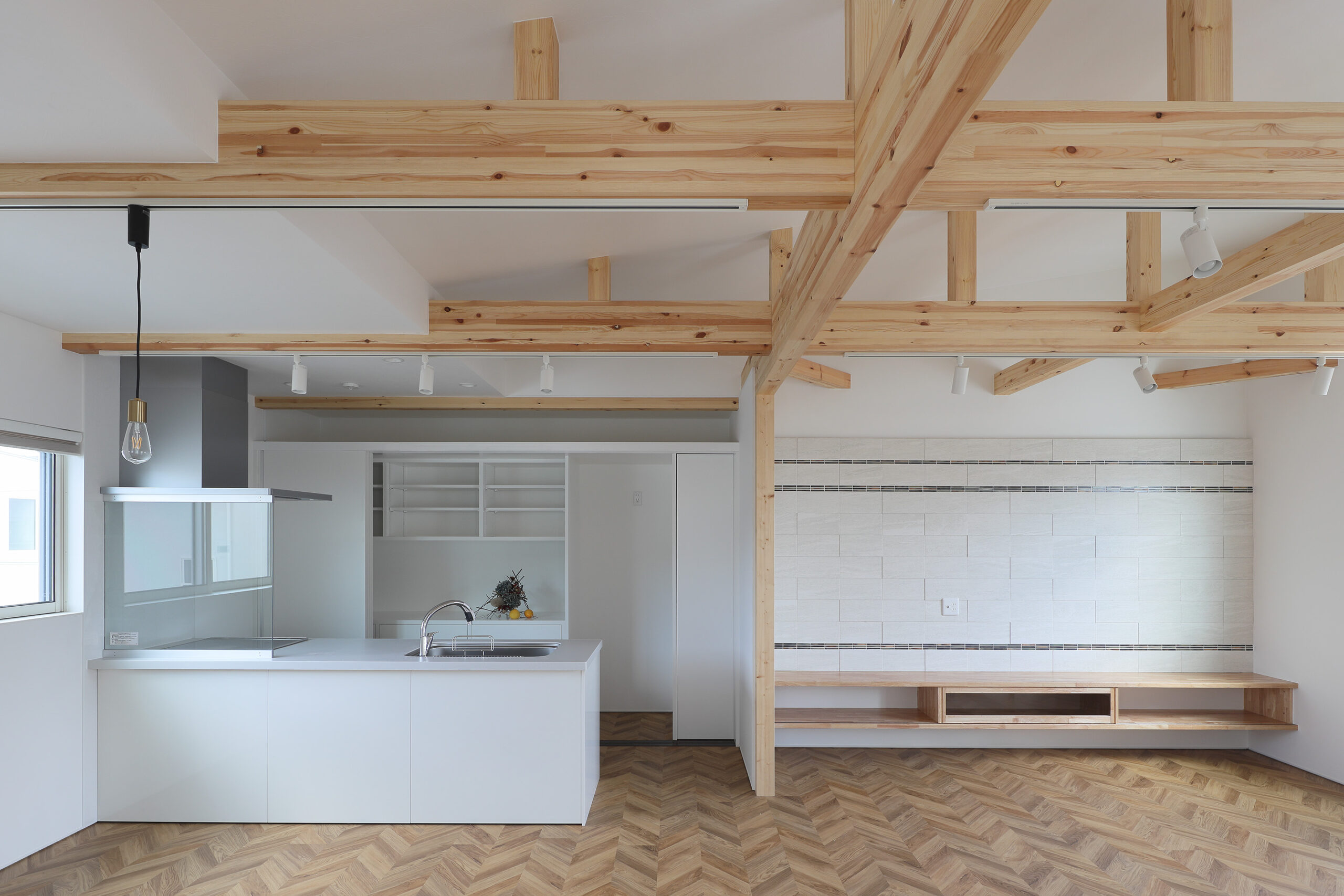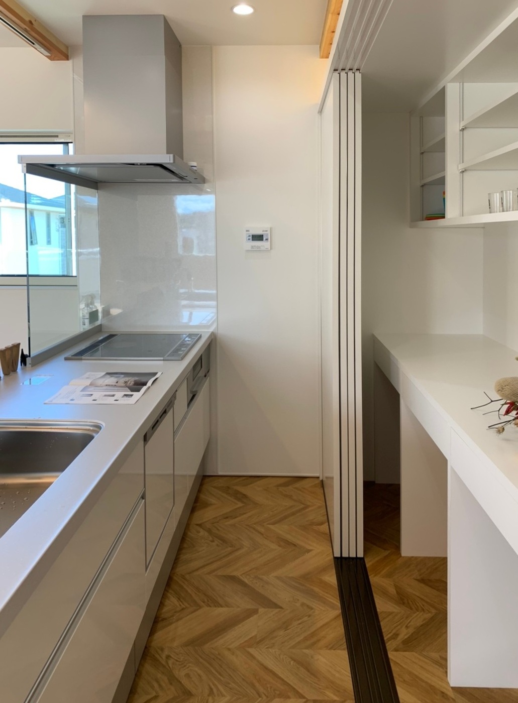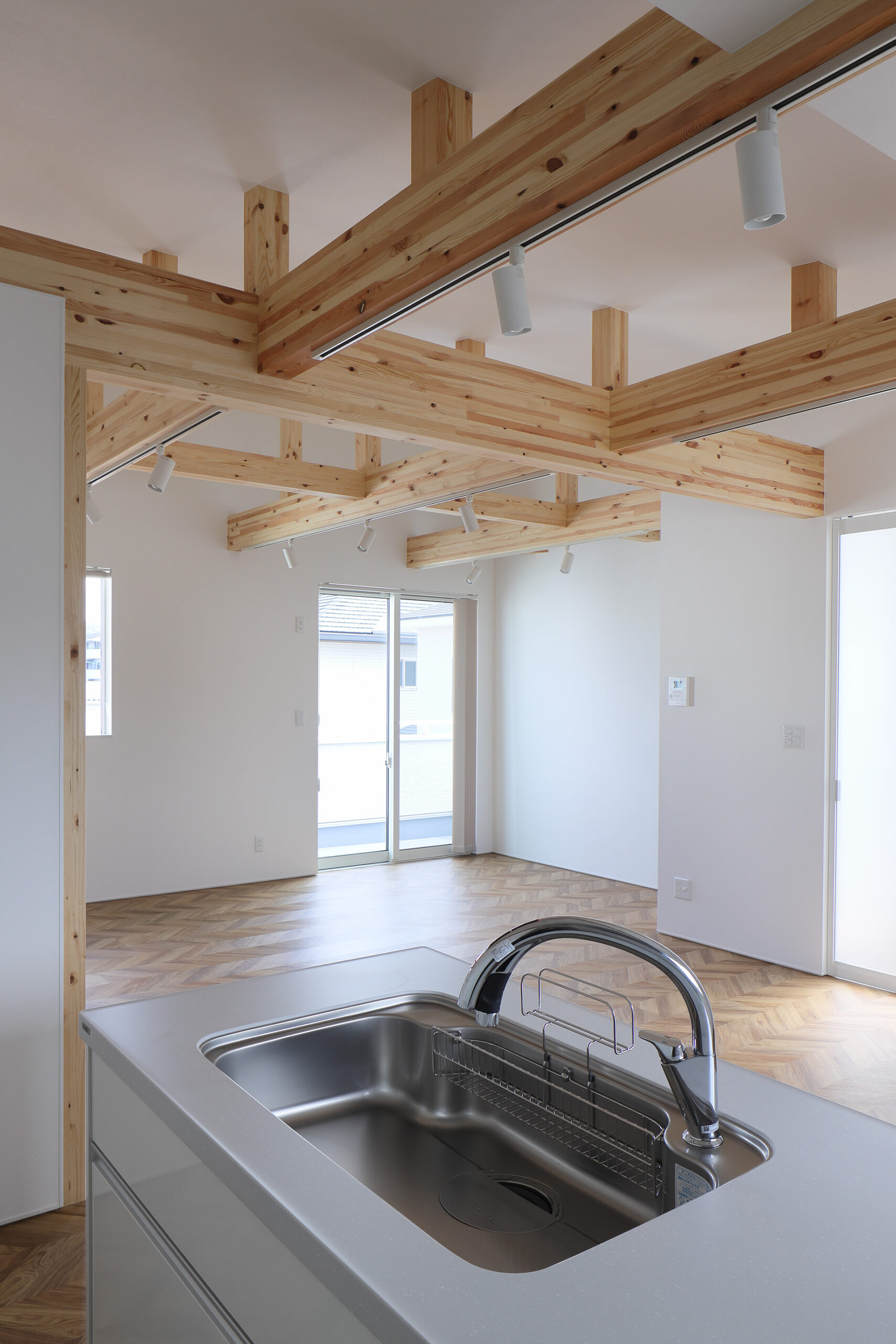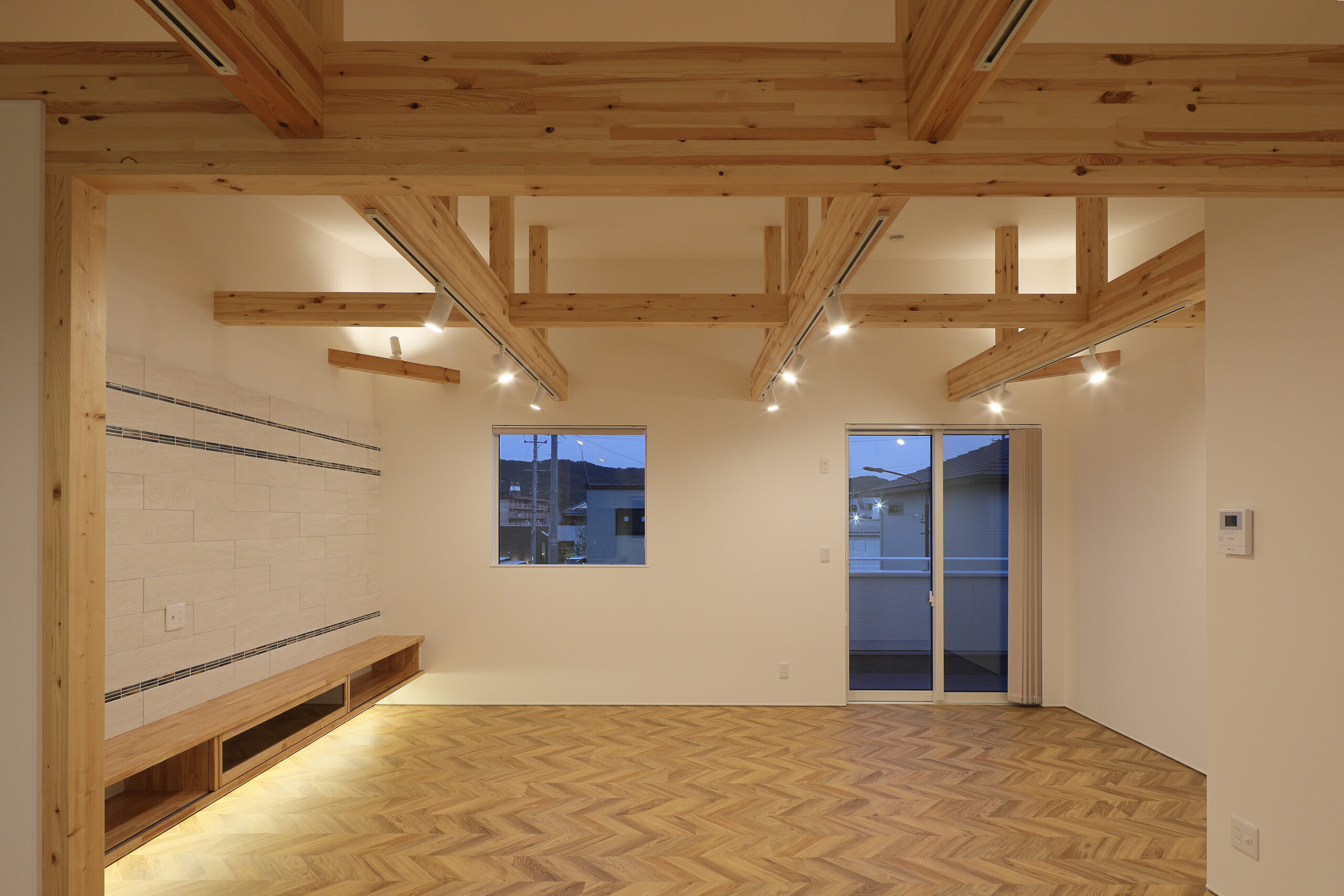 食材などのお買い物の荷物を持って上がる手間などは出てしまいますが、2階リビングだと遮るものなく日当たりがばっちりです。1階のリビングに比べると、道行く人の視線を気にせずくつろいで過ごしていただけます。また東隣が公園になっているので、ますます開放感たっぷりのリビングを実現することができました。リビングの見せる梁でおしゃれ感をUP、空間に立体感と奥行を生み出してくれます。