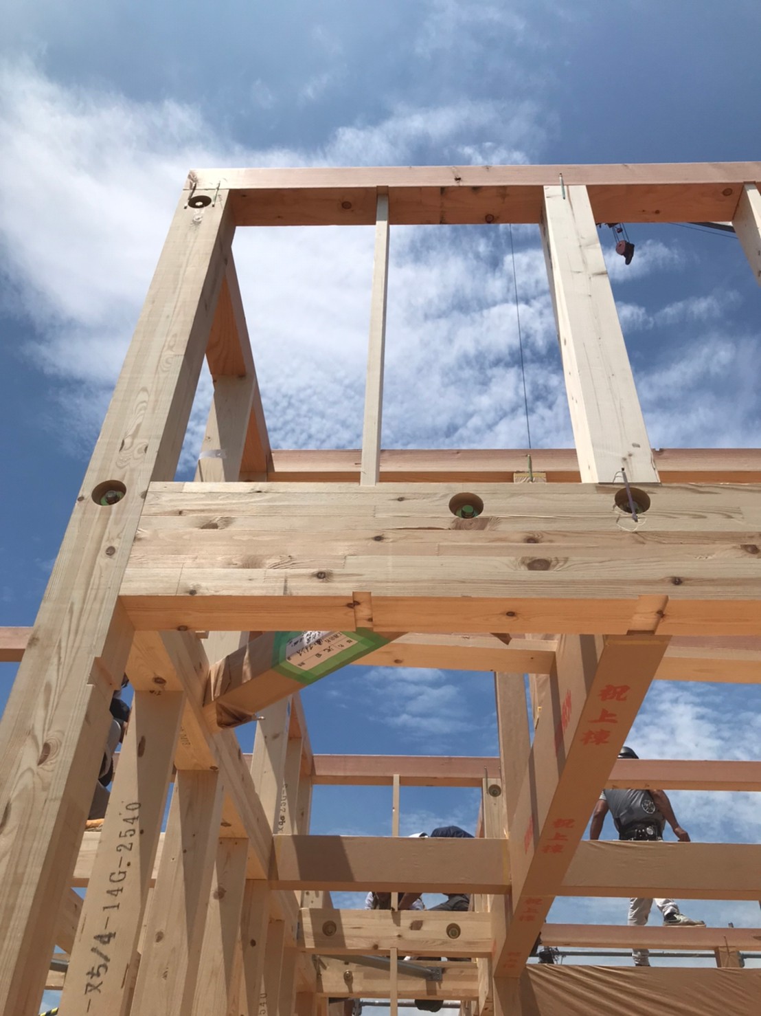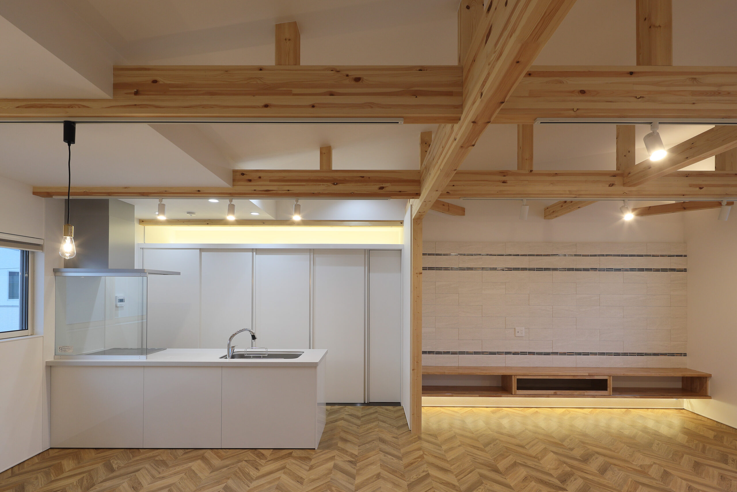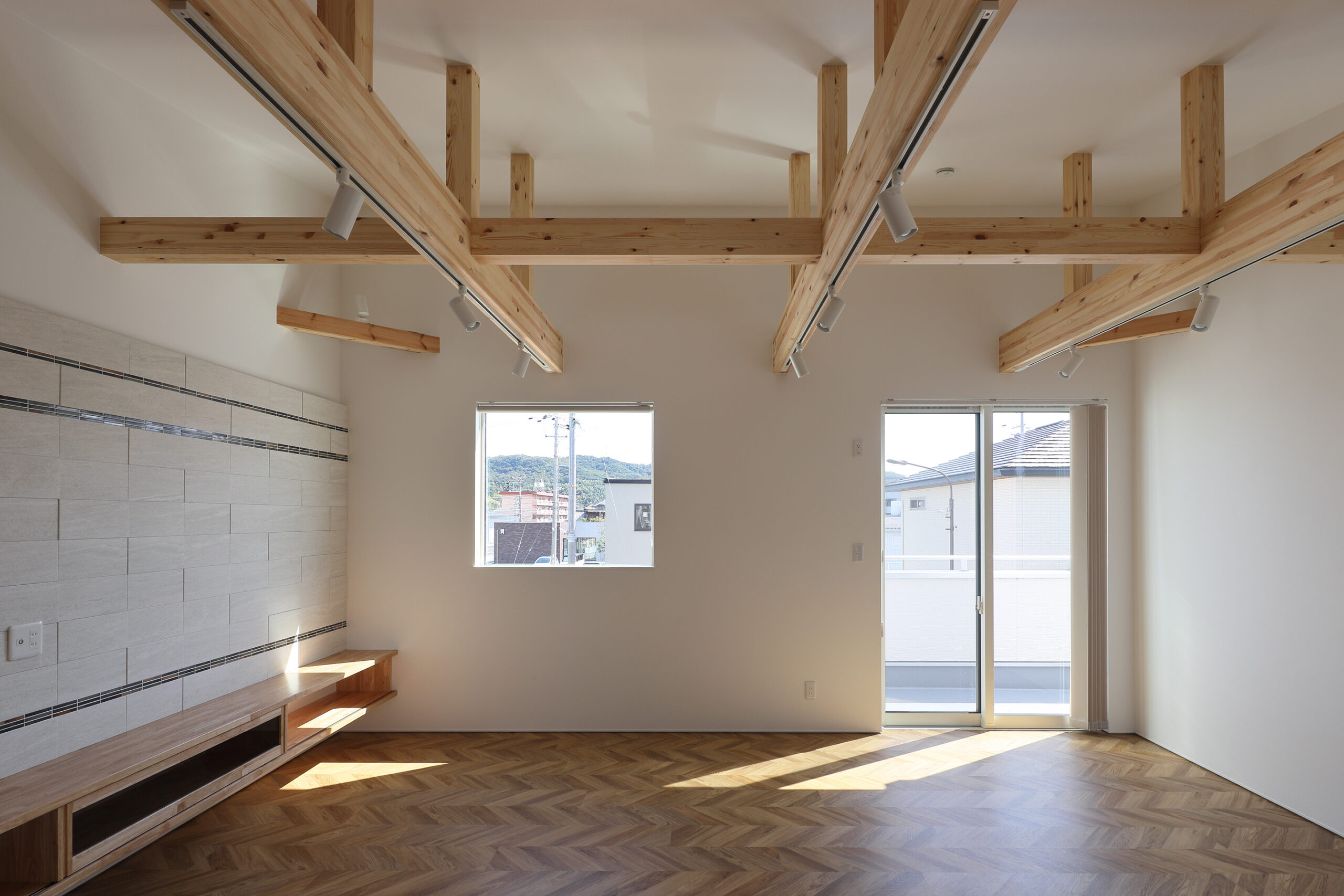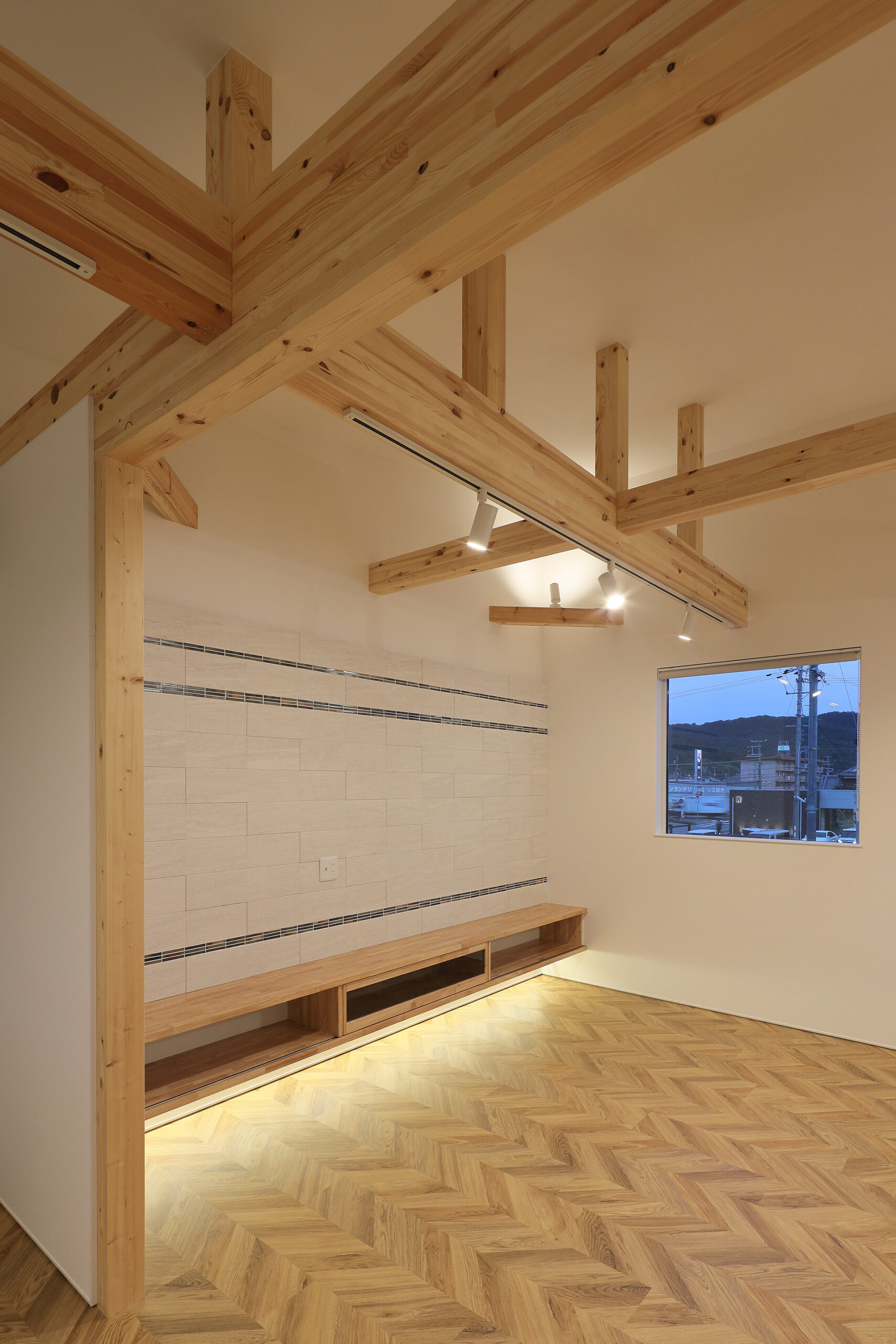 食材などのお買い物の荷物を持って上がる手間などは出てしまいますが、2階リビングだと遮るものなく日当たりがばっちりです。1階のリビングに比べると、道行く人の視線を気にせずくつろいで過ごしていただけます。また東隣が公園になっているので、ますます開放感たっぷりのリビングを実現することができました。リビングの見せる梁でおしゃれ感をUP、空間に立体感と奥行を生み出してくれます。