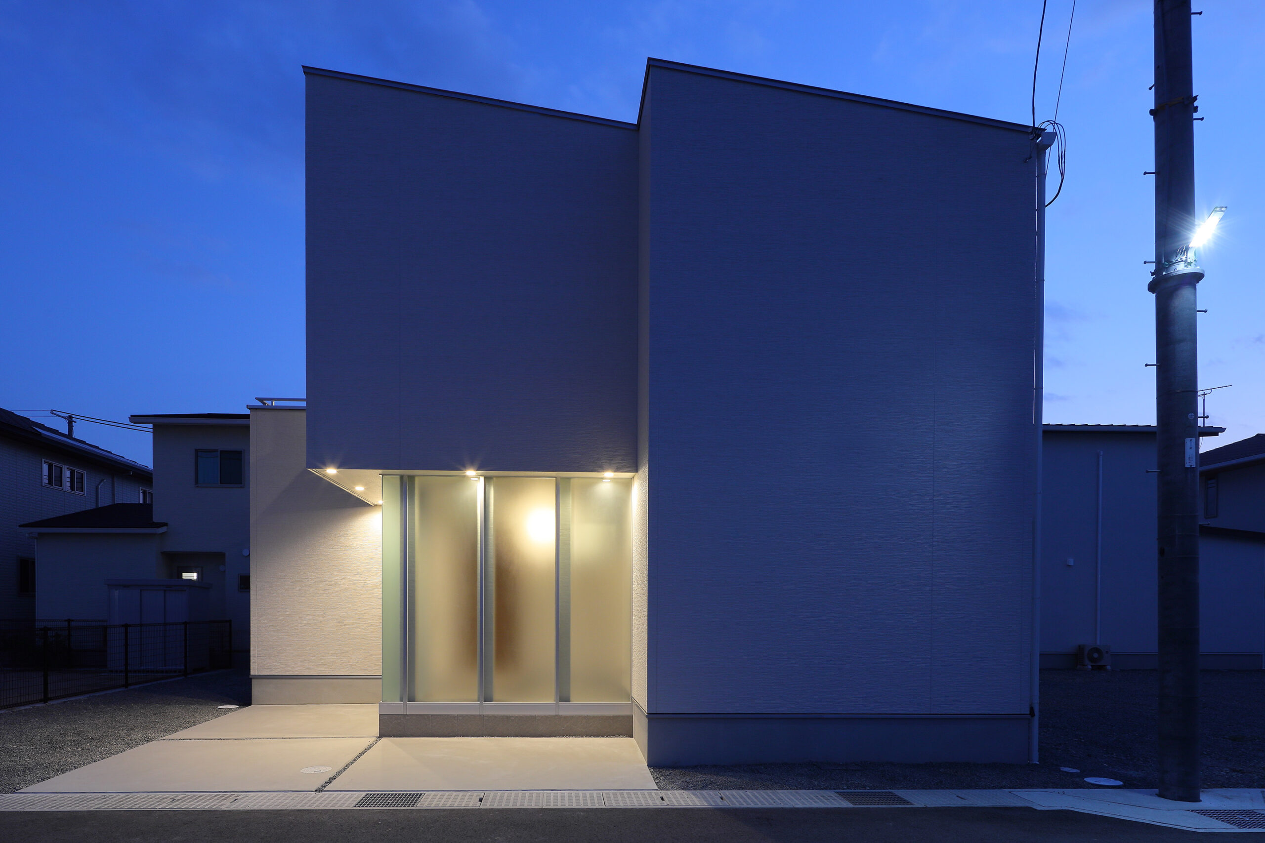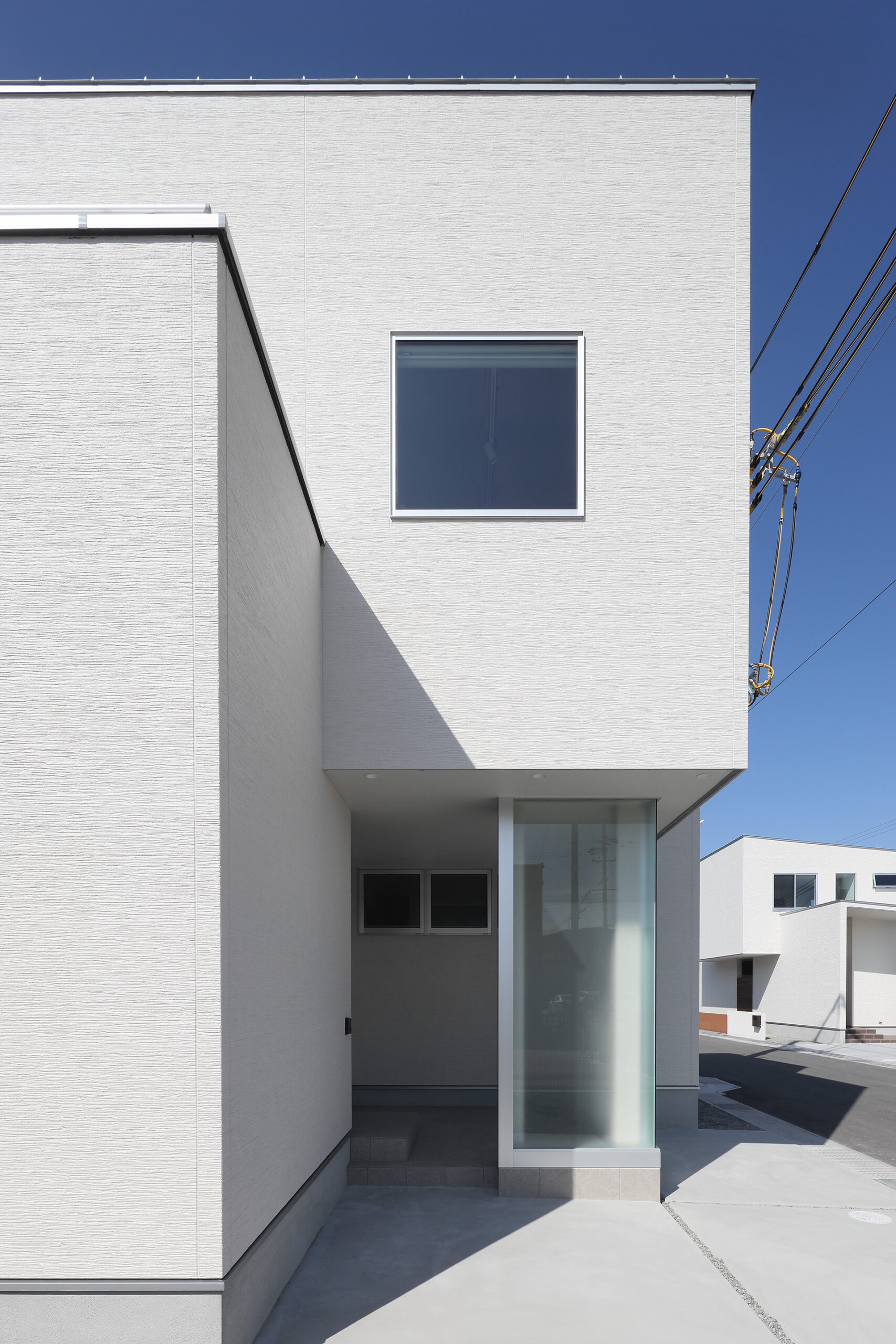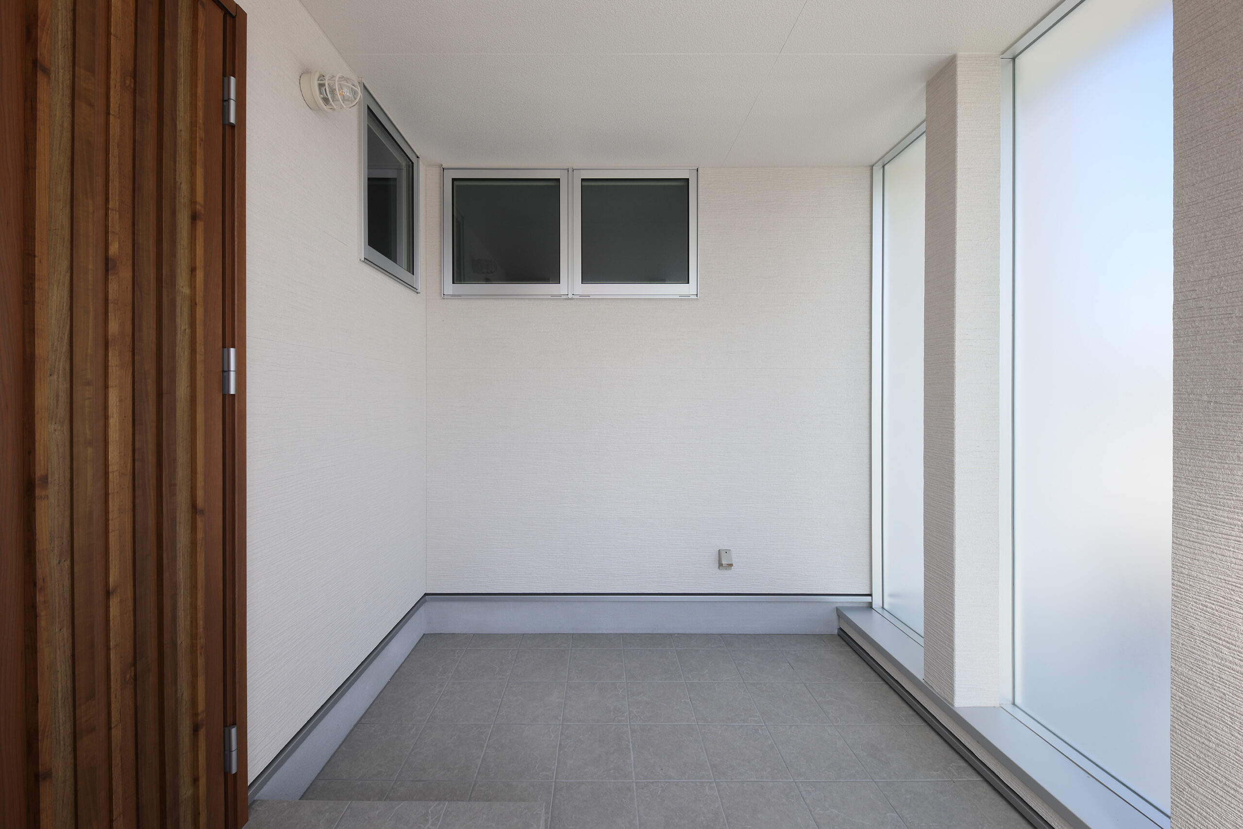 外壁は白一色ですっきりシンプルに。エントランスには大きなガラスを使い特徴的な外観となりました。ガラスの内側は、自転車やベビーカーなど 外で使うけれど雨ざらしにはしたくないものを置いたりするのにちょうどいい場所。すりガラスになるようなフィルムを貼って玄関から室内が丸見えにならないようプライバシーを守る役割も果たします。