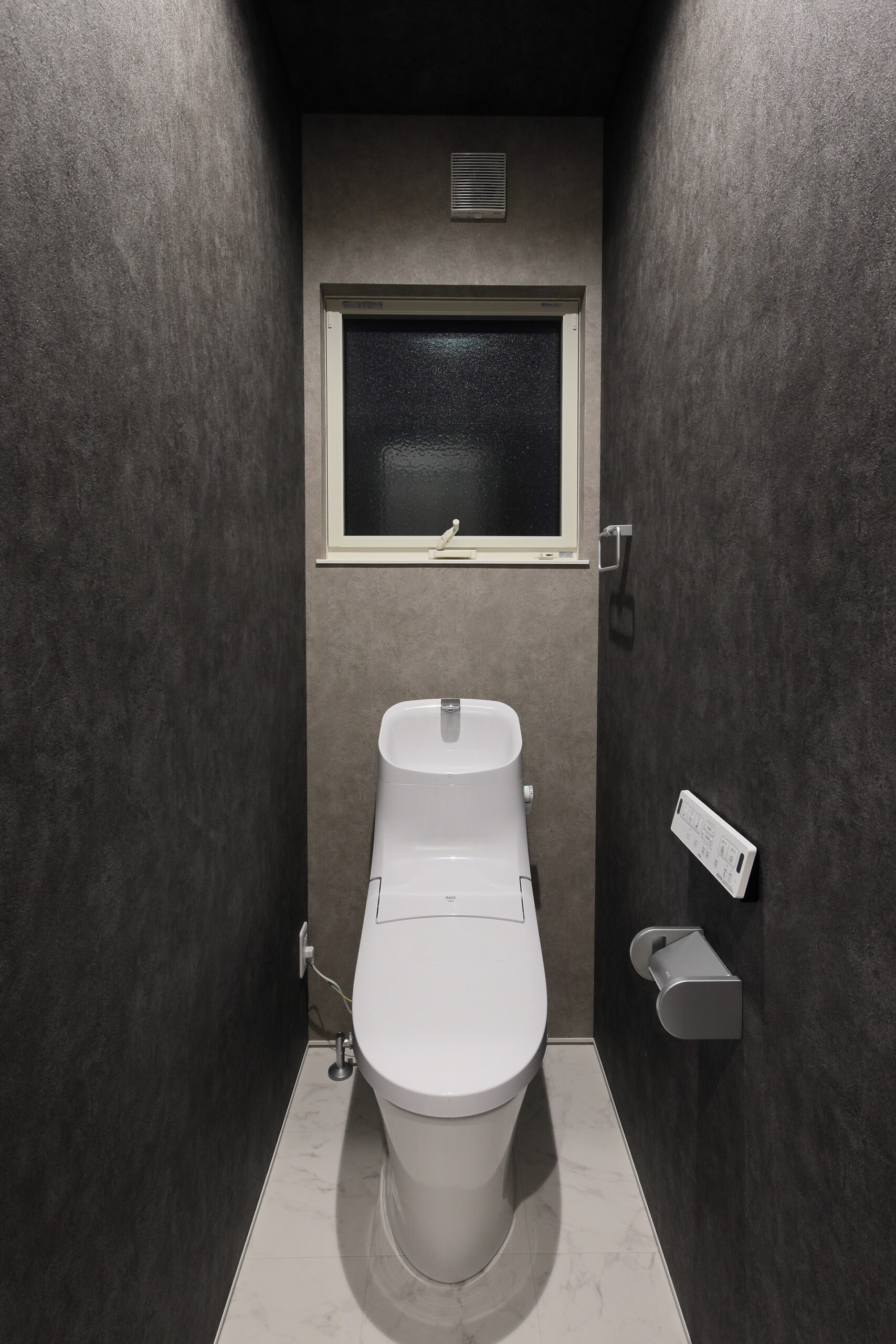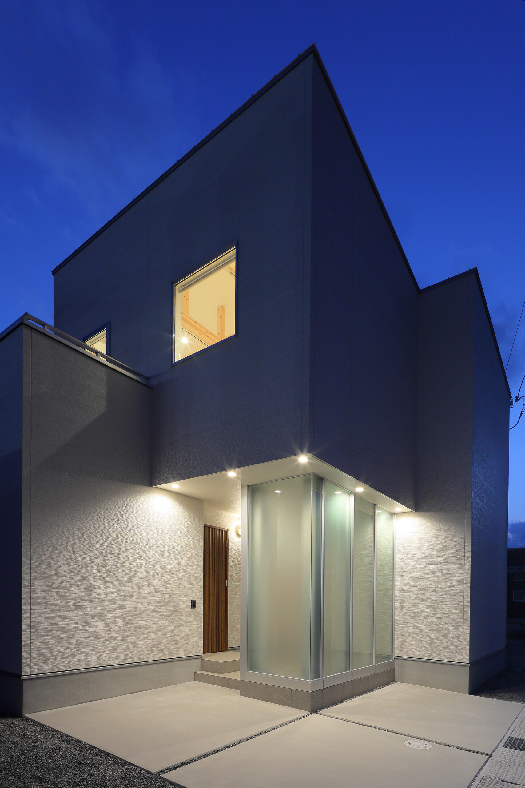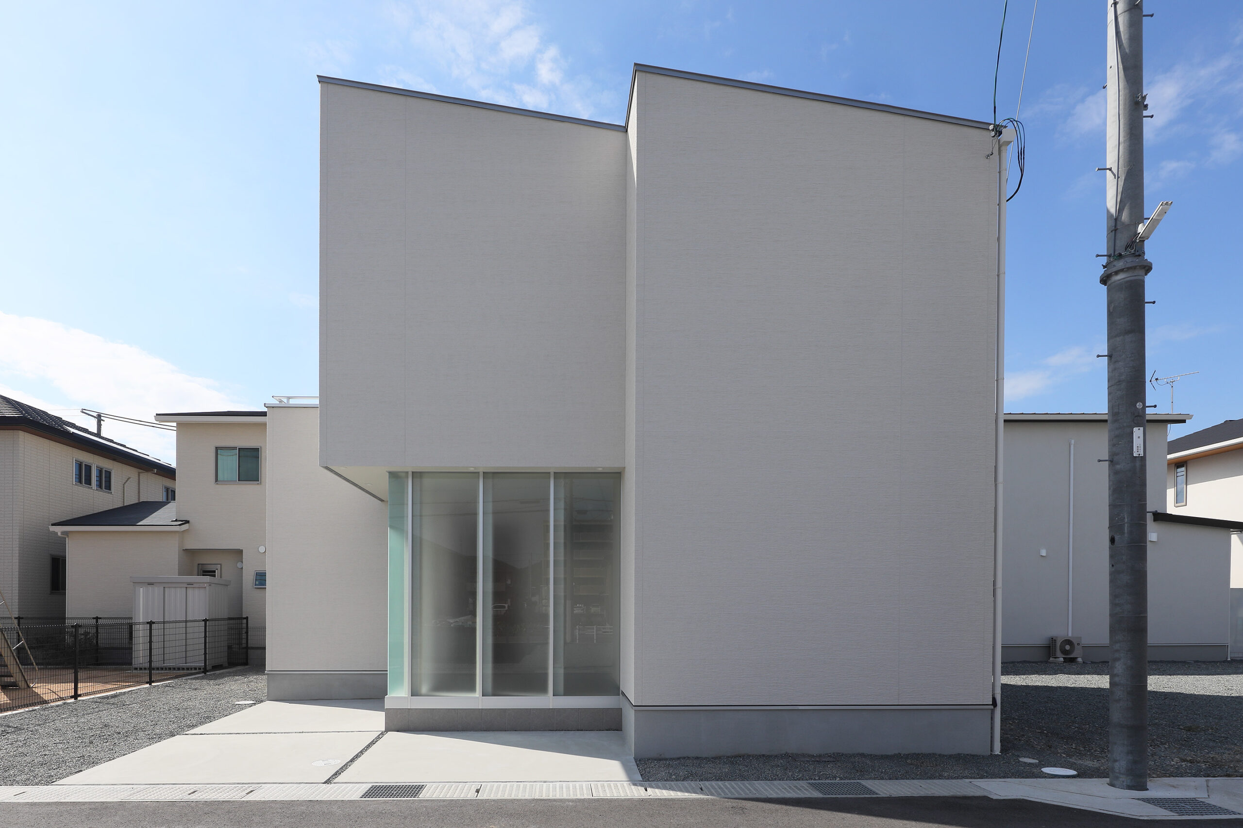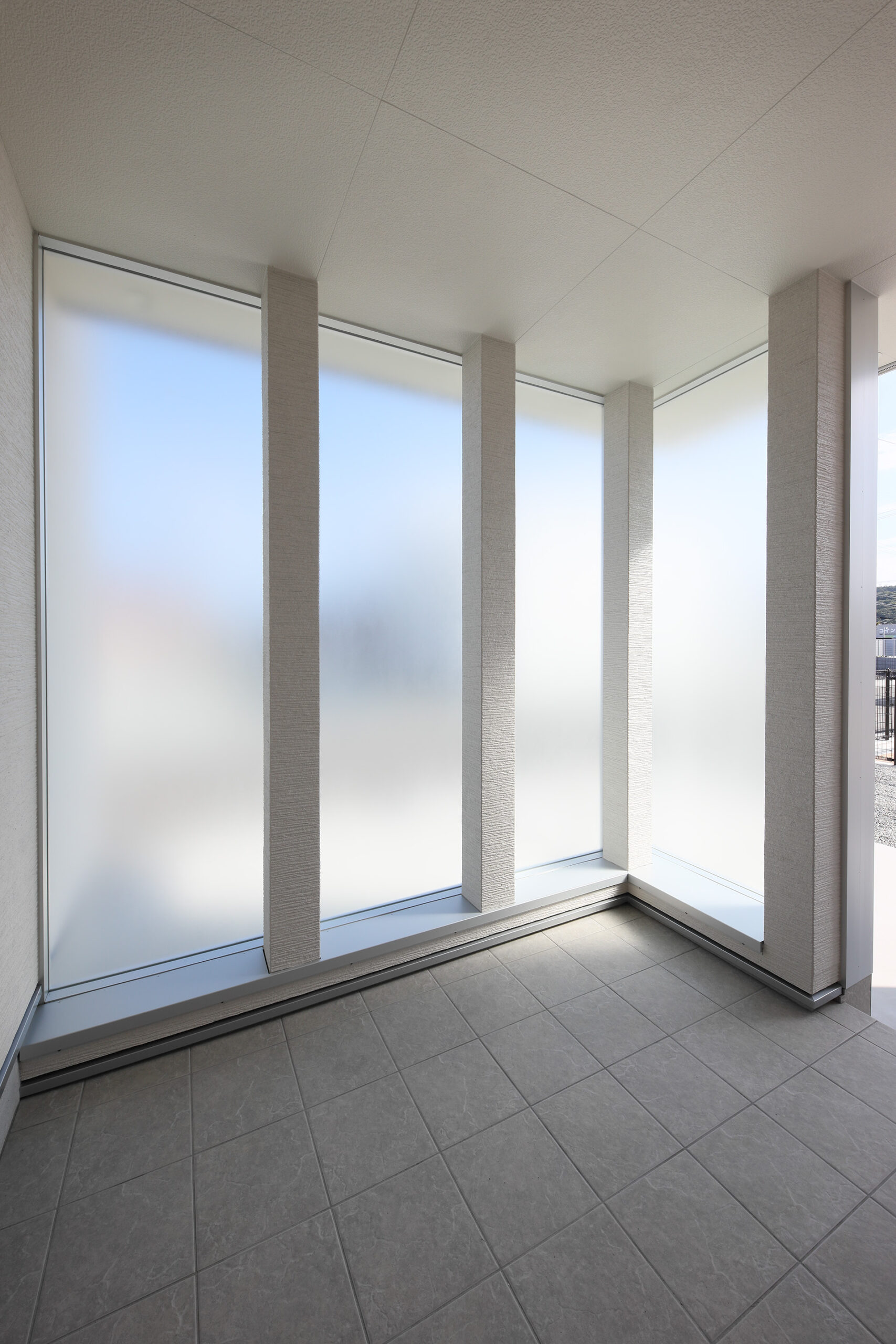 外壁は白一色ですっきりシンプルに。エントランスには大きなガラスを使い特徴的な外観となりました。ガラスの内側は、自転車やベビーカーなど 外で使うけれど雨ざらしにはしたくないものを置いたりするのにちょうどいい場所。すりガラスになるようなフィルムを貼って玄関から室内が丸見えにならないようプライバシーを守る役割も果たします。