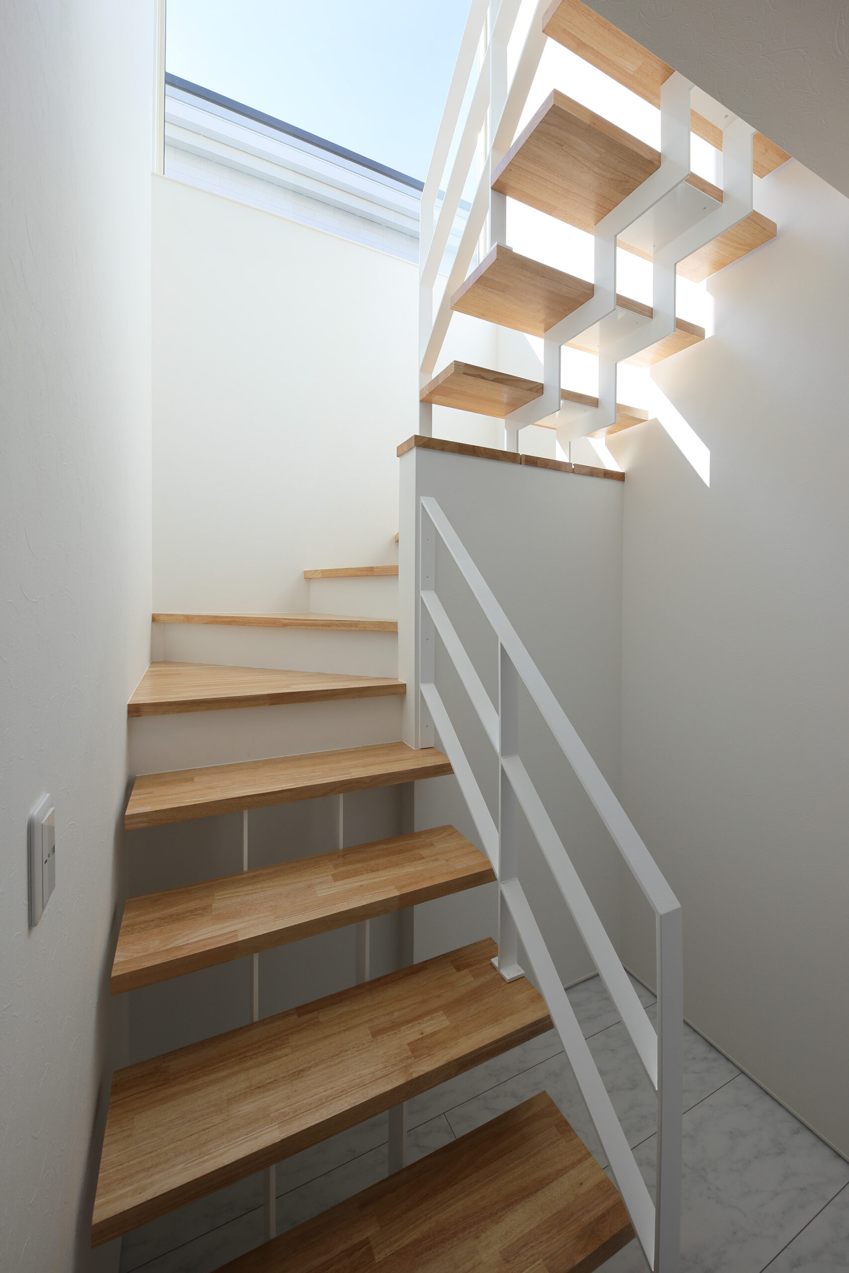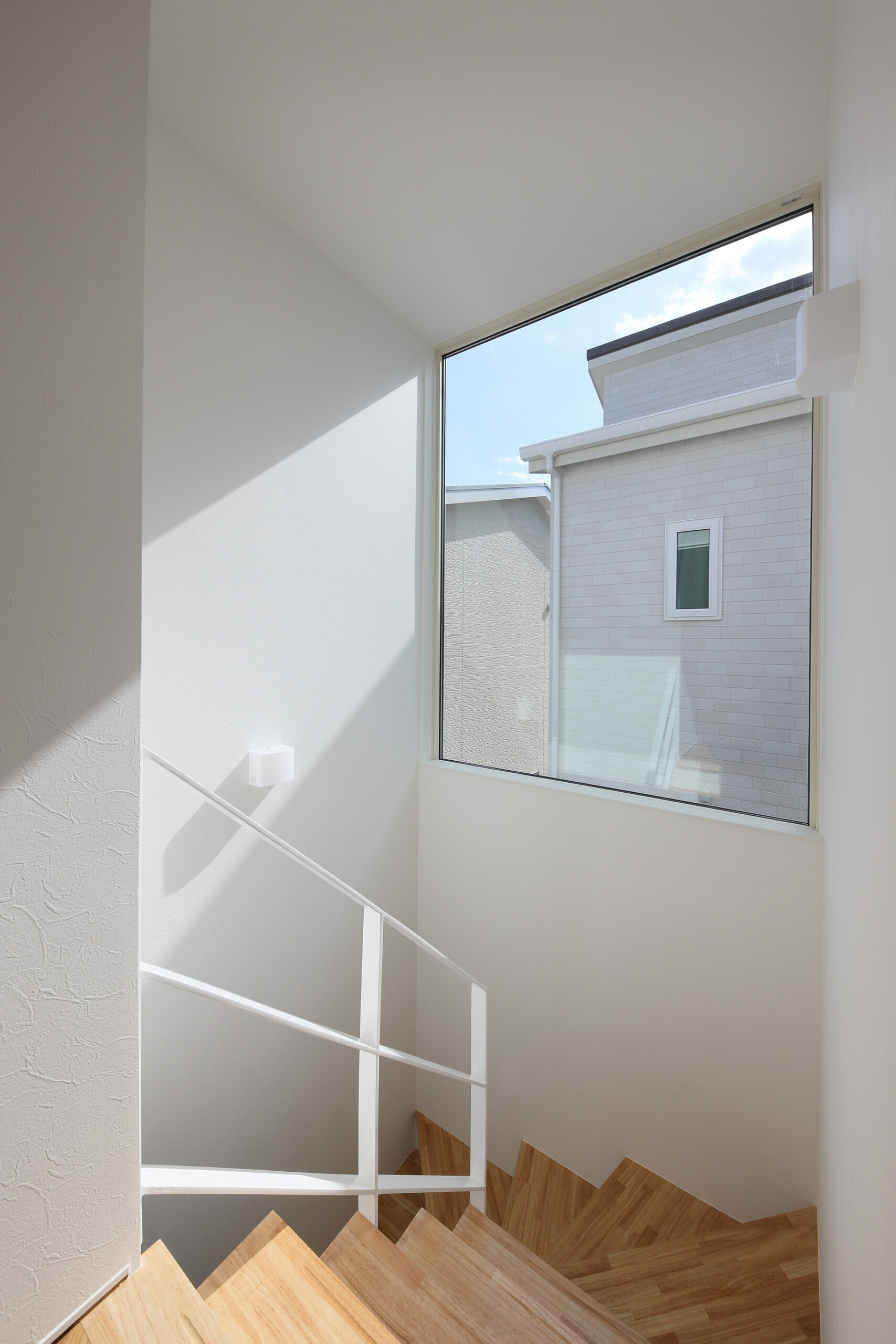 南側の建物の陰になってしまう1階部分にも光を取り込むため、南側の階段の吹き抜けにはかなり大きなFIX窓を配置しました。2階部分から降り注ぐ光で1階部分も明るくなります。