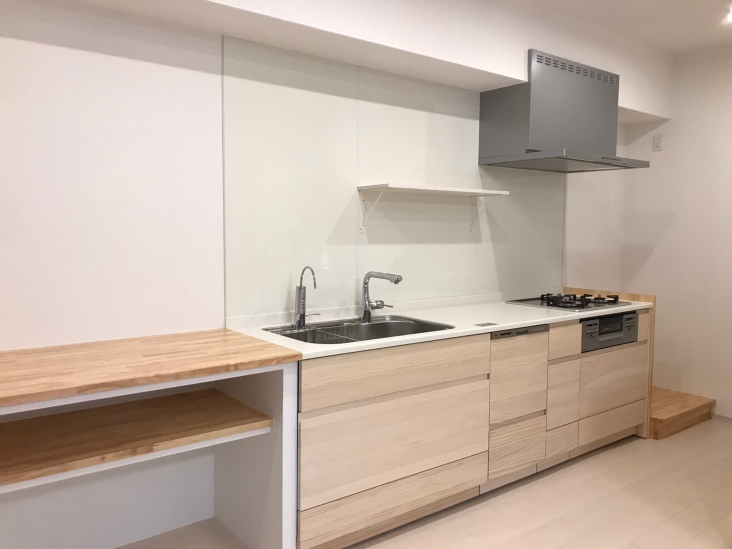 キッチンはウッドワンの無垢のキッチン『スイージー』をお選びいただきました。カップボードなども同シリーズで揃えて雰囲気もまとまっています。