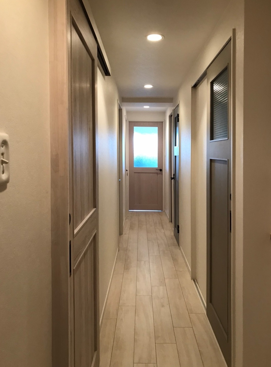個室やリビングの入り口の建具をお好きなテイストのものへ取り替え、クロスやフローリングも張り替えました。
