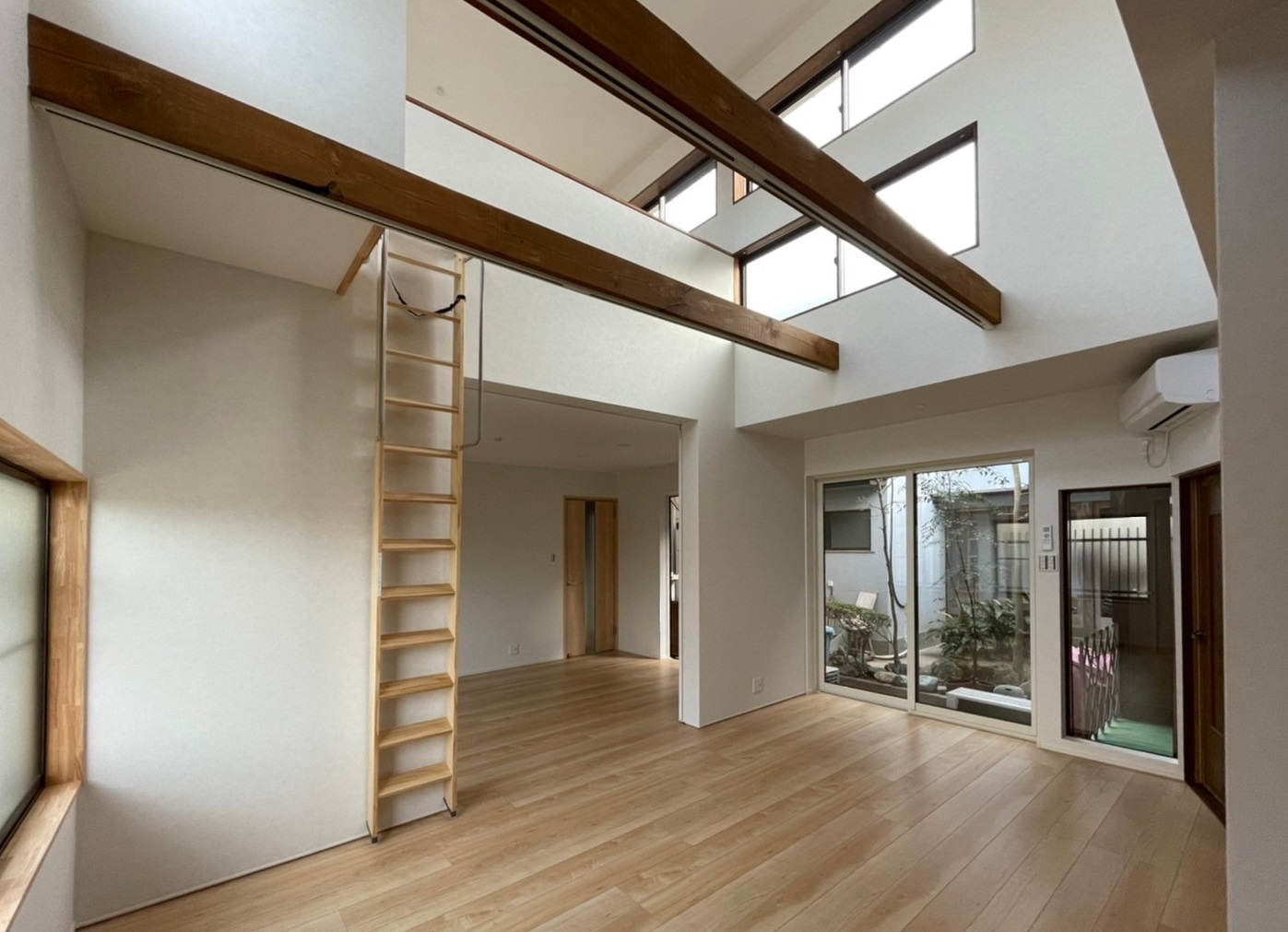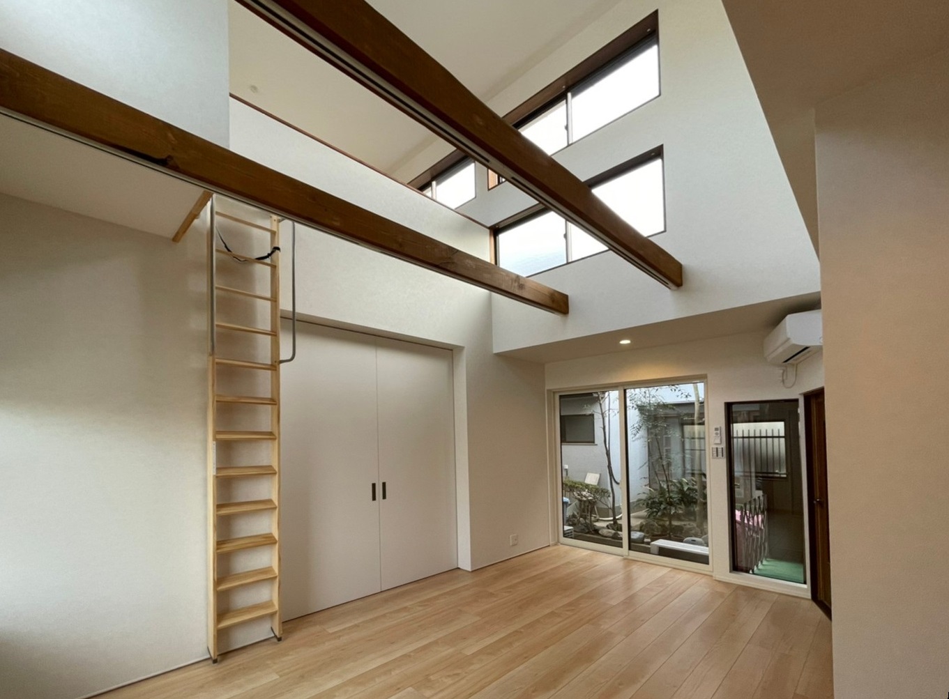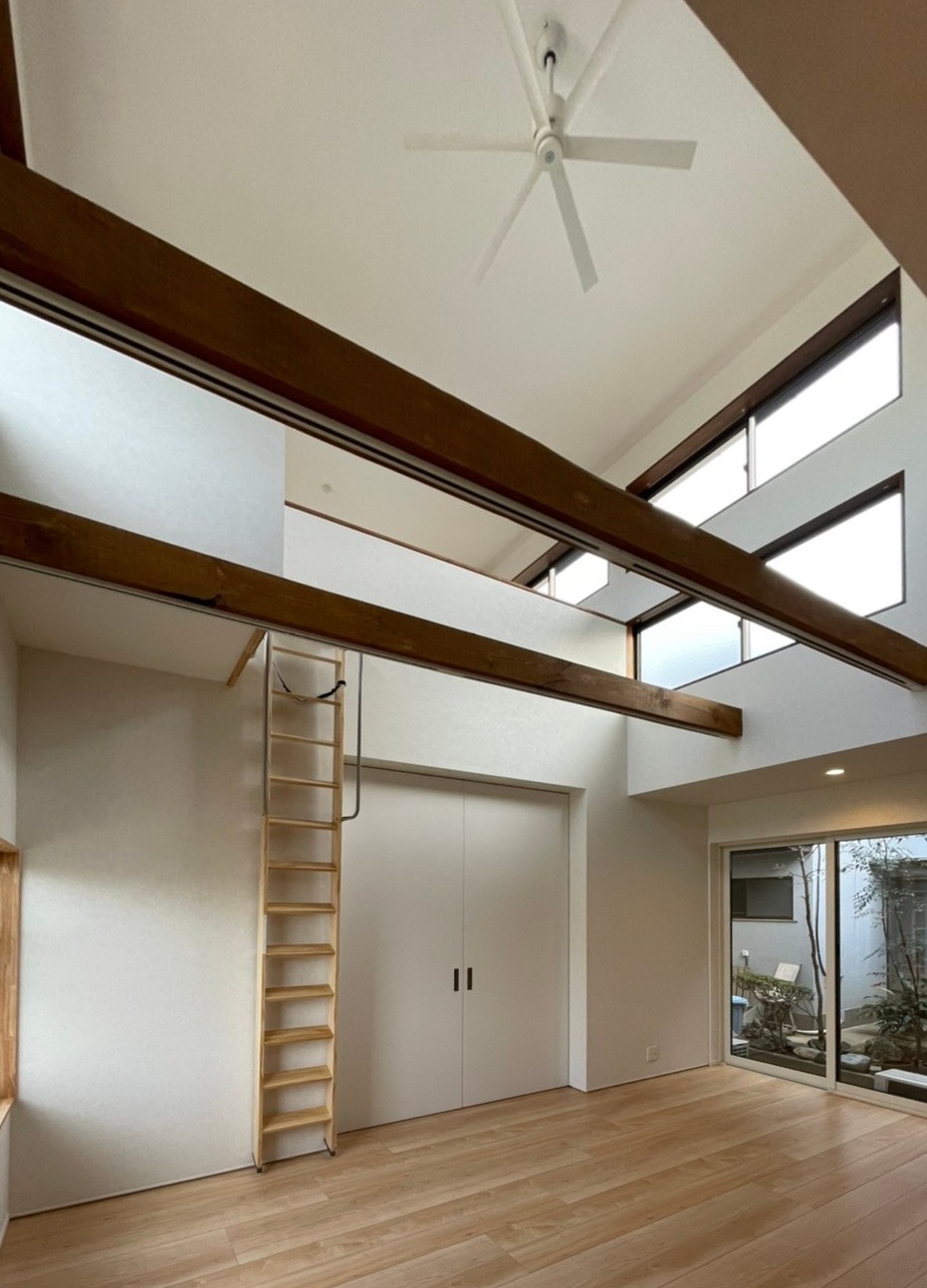 2階の1部屋は吹き抜けにして、階段もしくはハシゴで2階に上がれるメゾネット風の間取りになりました。