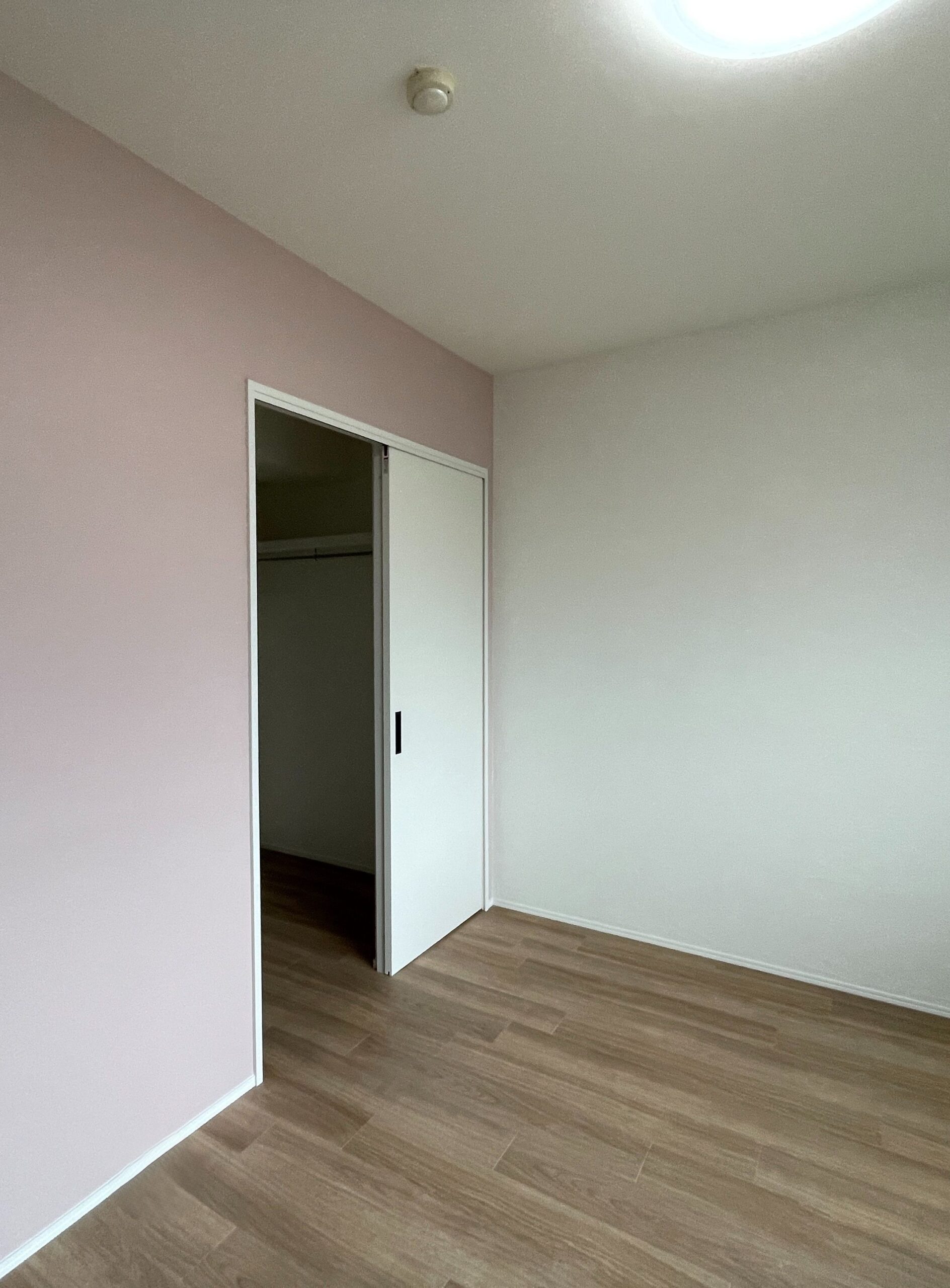 子供部屋はお子様のお好みどおりに やわらかいピンクの建具とアクセントクロスをつかいました。湿気がこもってカビが生えやすくなっていたので、一面だけクロスではなく漆喰仕上げにして調湿できるようにしました。子供部屋と寝室のあいだにファミリークローゼットを配置して双方向から出入りできるようにクローゼットを改修しました。