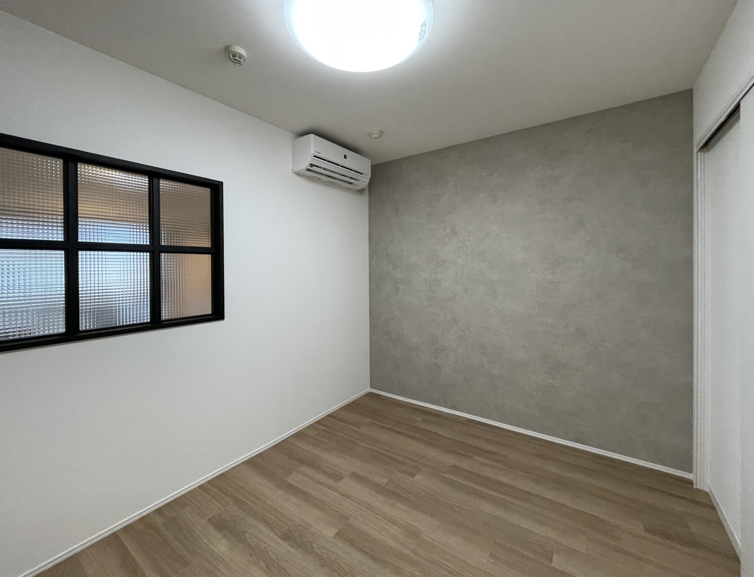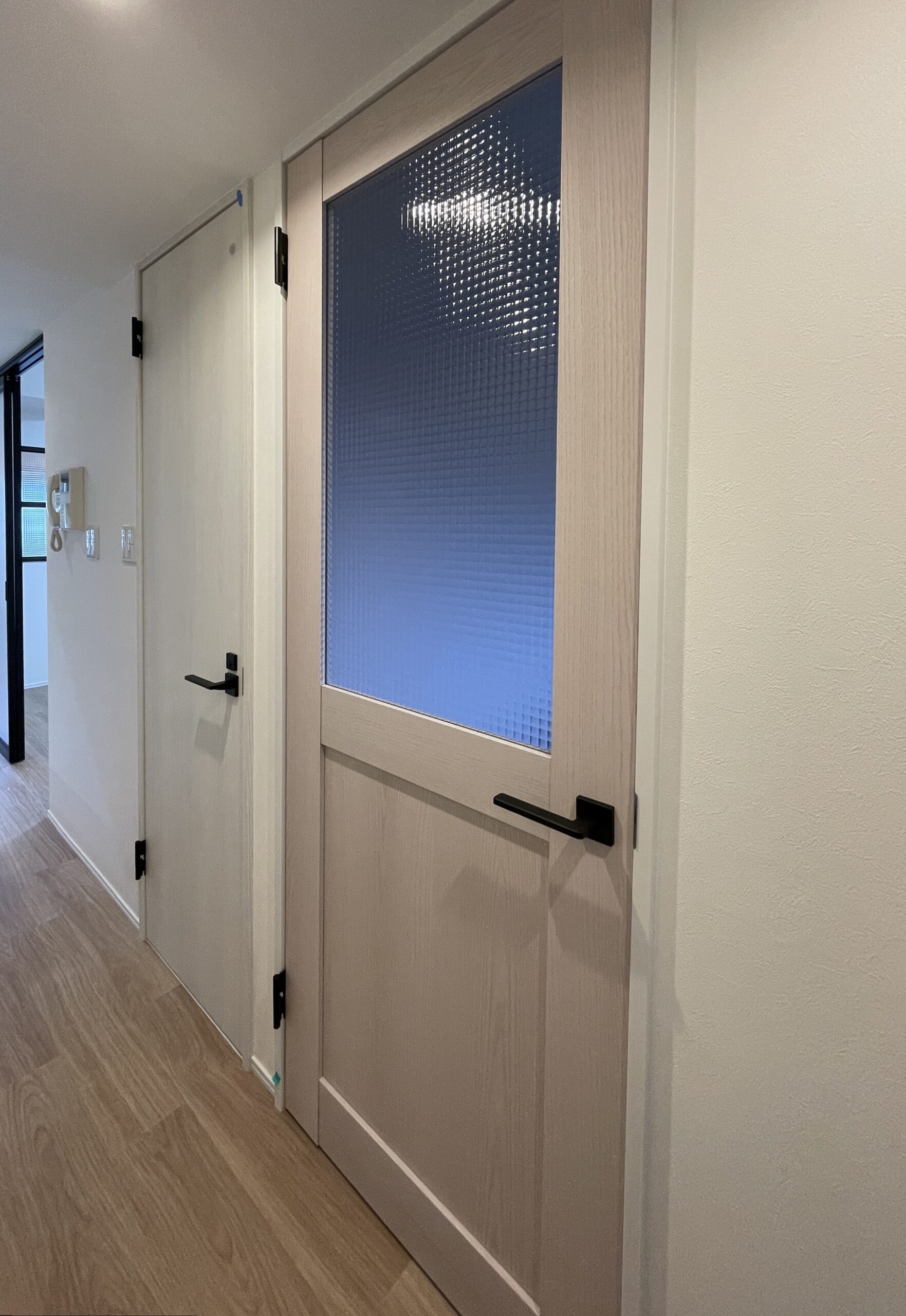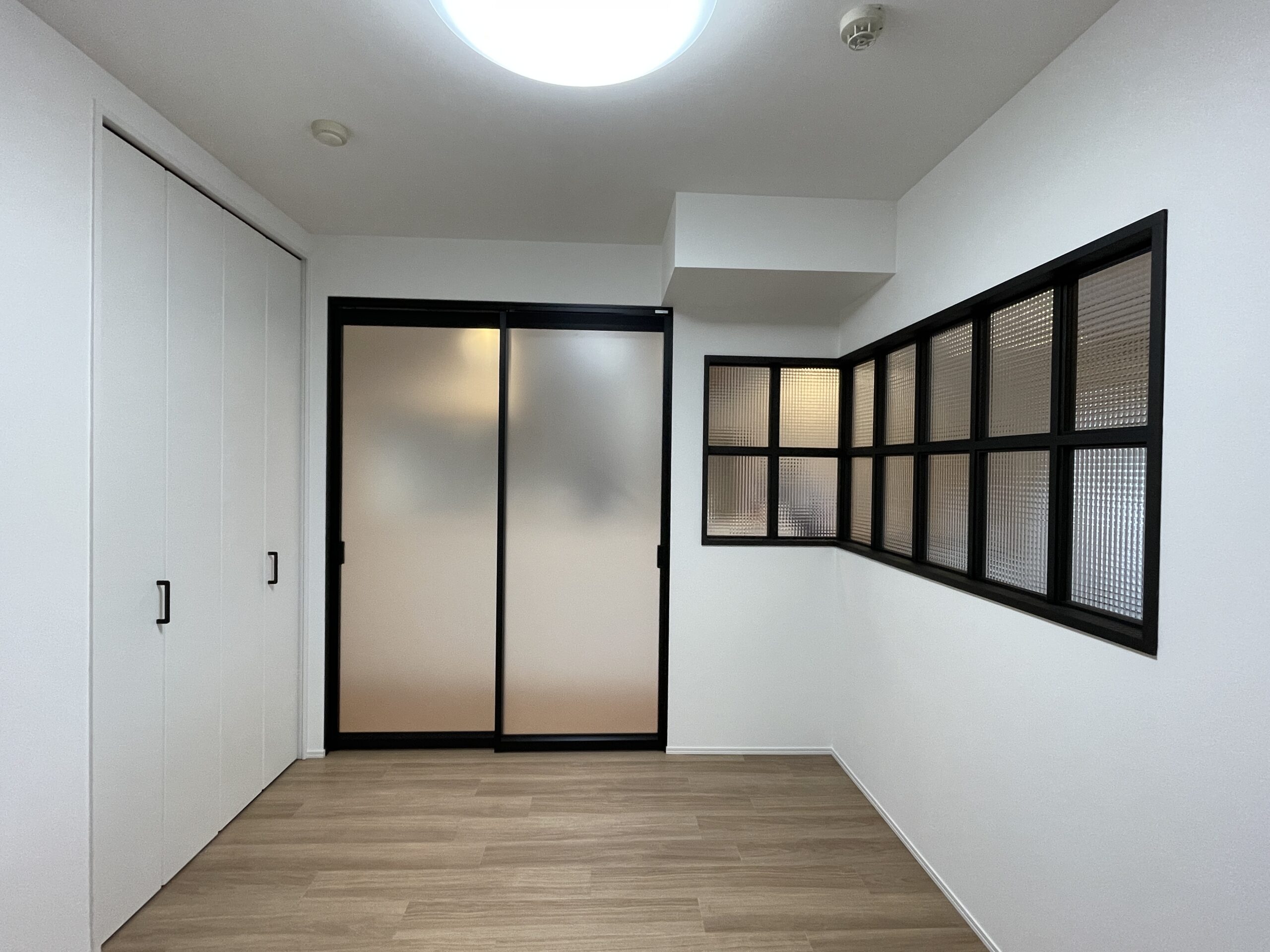 元和室の部分は外窓がなく暗くなりがちなお部屋だったため、今回室内窓をもうけてバルコニー側からの光を取り込めるようにプランニングしました。室内窓はチェッカーガラスをはめて枠を塗装し、造作にておつくりしました。寝室の建具はすっきりとしたデザインの三協アルミの『アミス』をつかって、光を取り込みつつ、スタイリッシュでおしゃれ感をUPしました。