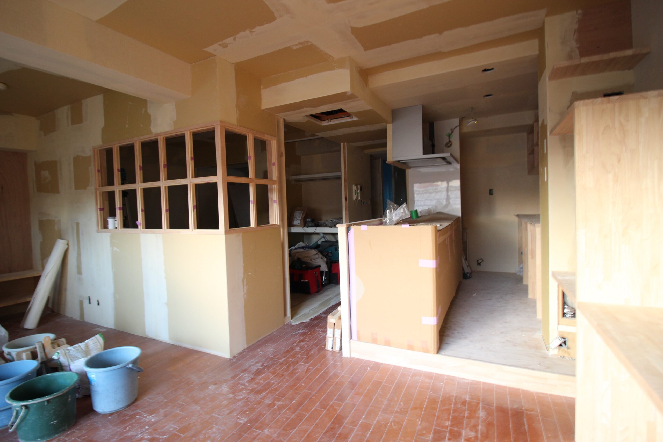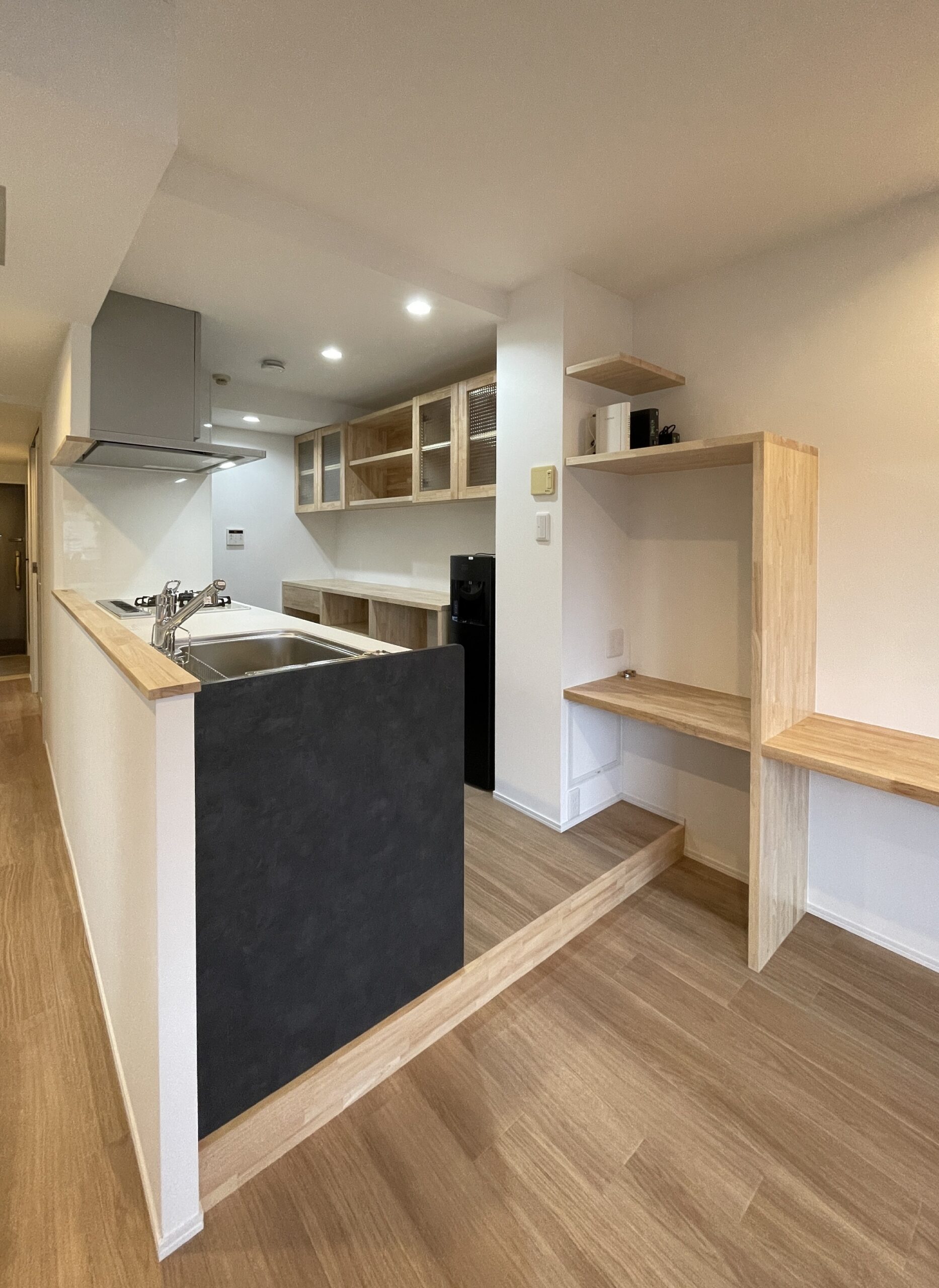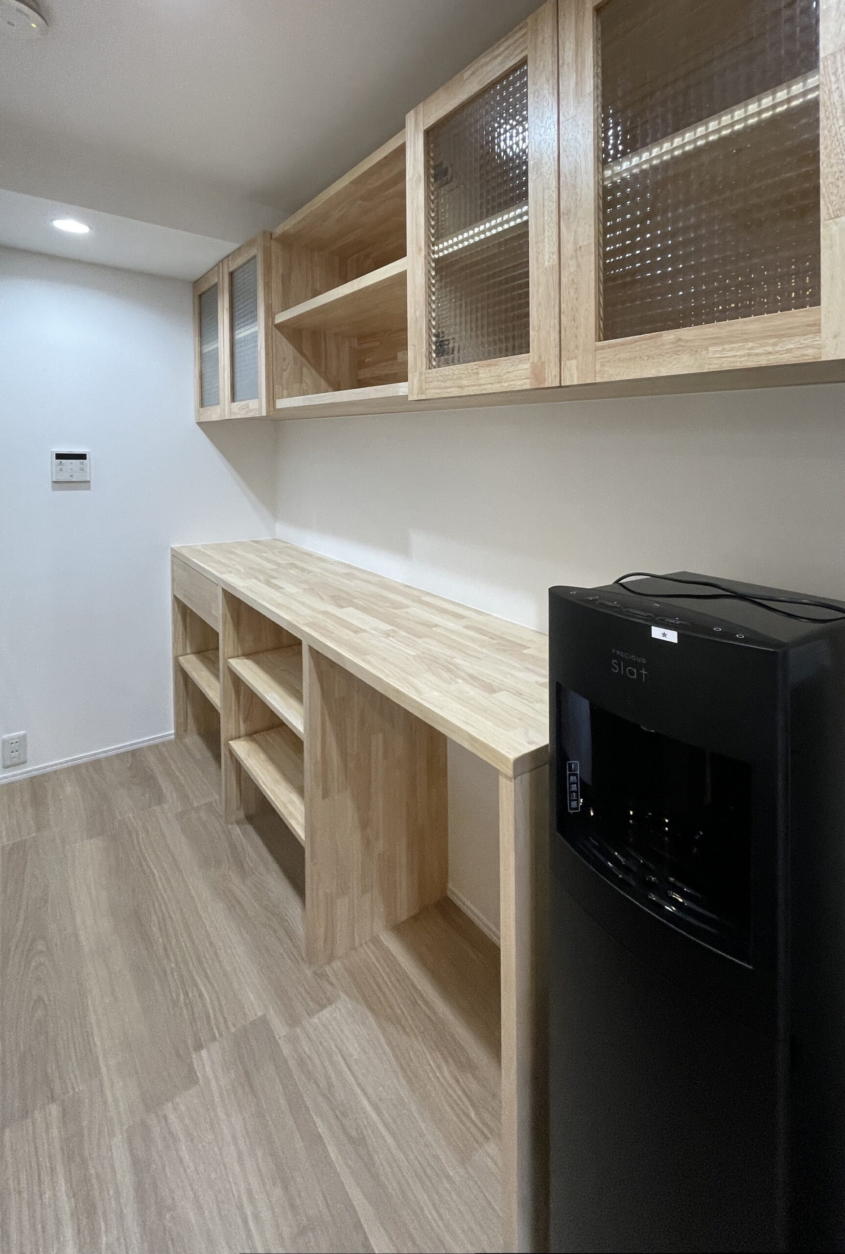 当初の予定ではキッチンは工事範囲に含まない予定でしたが、あとで個別に工事をするよりも工期短縮できたり空間の統一感を出せるメリットがあり、せっかくなので一緒にキッチン改修も行うことになりました。もとのキッチンはL型で垂れ壁があり、どうしても閉鎖的で暗くなってしまいがちでしたが、新しいキッチンはI型に変更して垂れ壁も取り払い、オープンで開放的なキッチンへと生まれ変わりました。キッチンの収納は、お使いのウォーターサーバーやお手持ちのグッズに合わせて、チェッカーガラスをつかって造作させていただきました。横並びダイニングで配膳もらくらく、家族間のコミュニケーションも取りやすくなります。