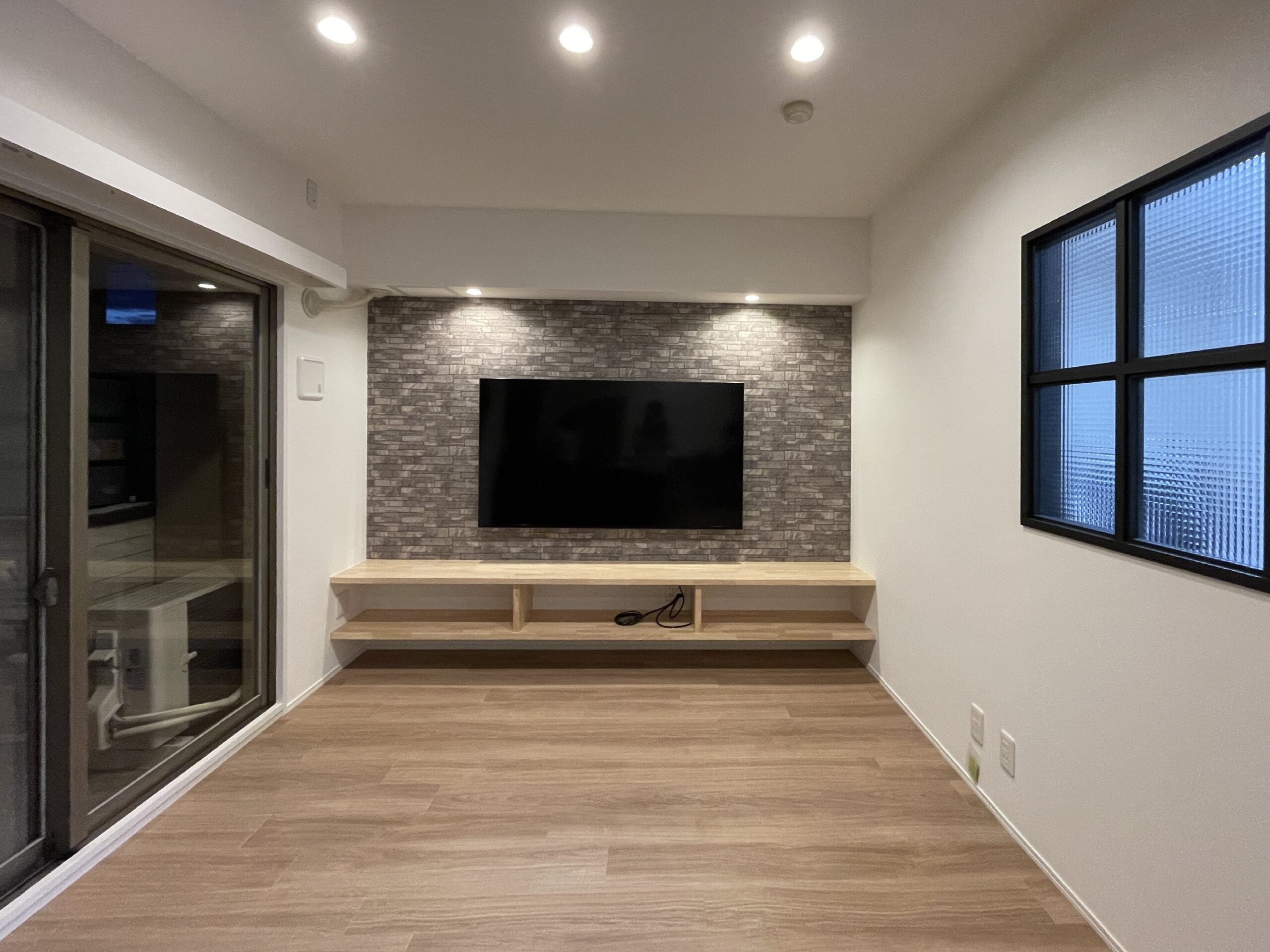 リビング側の雰囲気も室内窓がアクセントとなり、おしゃれな雰囲気に仕上がりました。テレビボードは造作し、レンガ調のアクセントクロスを施したうえからテレビを壁掛けにしてすっきりとさせています。