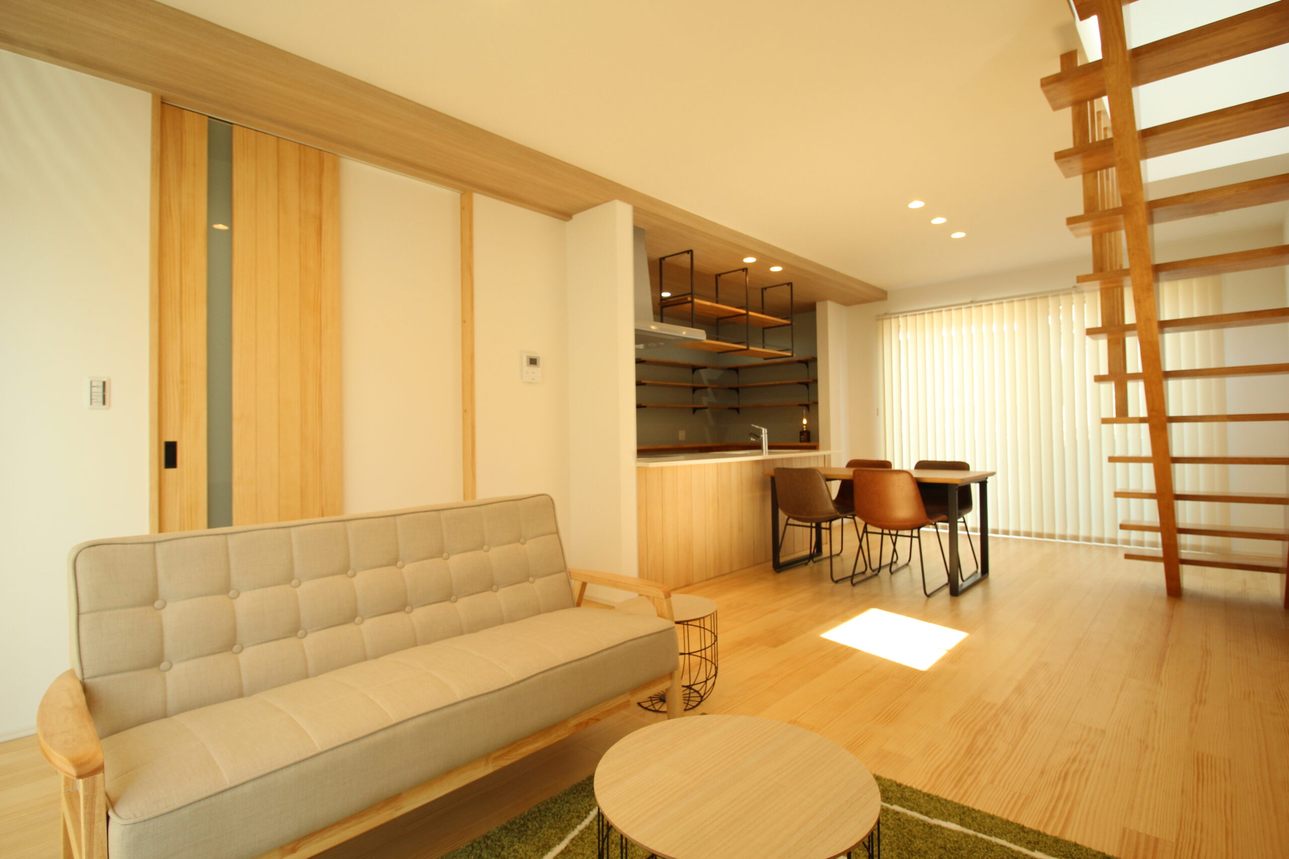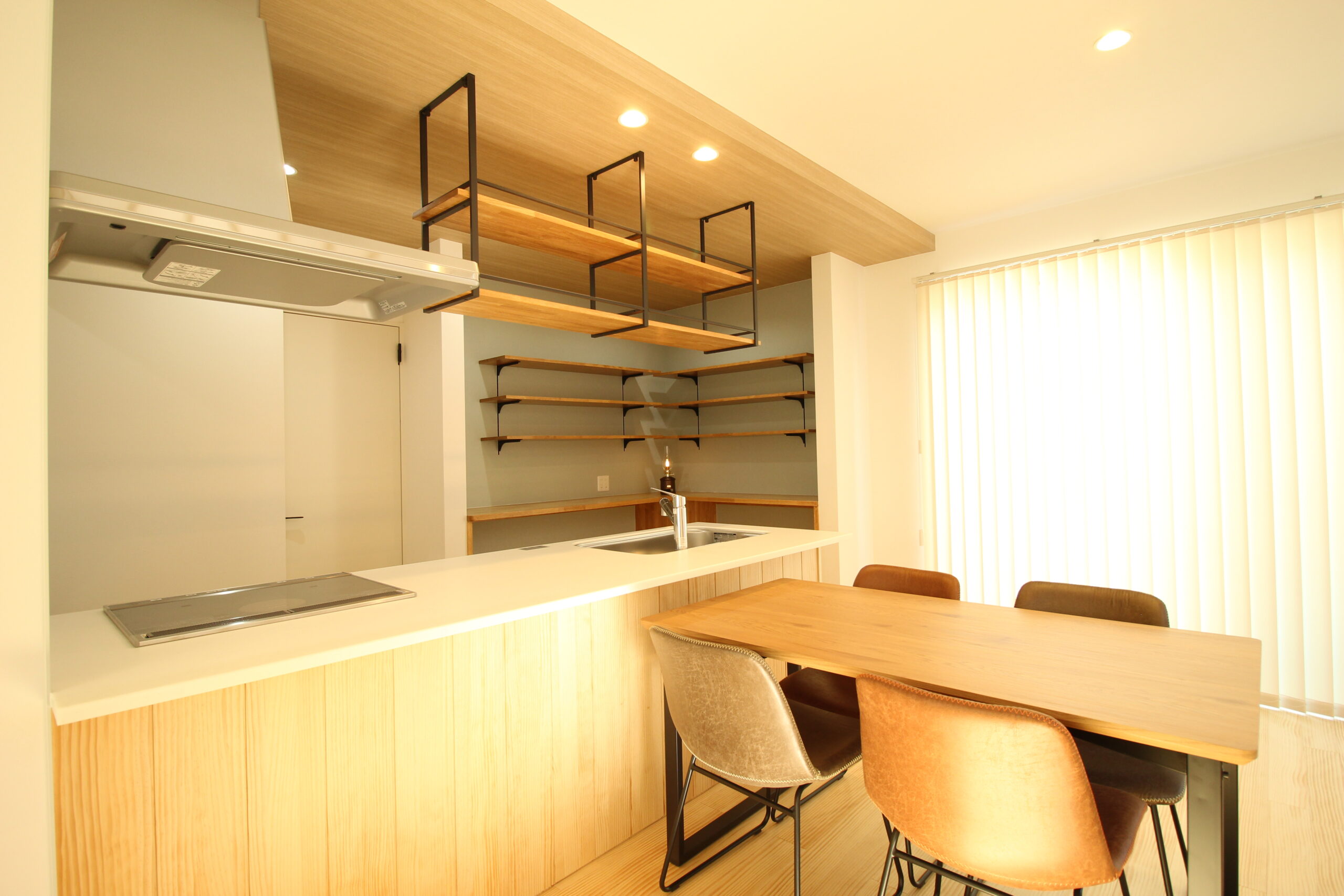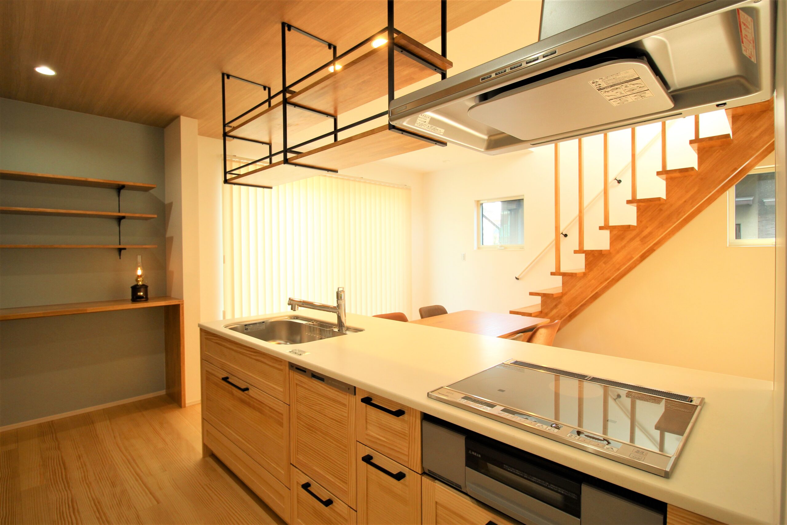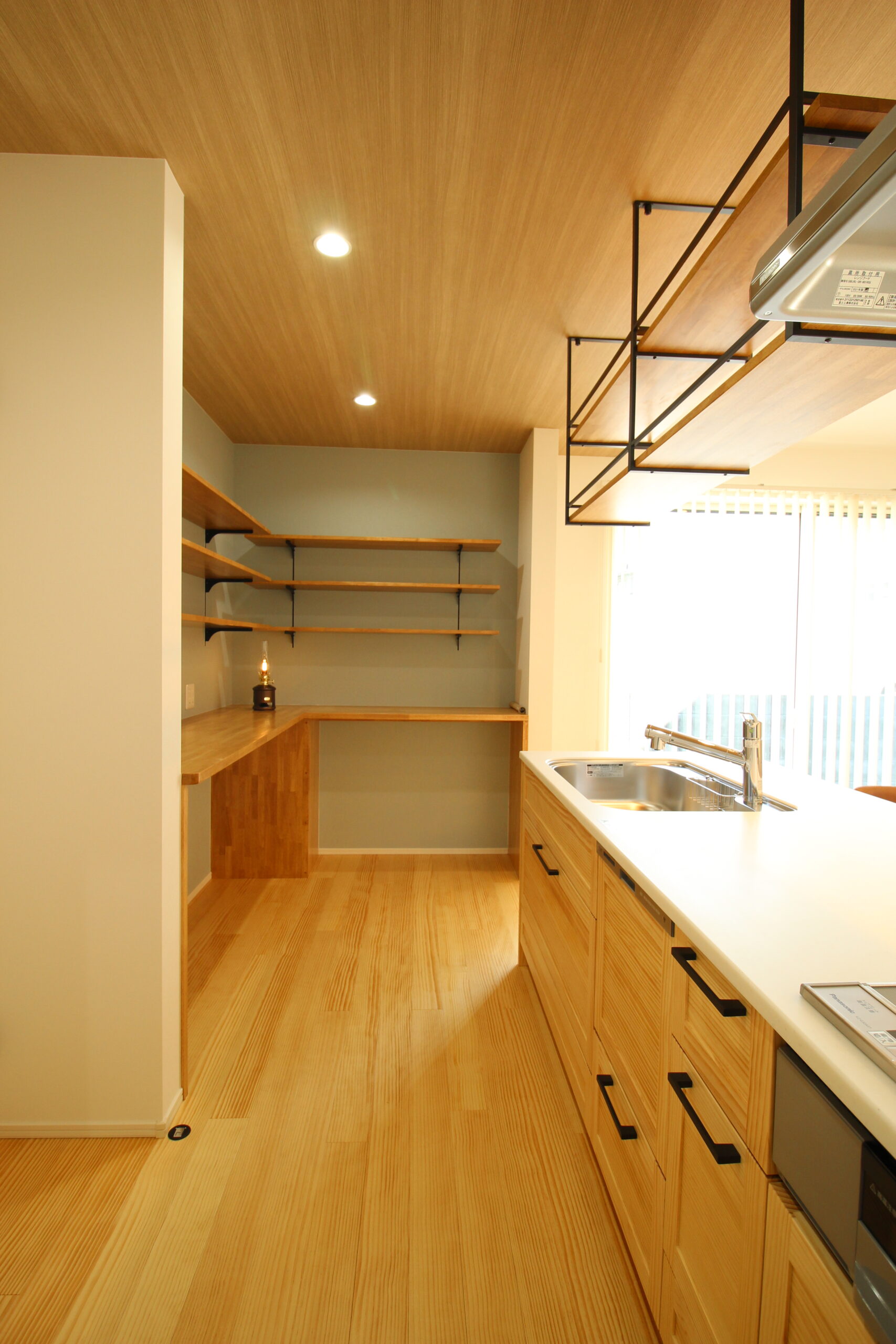 無垢材のフローリング、無垢材のキッチン、無垢材の建具、無垢材の収納棚まで、無垢材をたっぷり使ったナチュラルなおうちになっています。無垢材ならではの 気持ちよい肌触り、木肌の美しさと風合い、そしてあたたかみを感じながら過ごしていただけます。