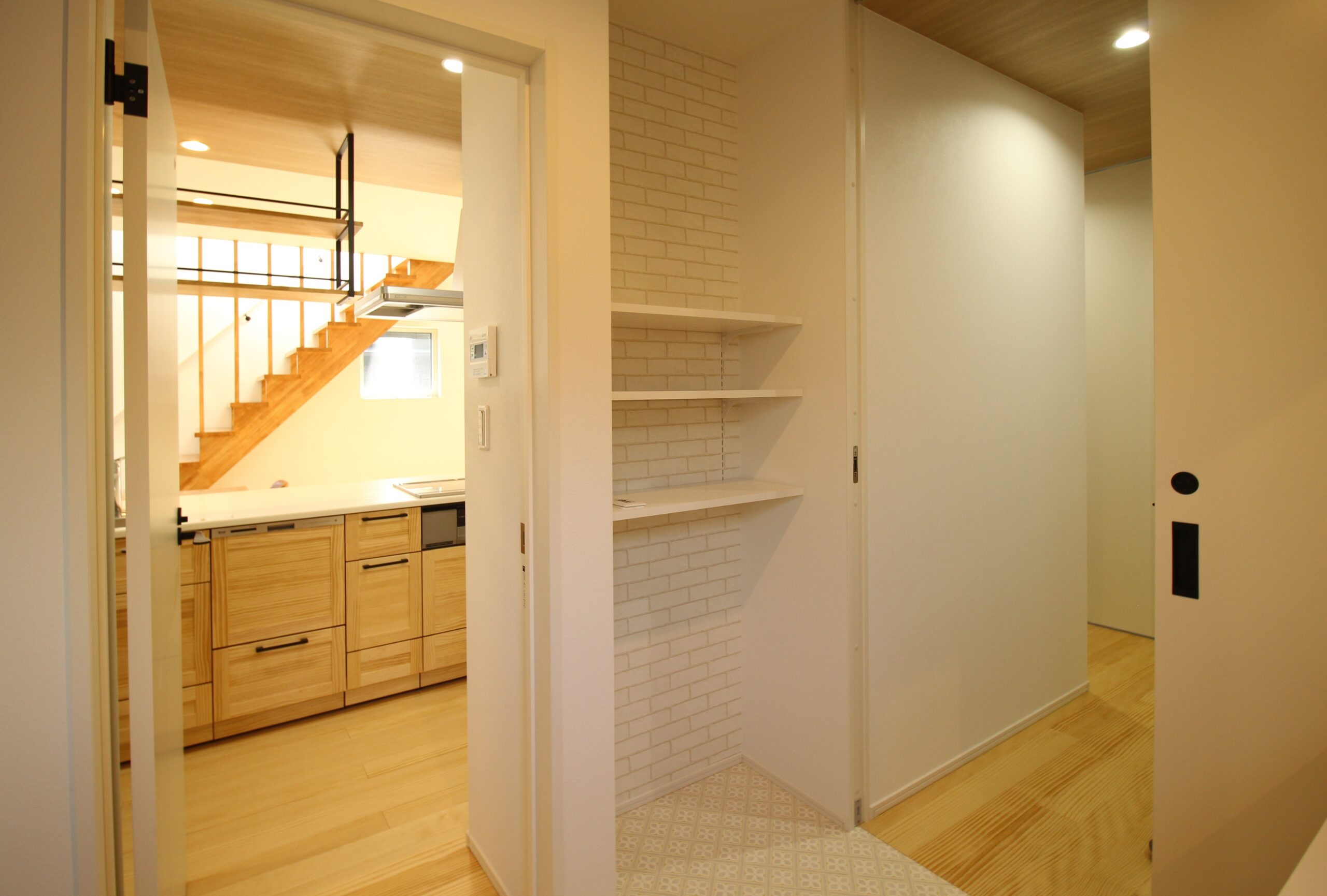 玄関からリビング、パントリーを通ってキッチン、洗面室を通ってキッチンといった 複数のルートで移動ができる回遊動線になっています。無駄な動きが少なくストレスフリー、家事もはかどります。玄関を入ってすぐ脇が洗面室になっているので、帰宅後すぐ手洗いできるのも嬉しいポイントです。