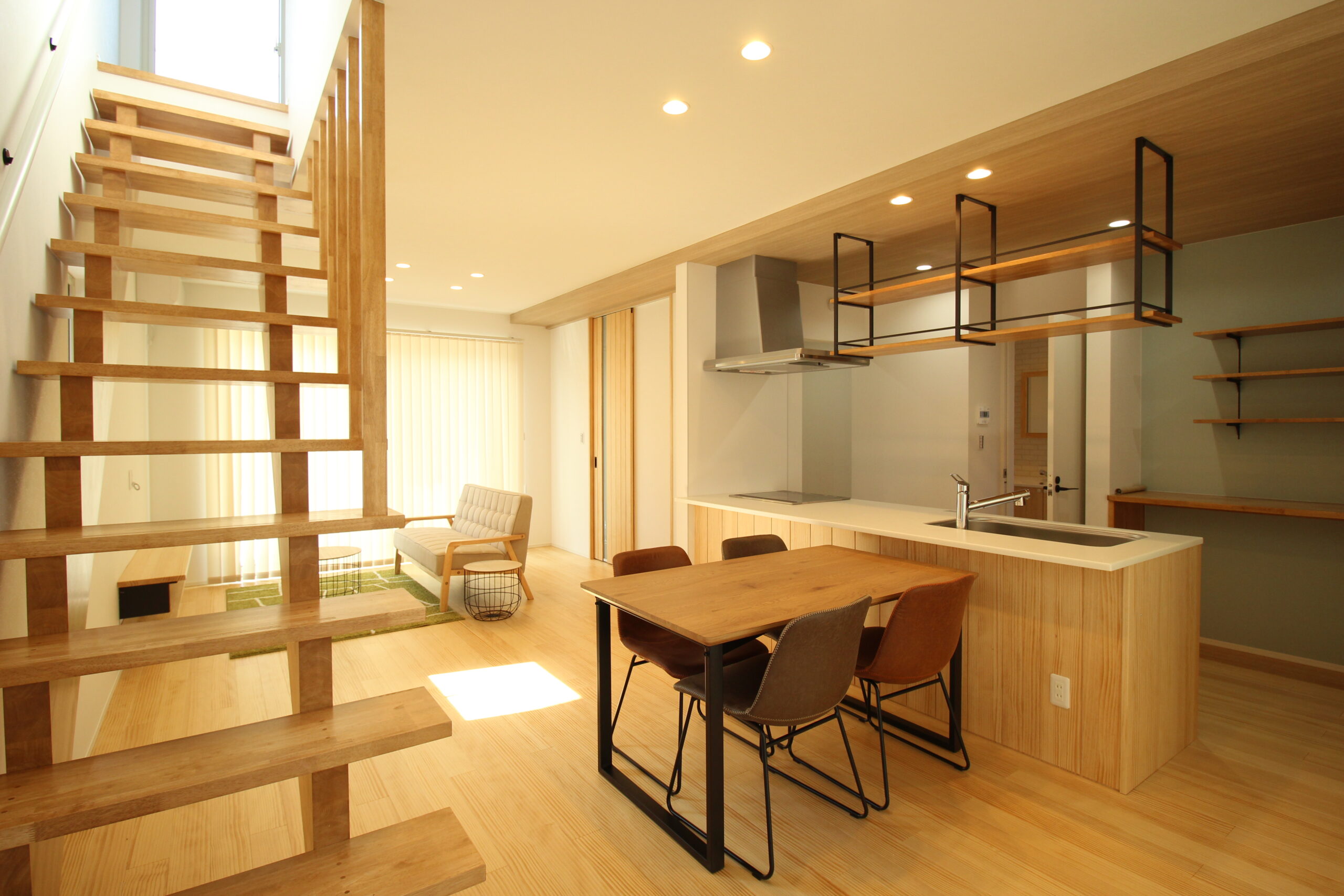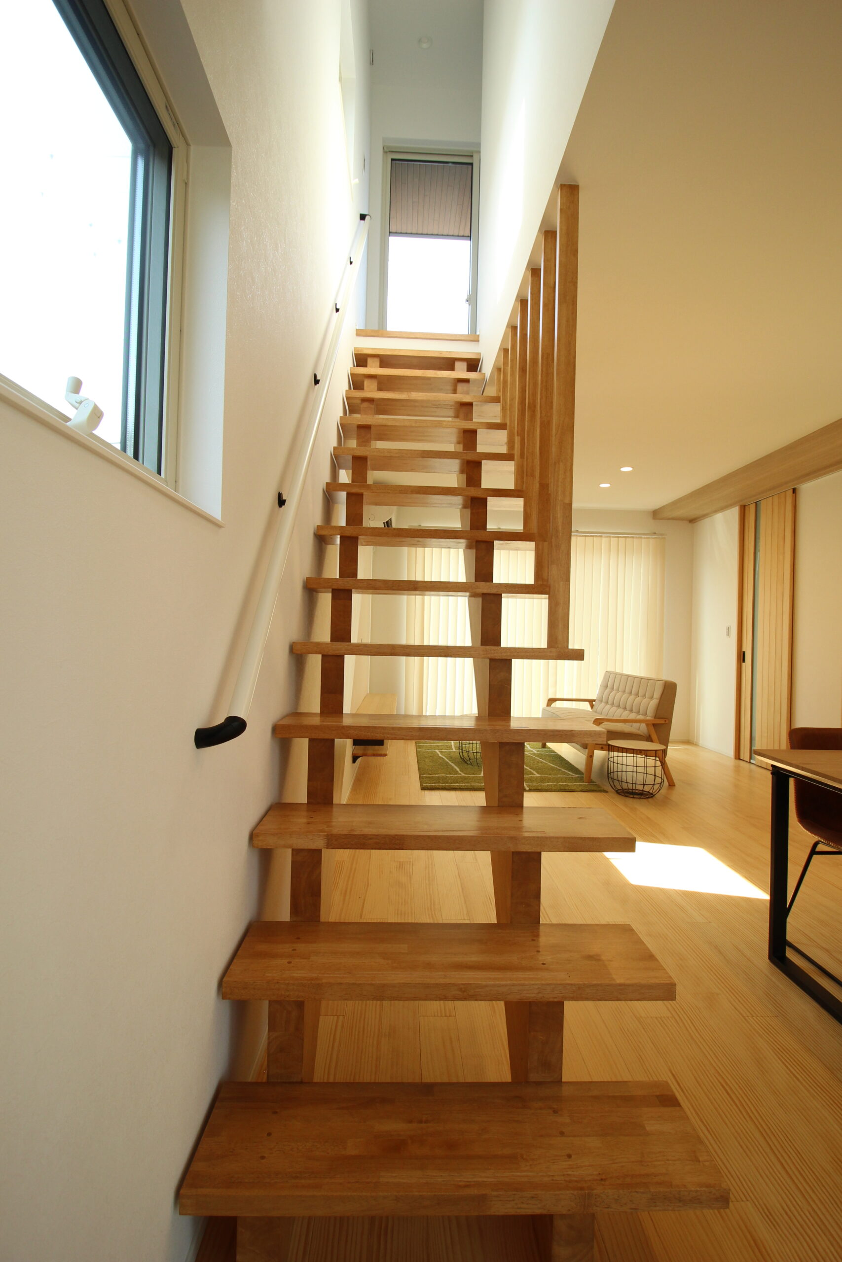 階段は、デザイン性が高くお部屋のアクセントにもなるストリップ階段を採用。階段下にも空間が広がっていて目線も抜けるので光を取り込みやすく、閉塞感が出ずリビング空間に溶け込みます。最大限にスペースを有効活用できるストリップ階段のおかげで、コンパクトなおうちながらも 室内を予想以上に広く感じさせることができます。