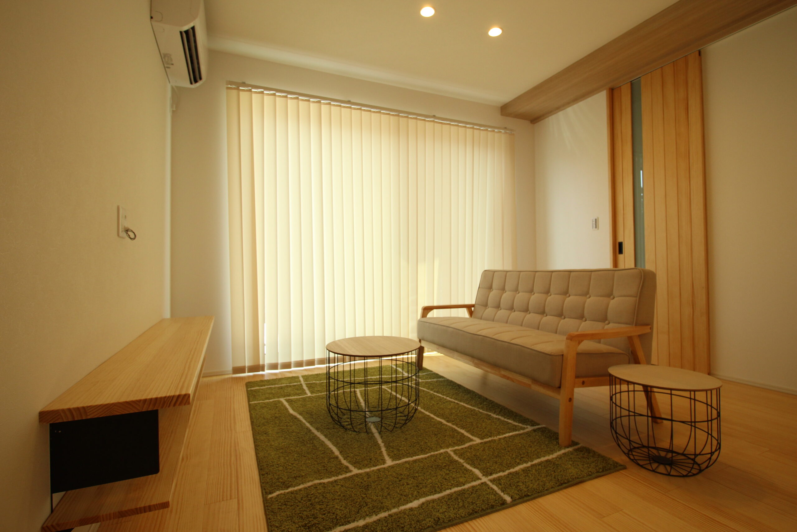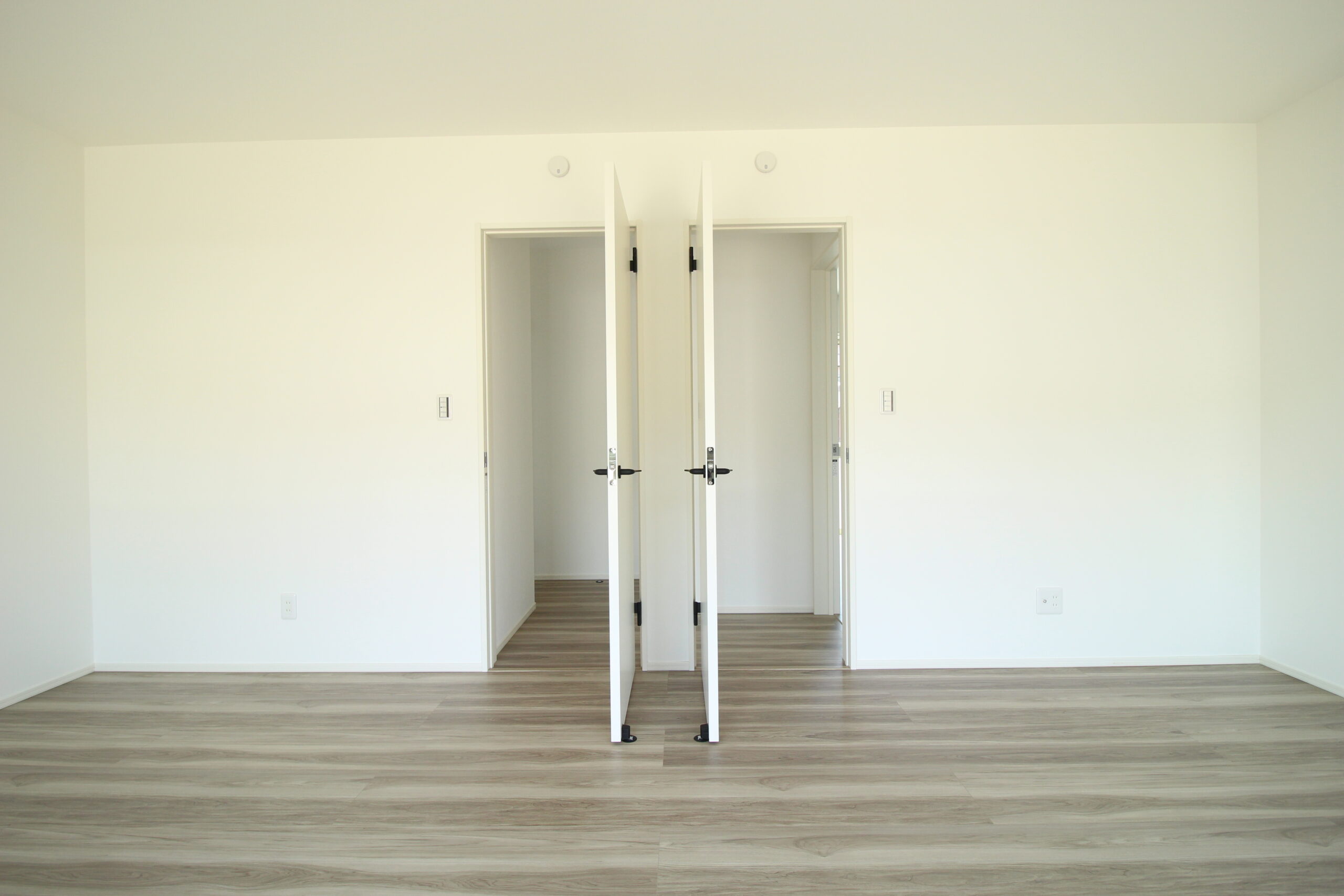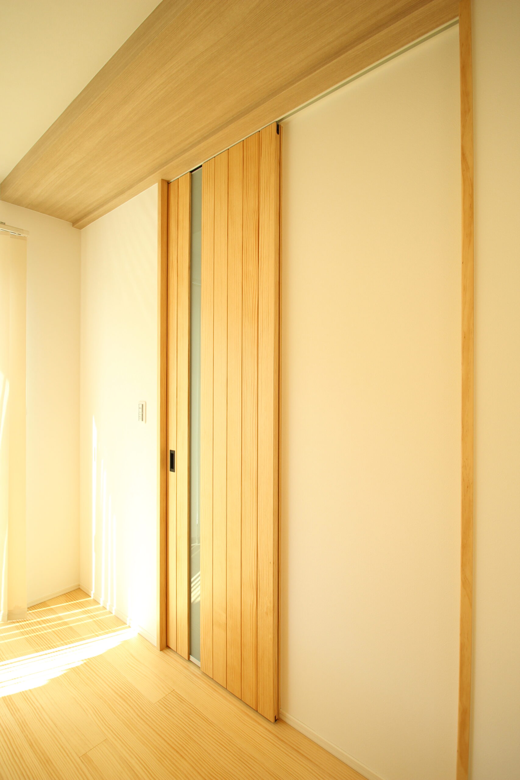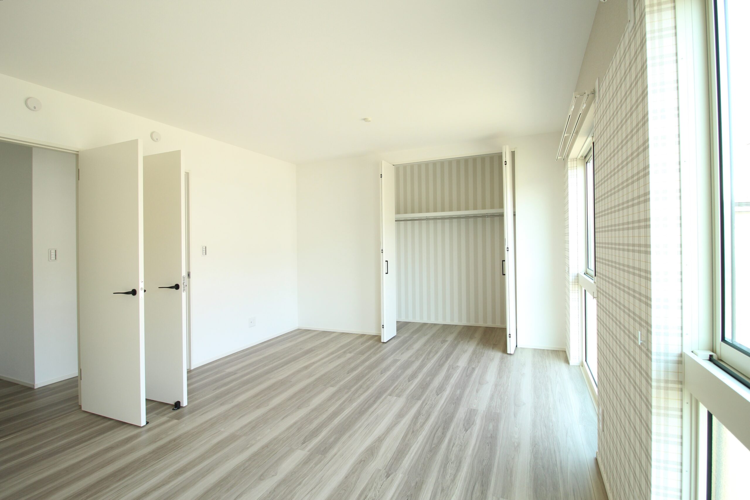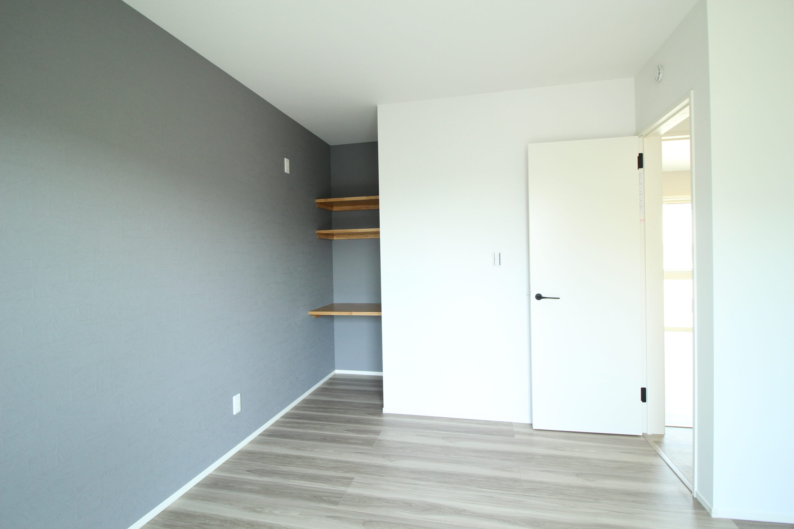 2階の広々とした12畳ほどの洋室は、将来的には間仕切って2部屋にできるようになっています。お子様が小さいあいだは、家族みんなで川の字になって寝られたり走り回れる遊び場として広々と使い、個室が必要になったら間仕切り壁をつくって2部屋に分けることができる フレキシブルタイプです。あらかじめ廊下に向けて扉を2つ 設けてあります。シンプルなお部屋ですが、クローゼット内やお部屋の1面のみ 柄もののクロスをアクセントで貼ってかわいらしい雰囲気になっています。