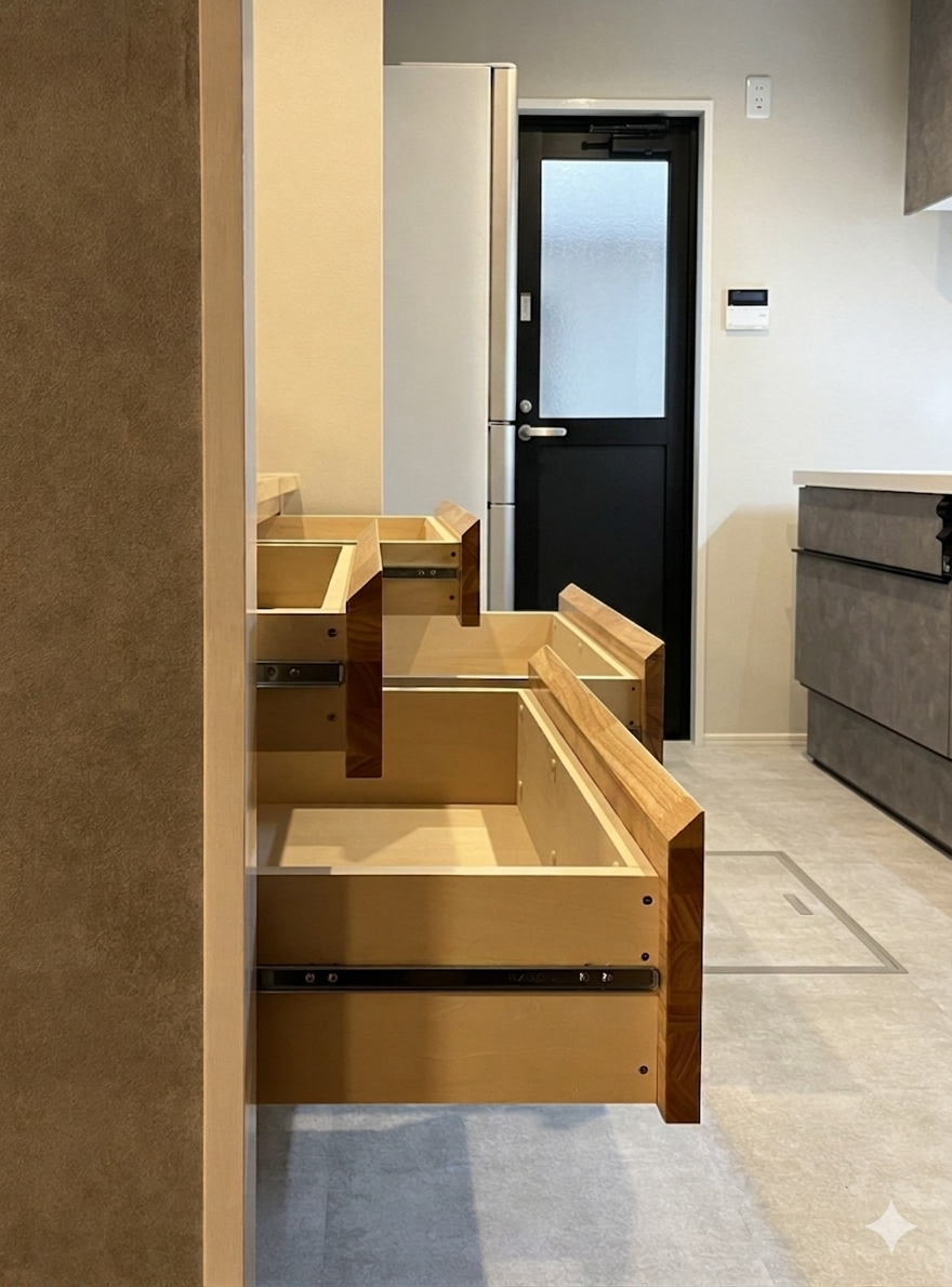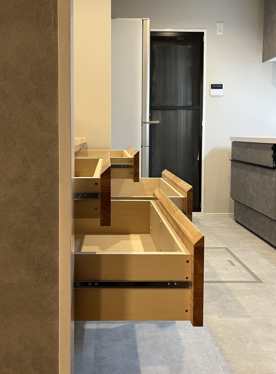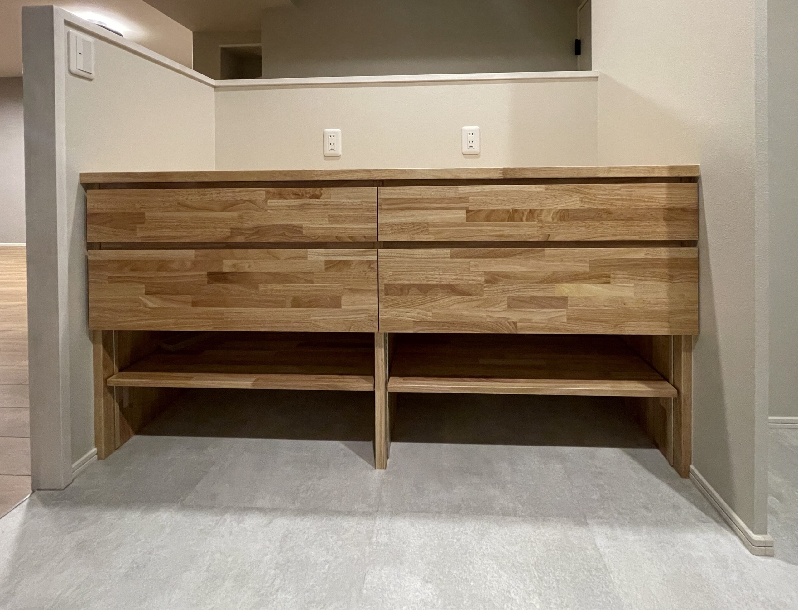 キッチンはもともと対面キッチンでしたが、家電や食器棚の配置が使いにくかったり、動きづらくてせっかくのダイニングスペースも活用できていなかったそうです。今回のリフォームで、キッチンはダイニングと横並びに配置して動きやすく、また垂れ壁を取ることで少しオープンに開放感を出せるようにしました。家電を置く引き出しつきの収納も使い勝手にあわせて造作でおつくりさせていただきました。