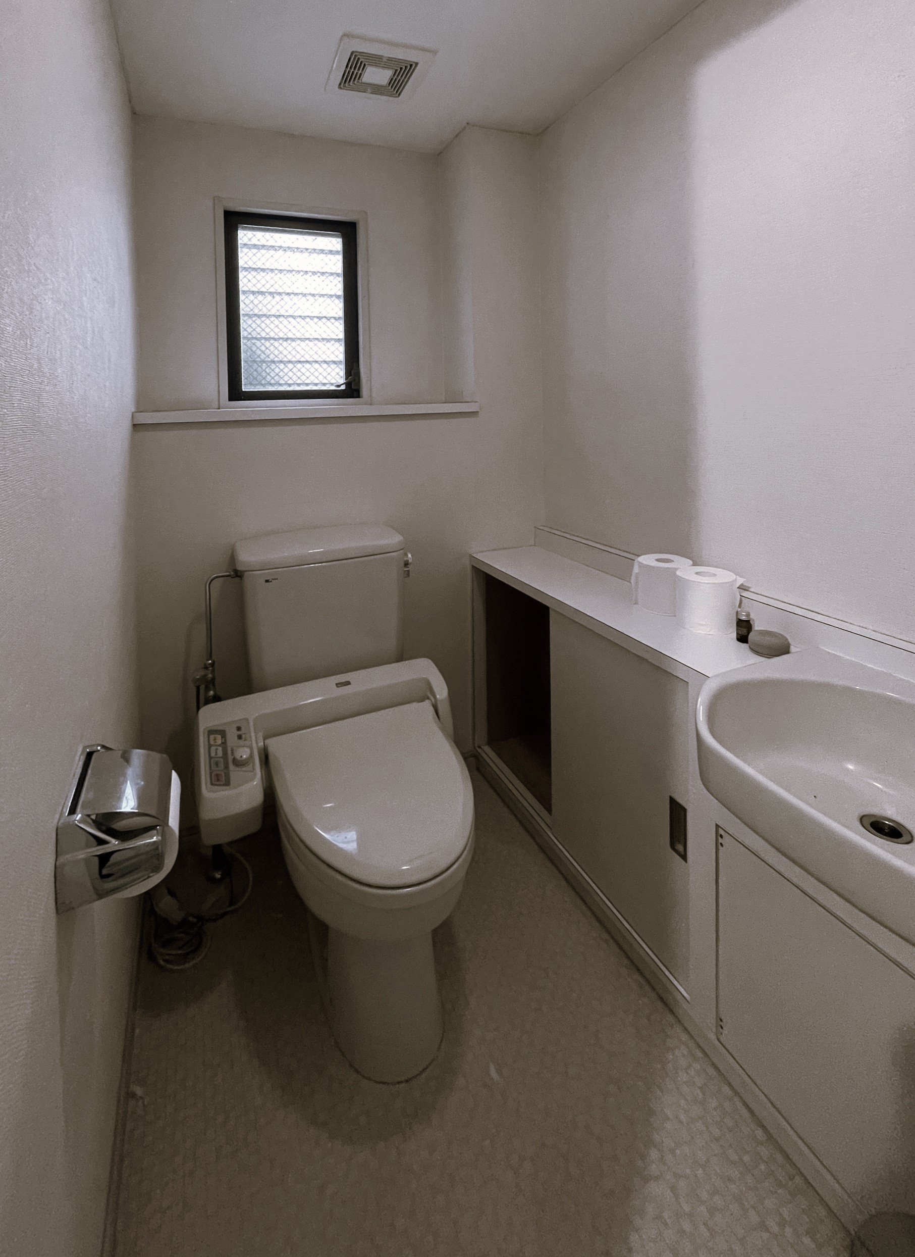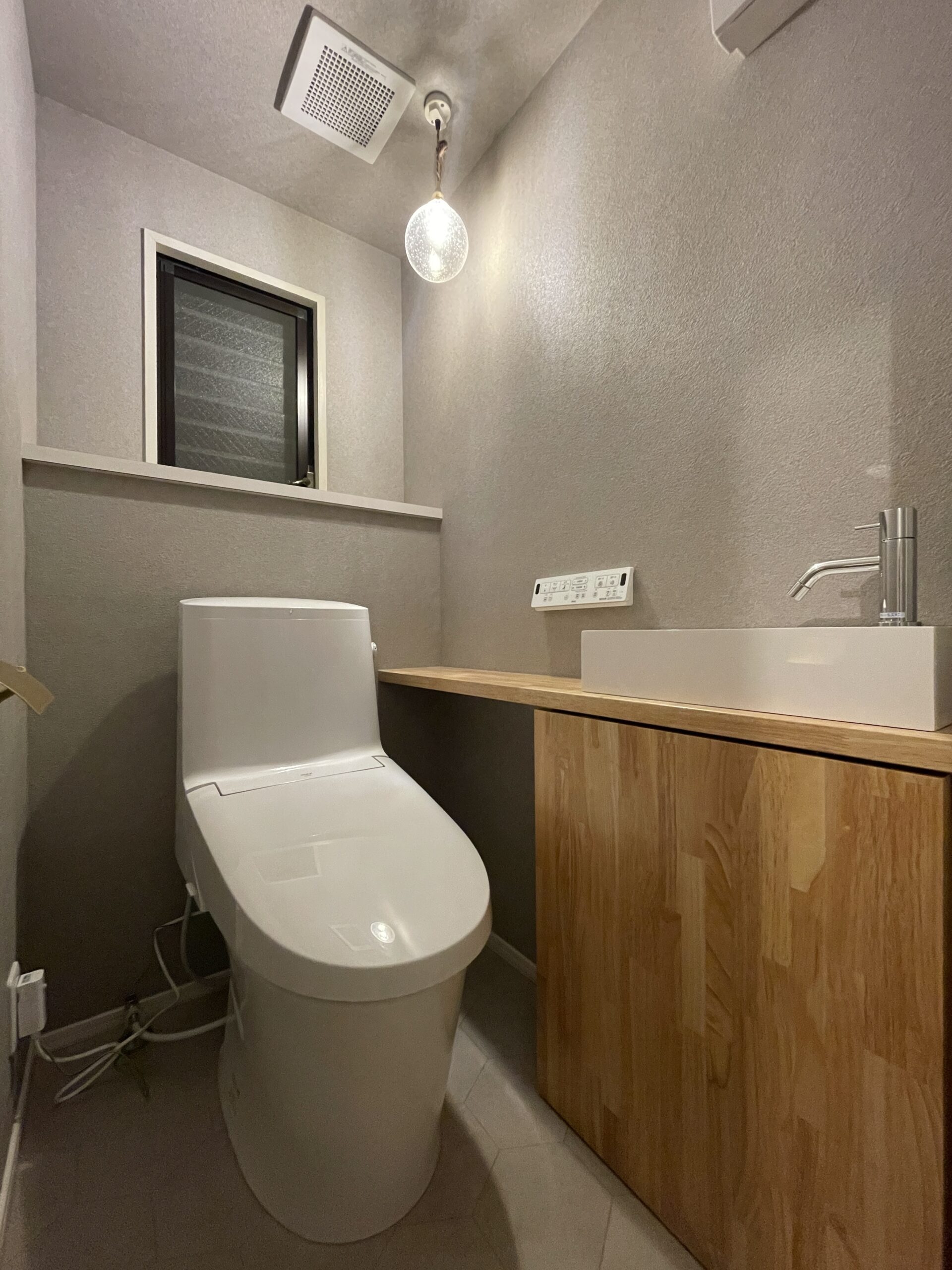 洗面室はトイレ側へすこし広げました。インターネットでご希望のイメージを集めてくださったので、そのイメージに合わせて洗面台と収納は造作でおつくりしました。ボウルや水栓はサンワカンパニーの商品を使っています。同じくトイレの手洗いカウンターも サンワカンパニーのボウル・水栓を使って造作しました。