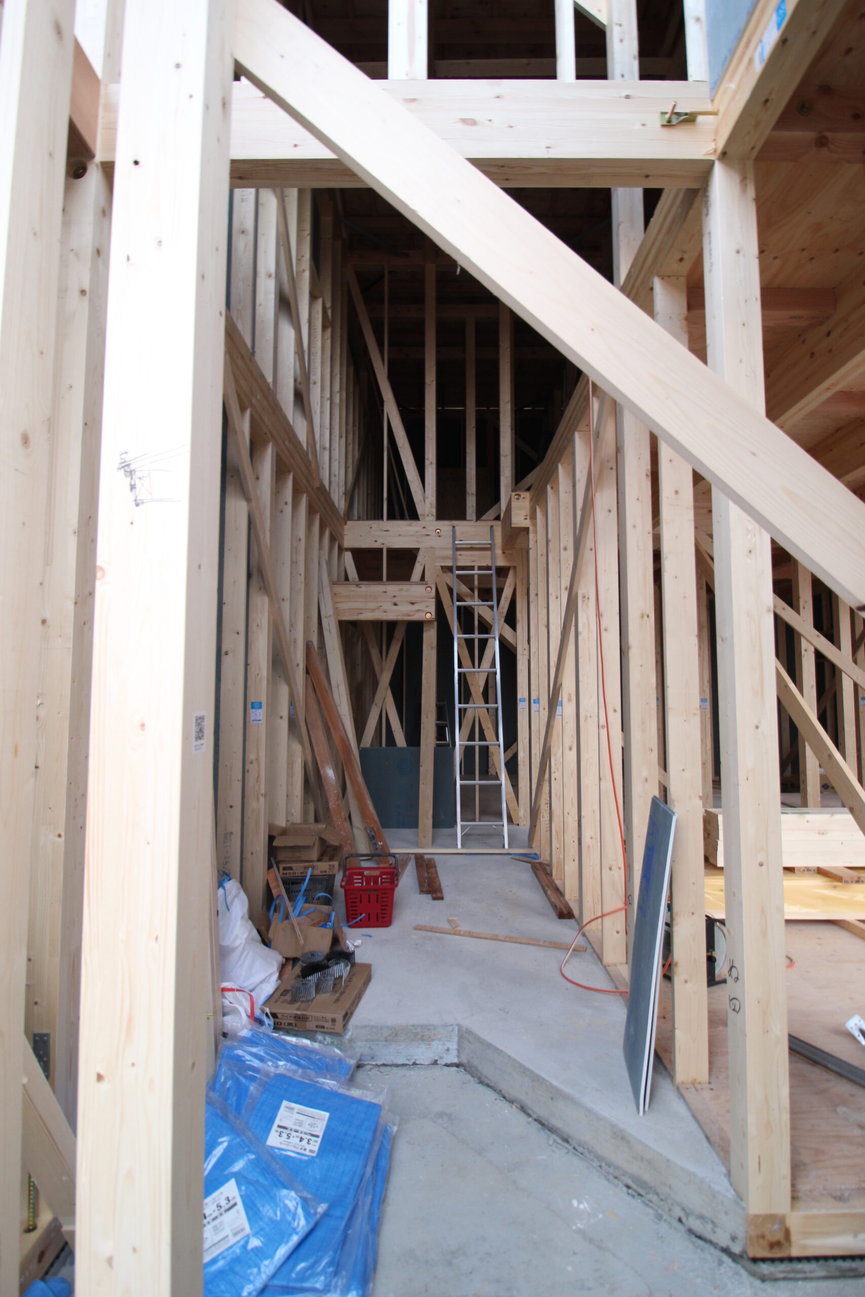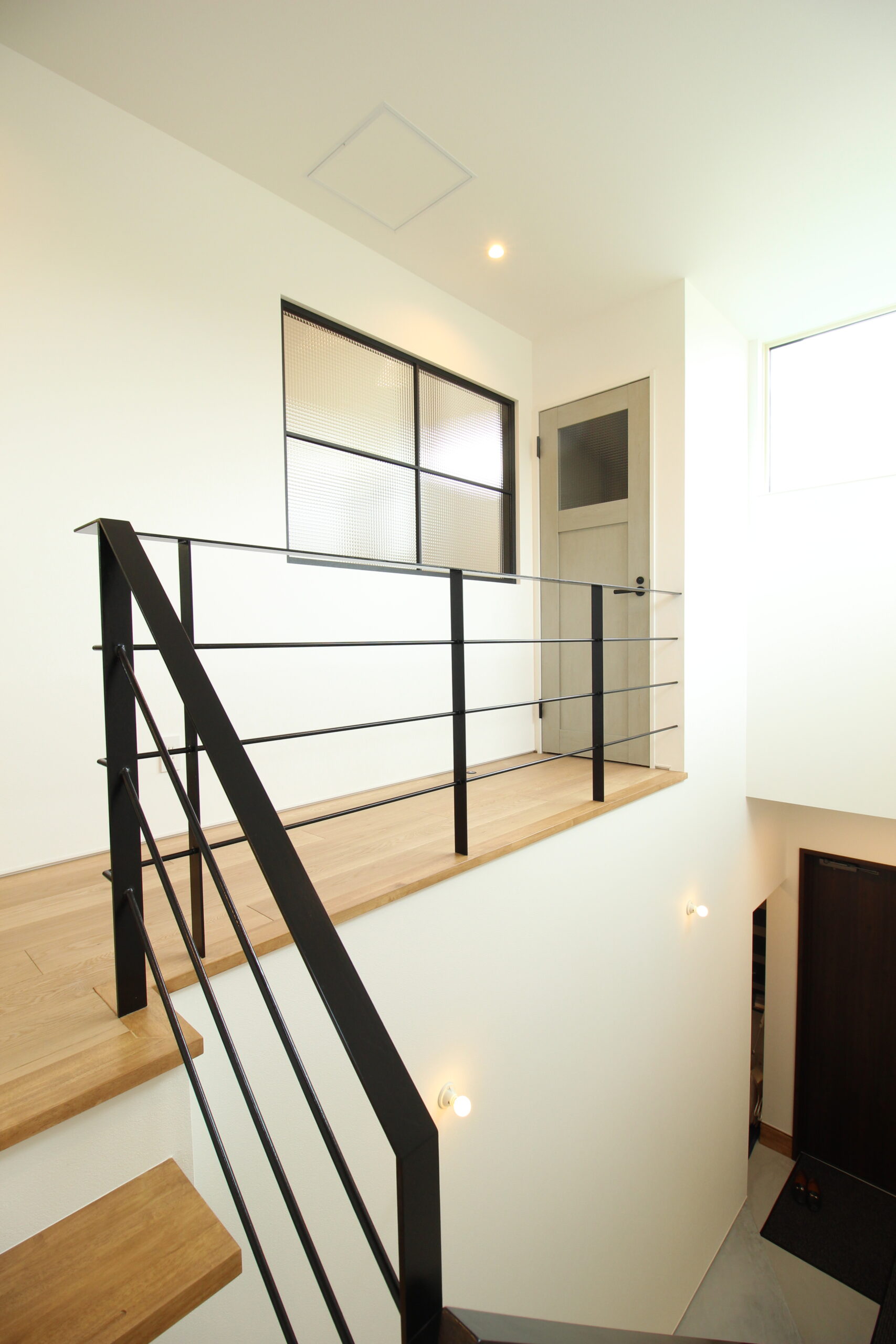 玄関のドアを開けると、右手にたっぷりのシューズクローク、正面にはかっこいいアイアン手すりを設置したストリップ階段がお出迎えです。玄関から階段まで広くとった吹き抜けに 視線が抜けるストリップ階段をつかうことでより広々とより開放的な空間になり、贅沢な玄関ホールが。