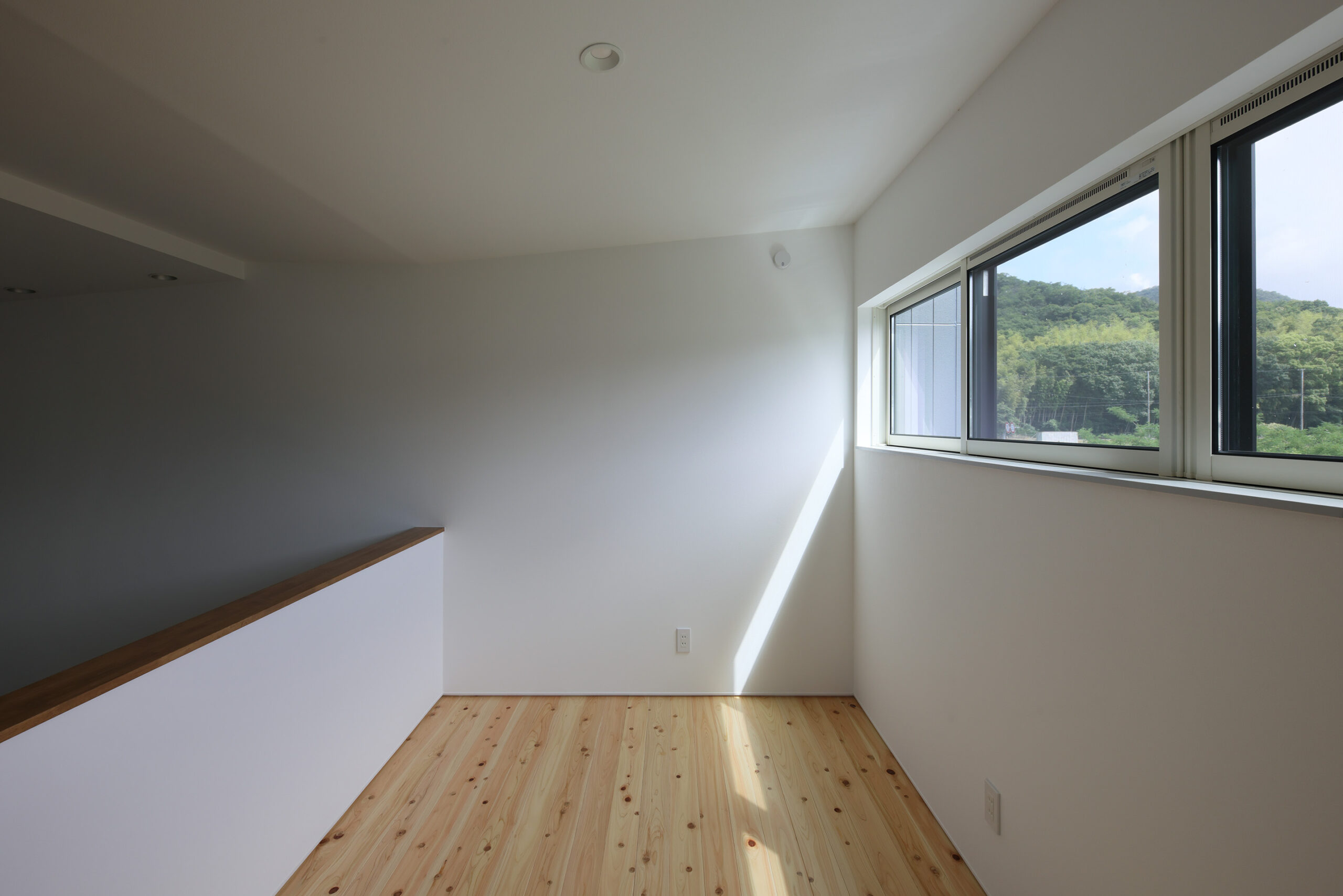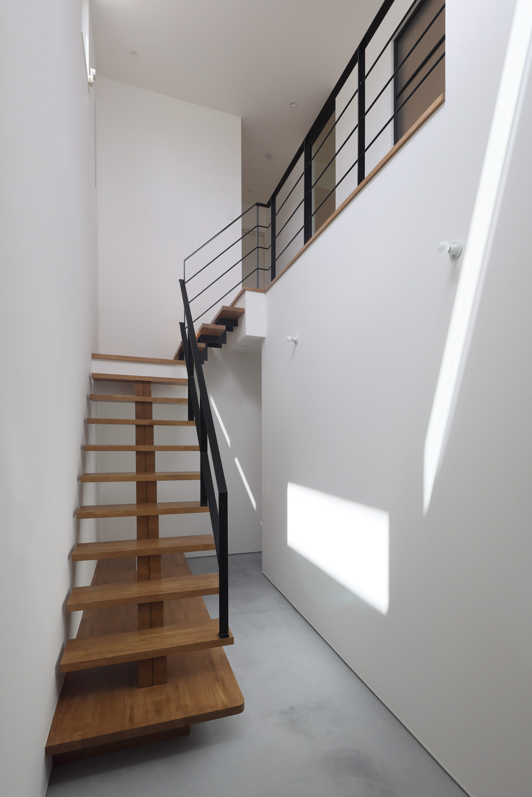 - 1階には寝室と水回り、2階にリビングを配置。床は無垢材で 照明をつけなくても日中明るい空間にしたい。