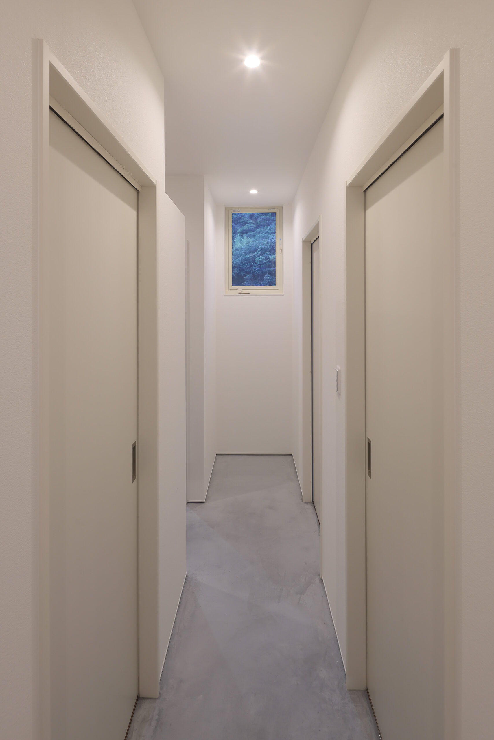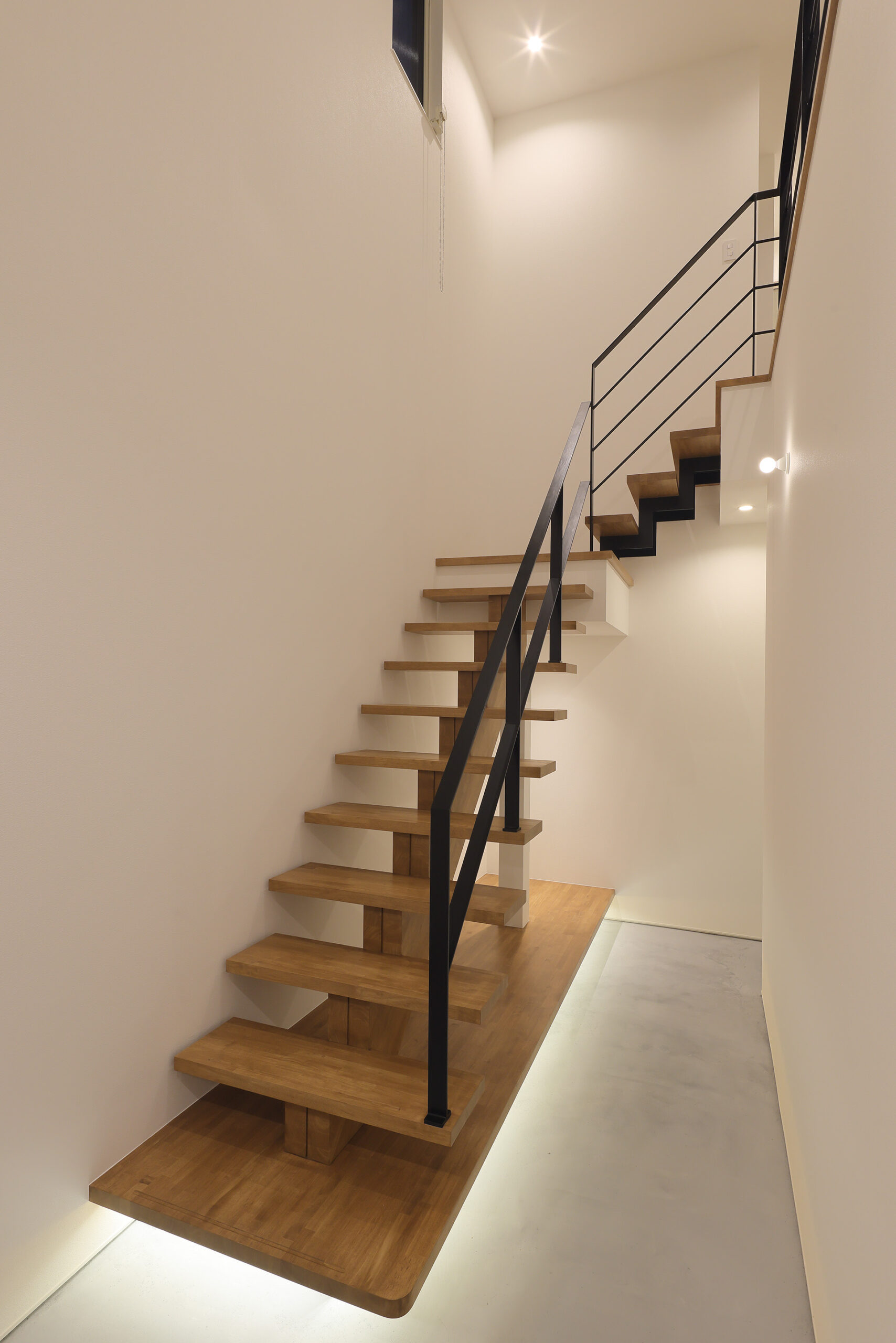 1階のホールと廊下は なかなかお目にかかれない珍しいモルタル仕上げで、無機質でクールなスタイルです。お部屋のフローリングとの見切りもできるだけ細いものにし、見た目にもとってもスッキリです。