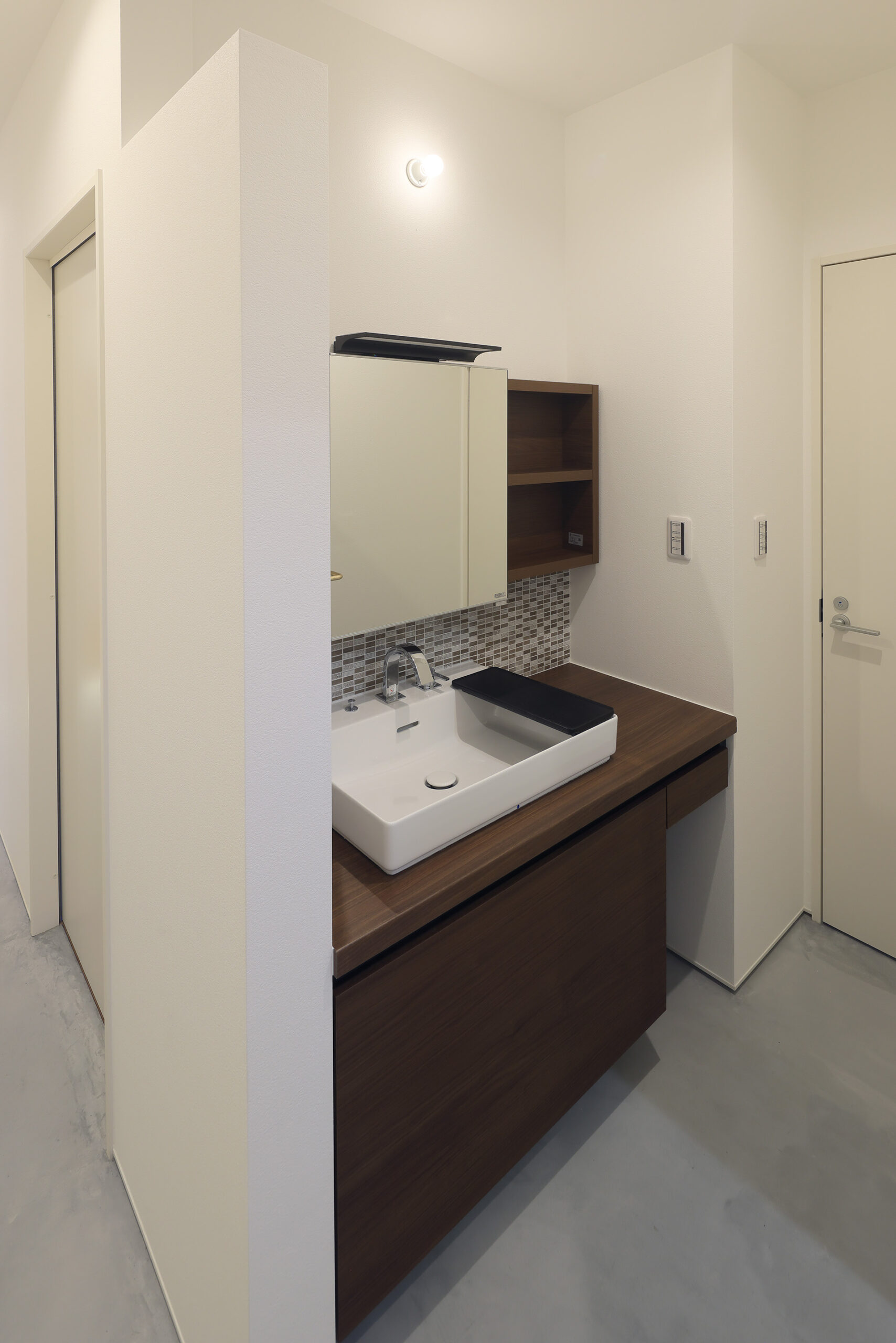 洗面台はいわゆる洗面脱衣室にではなく、モルタル廊下にオープンに配置しました。リクシルのルミシスをつかい、お好みのタイルを施したり、お施主様支給のおしゃれなタオル掛けも取付させていただきました。