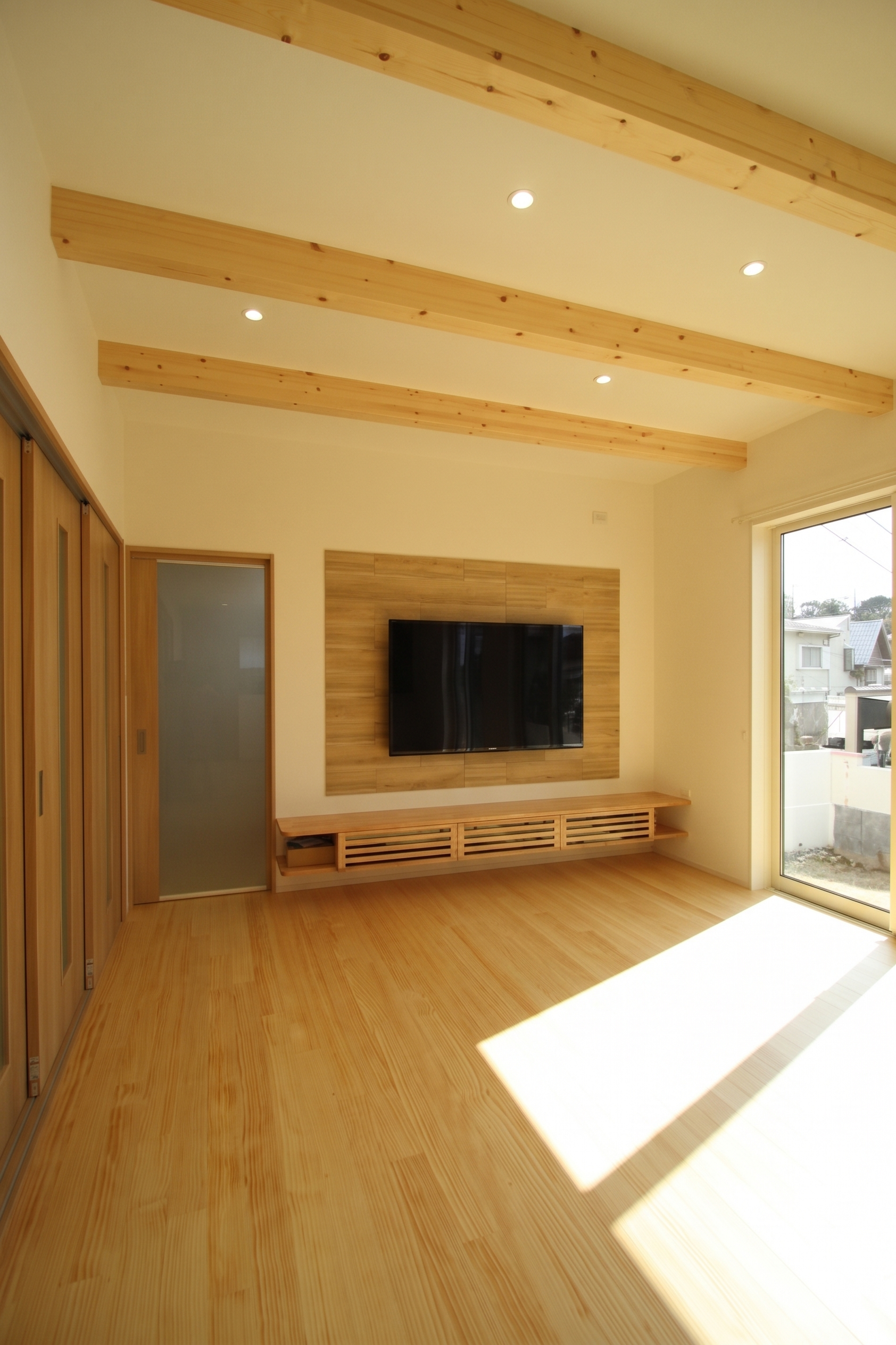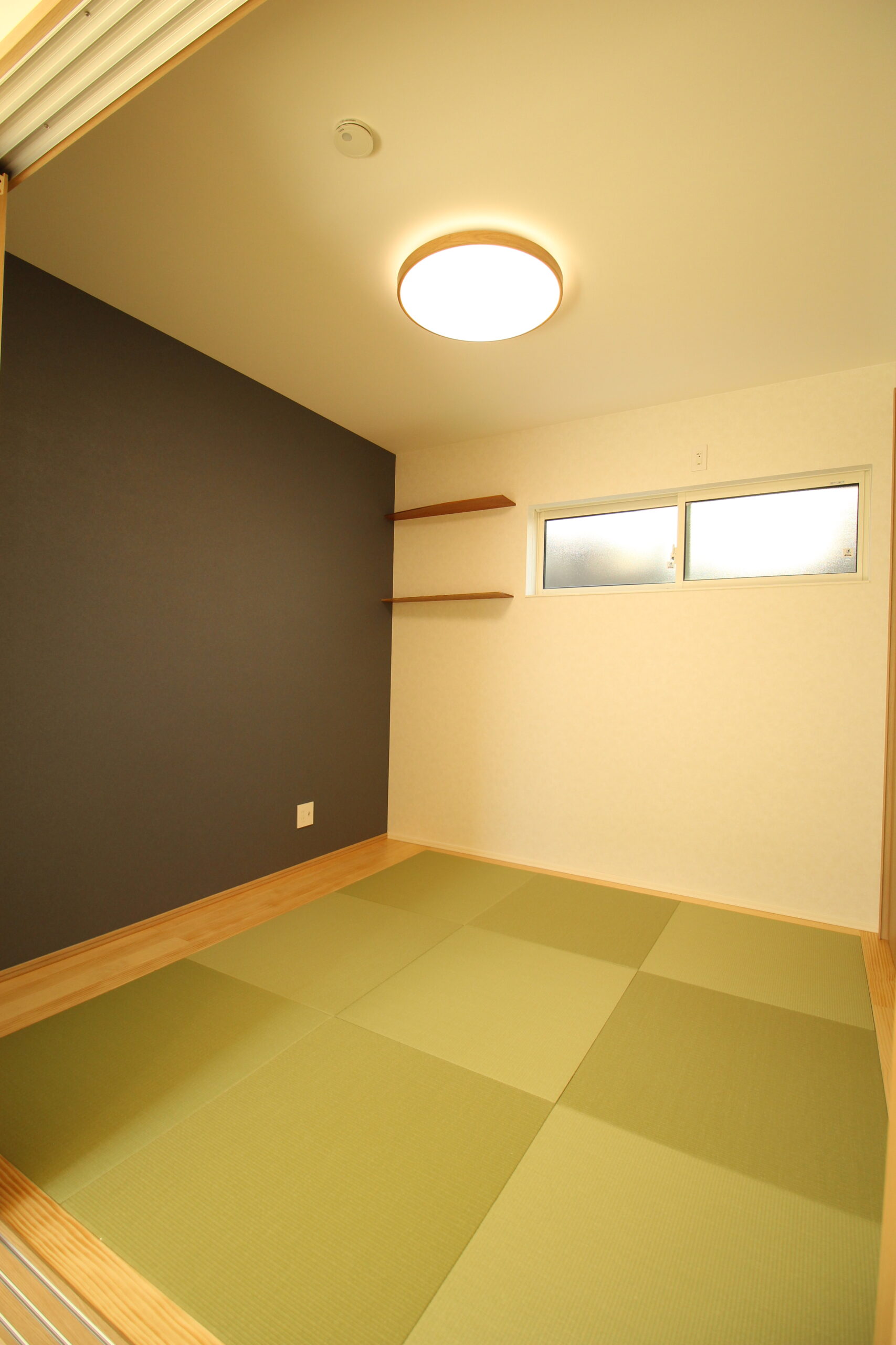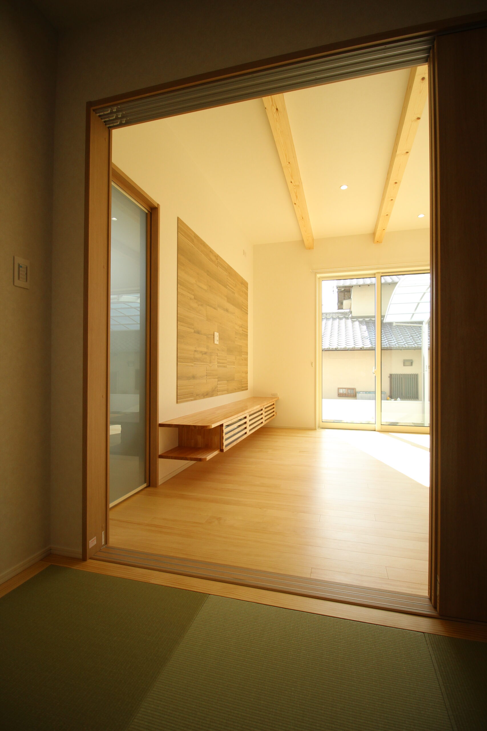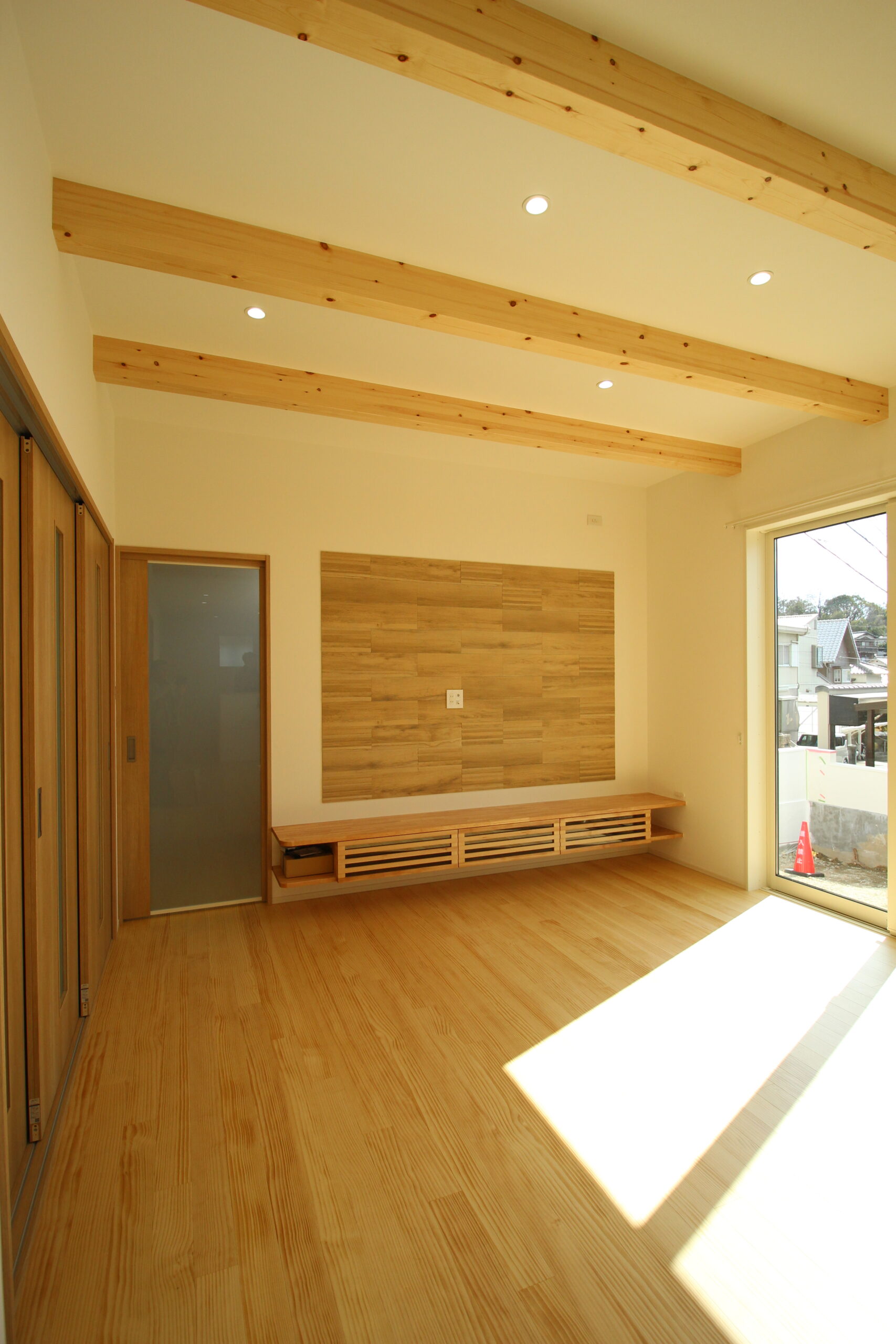 リビングのテレビ用壁面には調湿・脱臭効果に優れたエコカラットを施工しました。デザイン性の高さに加え、湿度をコントロールしてくれるので、快適に過ごせる空間に整えてくれます。