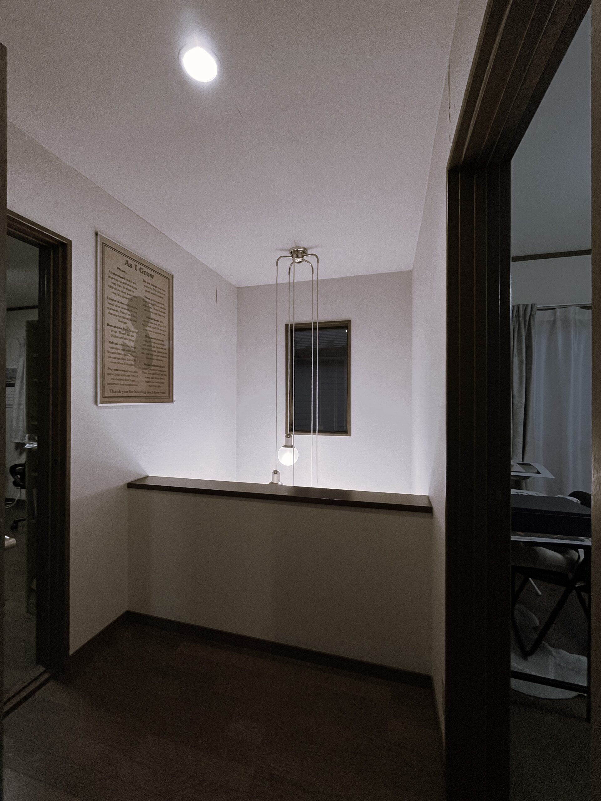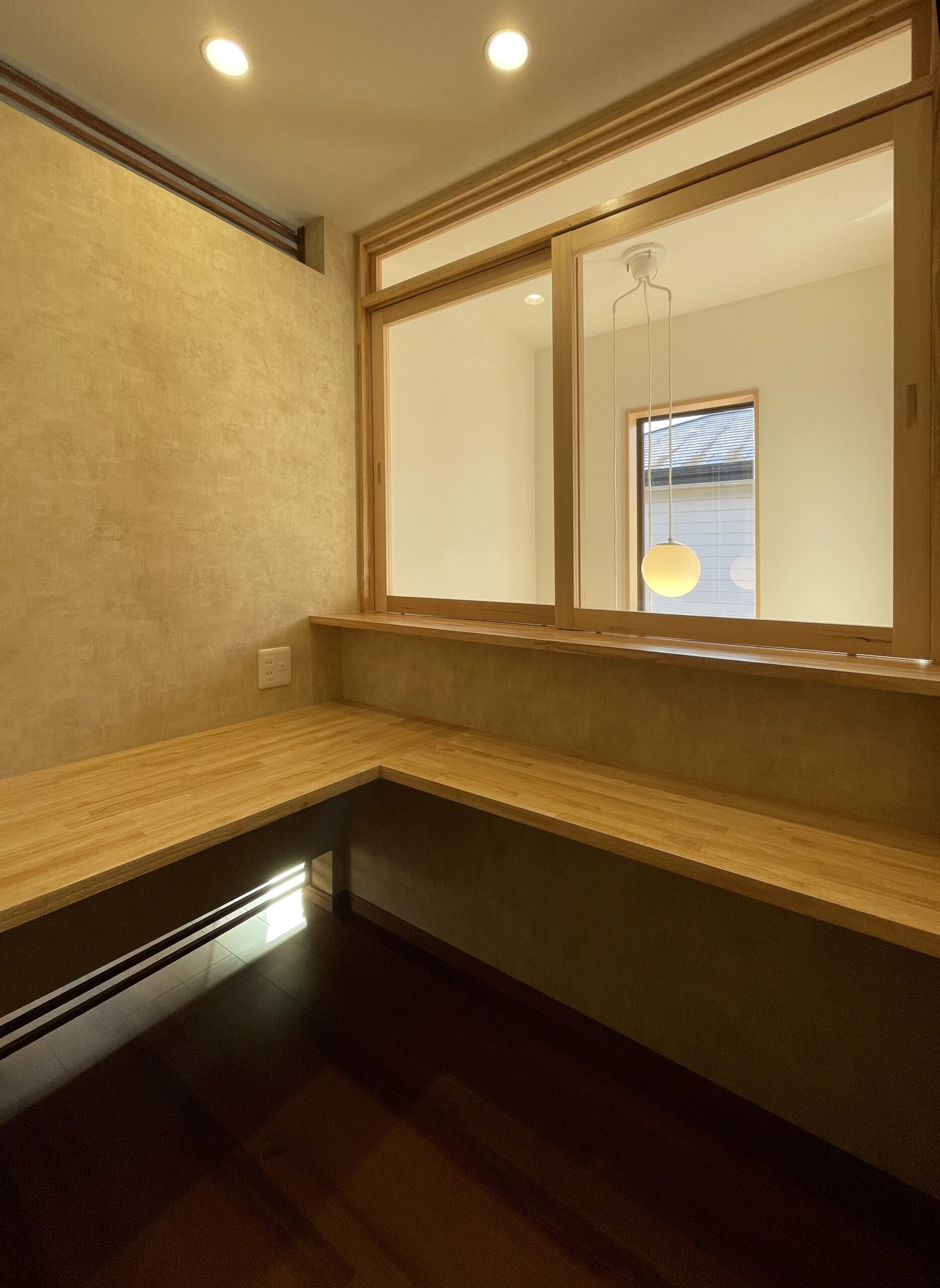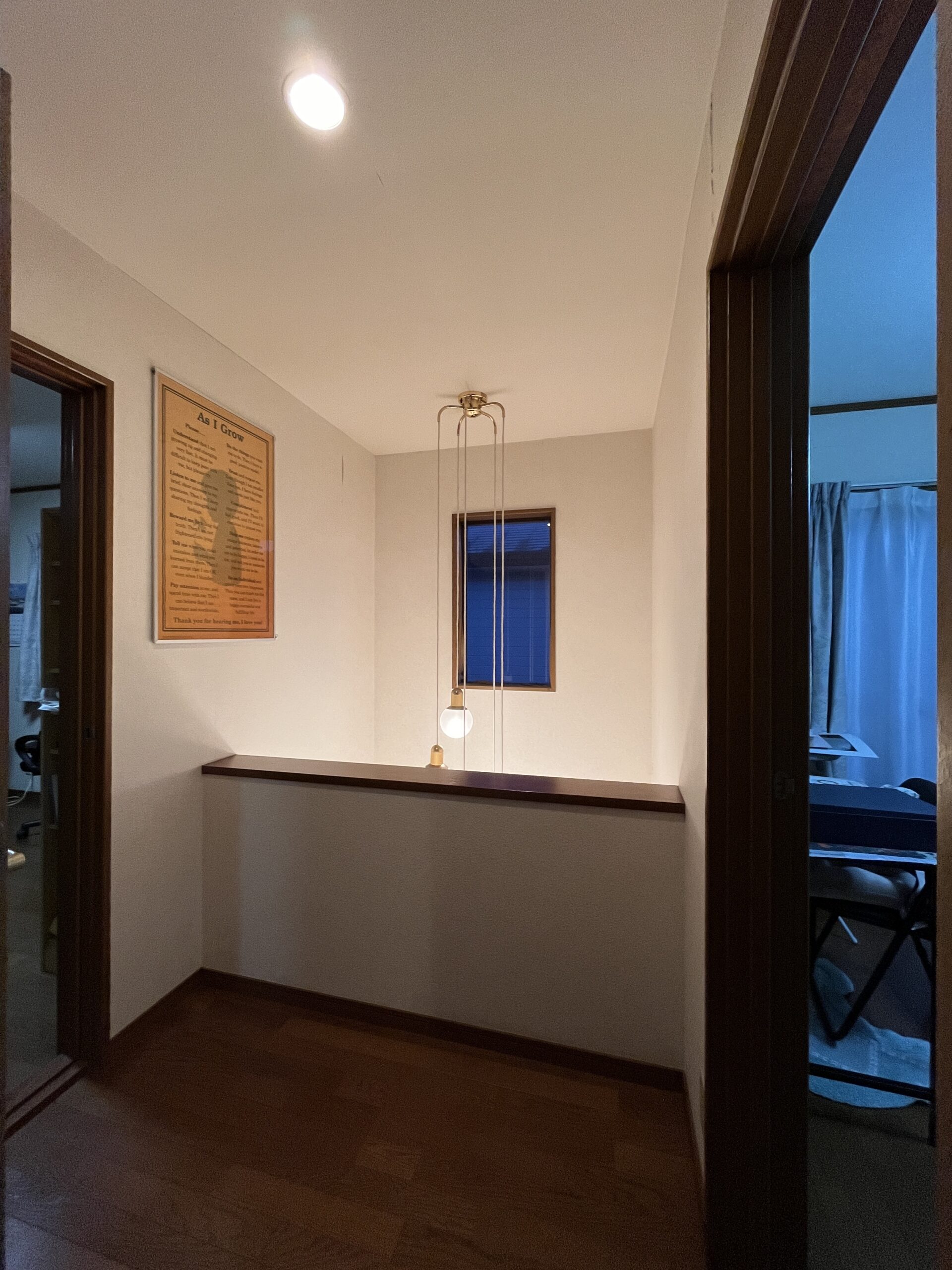 2階の間取りも変更しました。もともと和室があったスペースを寝室から行き来できるウォークインクローゼットへと改修し、和室の押入だった部分にあらたにトイレを新設しました。また、吹き抜けに面した2階ホール部分に お施主様のご希望だった書斎スペースをもうけました。吹き抜け側には室内窓を造作して、独立したお部屋でありながら光を取り込むことができ、素敵な雰囲気の書斎に仕上がりました。