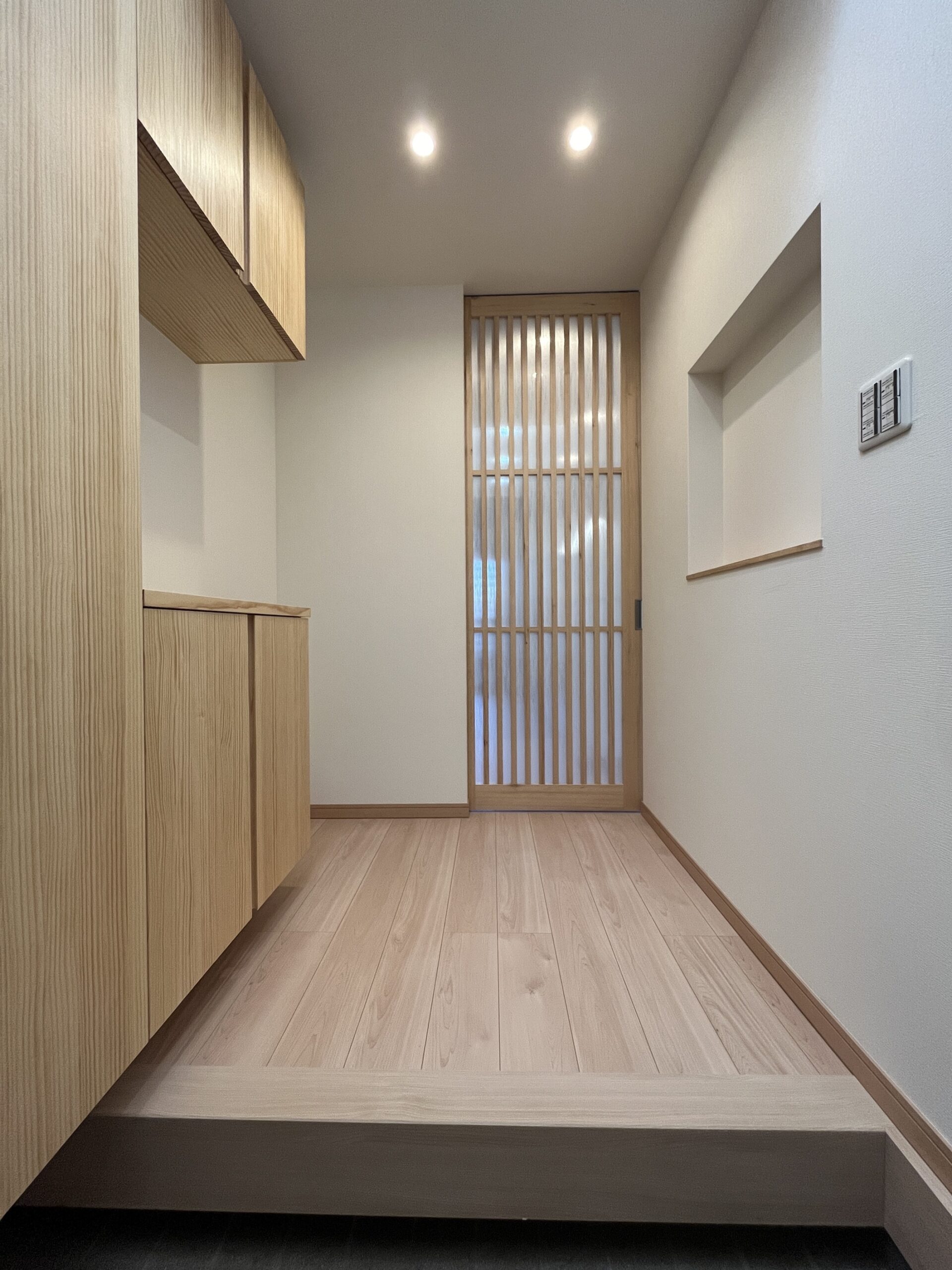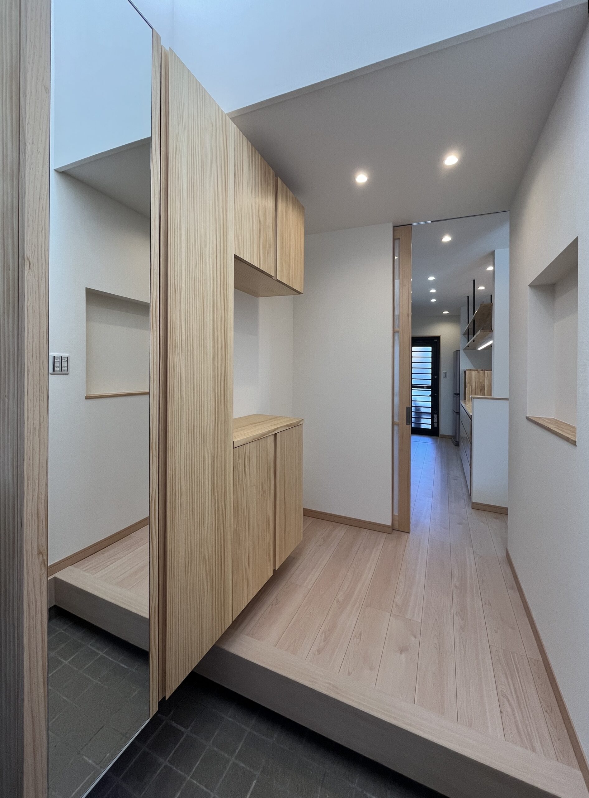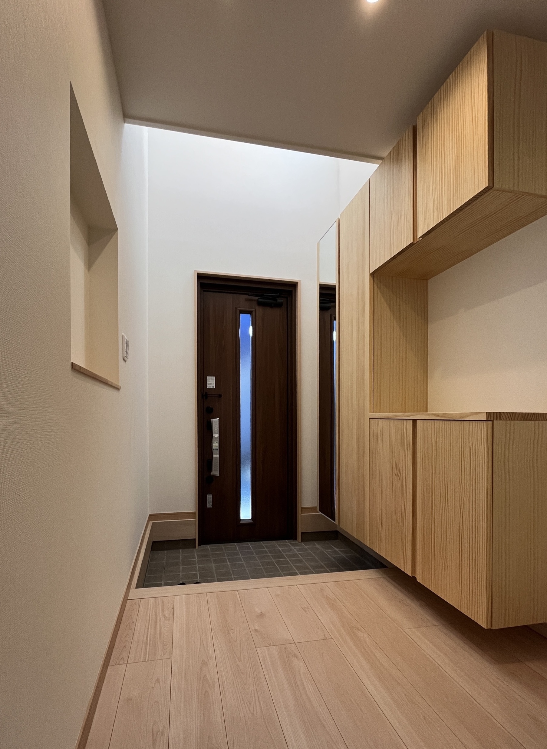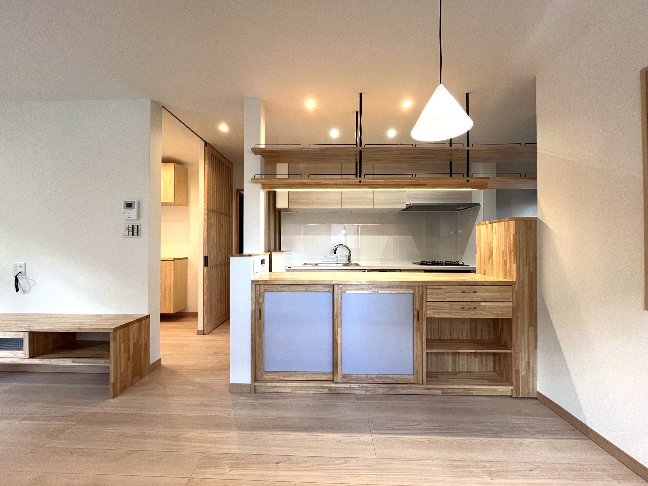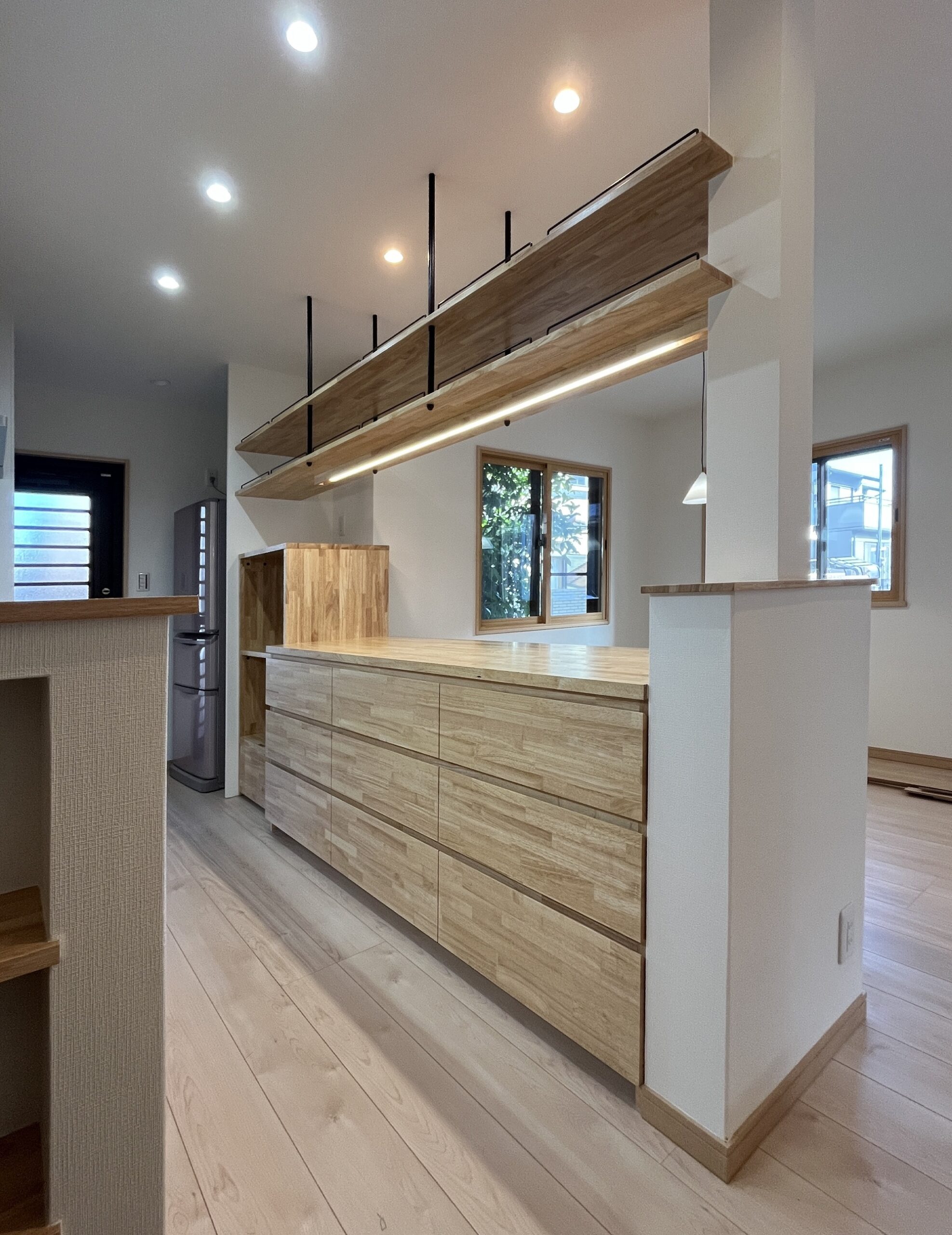 玄関ホールがかなり立派で広いおうちでしたが、あまり有効活用できていなかったので、ホールを縮小してキッチン側スペースを拡げパントリーをもうけました。もともとは垂れ壁のある対面キッチンでしたが、キッチンを壁付けに変更して収納を造作させていただきました。しっかり収納スペースを確保しつつも、より明るく開放的な印象のキッチンへ生まれ変わりました。