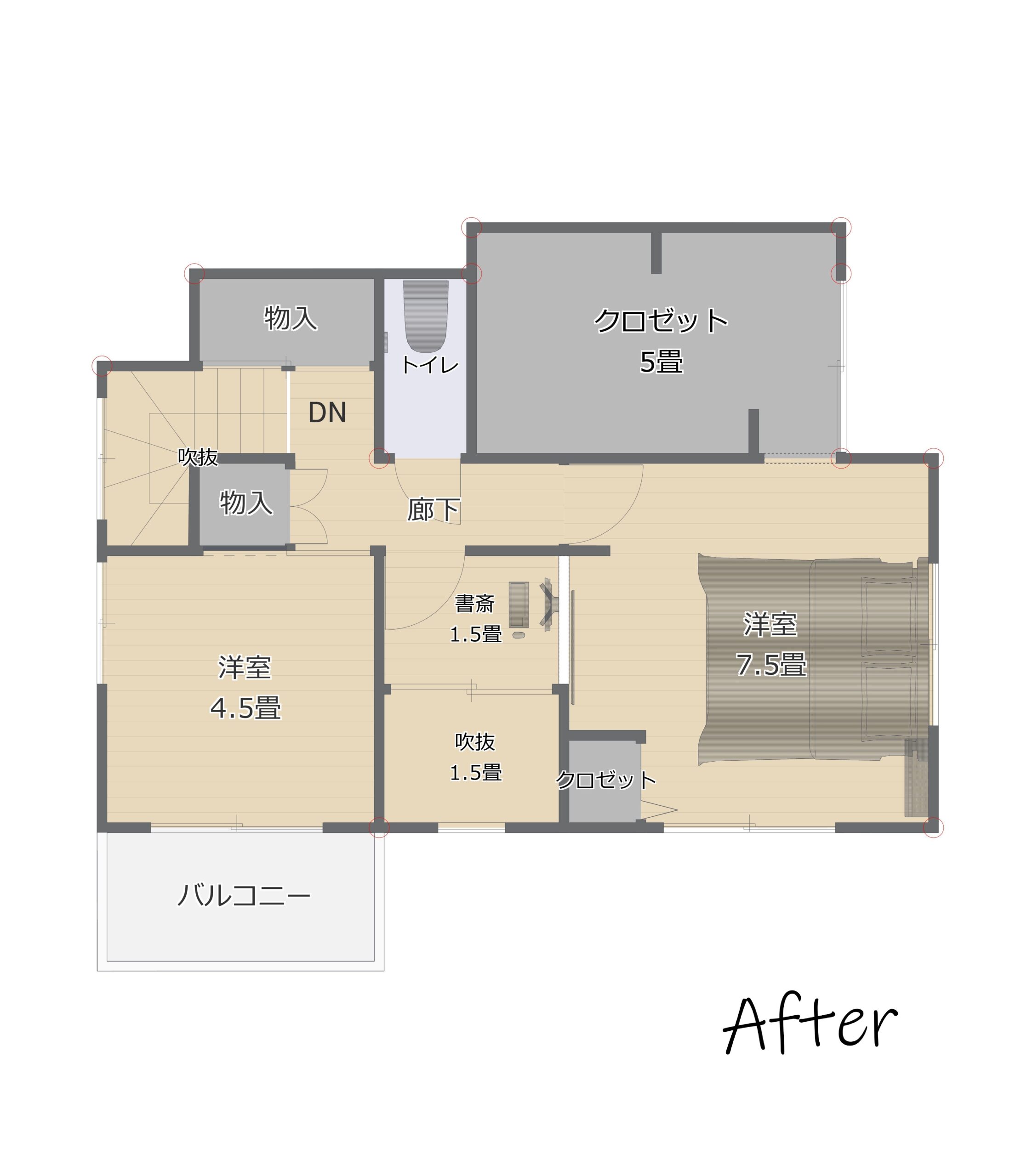 - 2階にトイレがないので、寝室からすぐ行けるよう新設したい