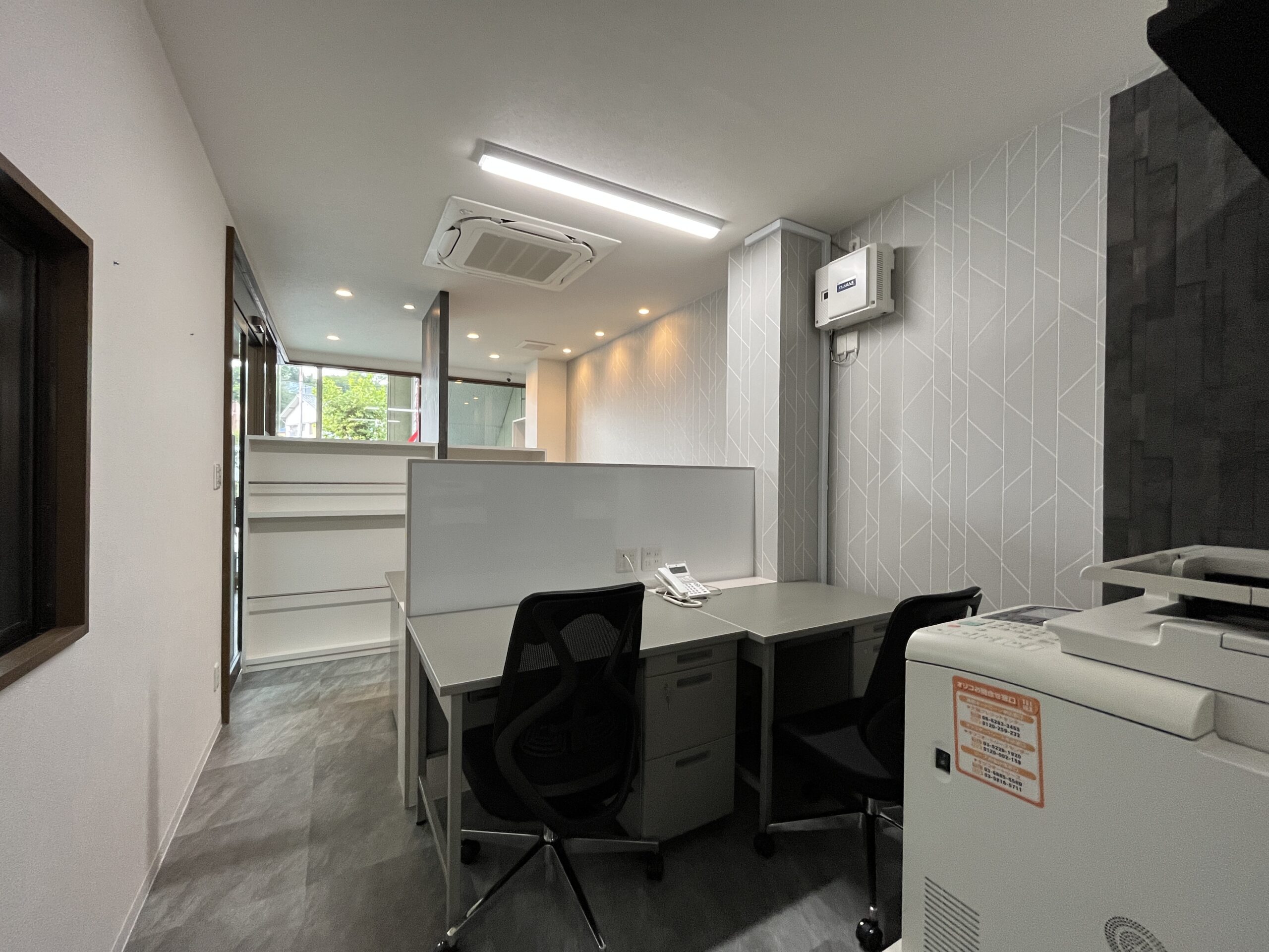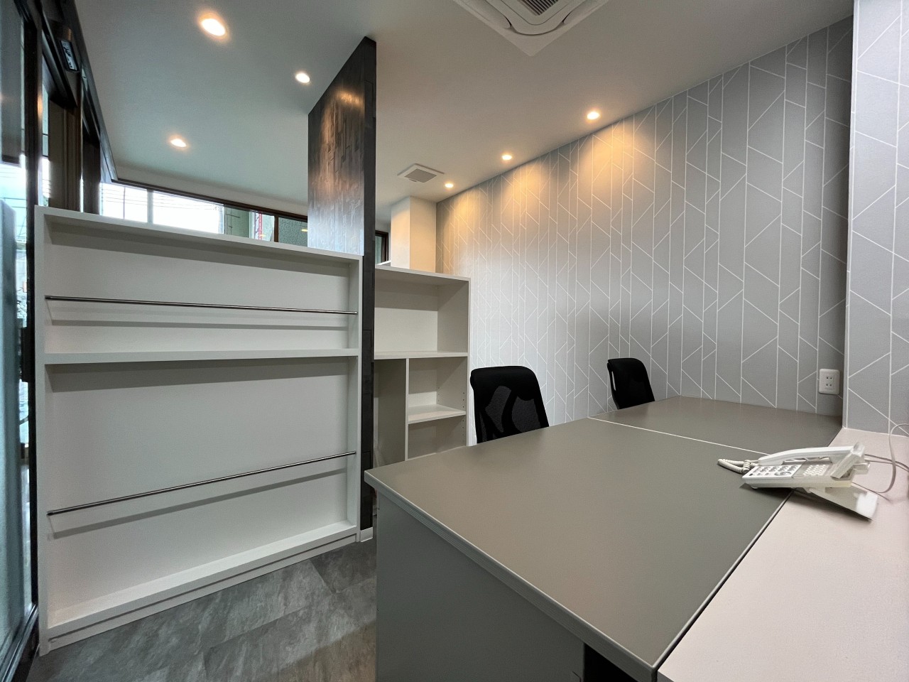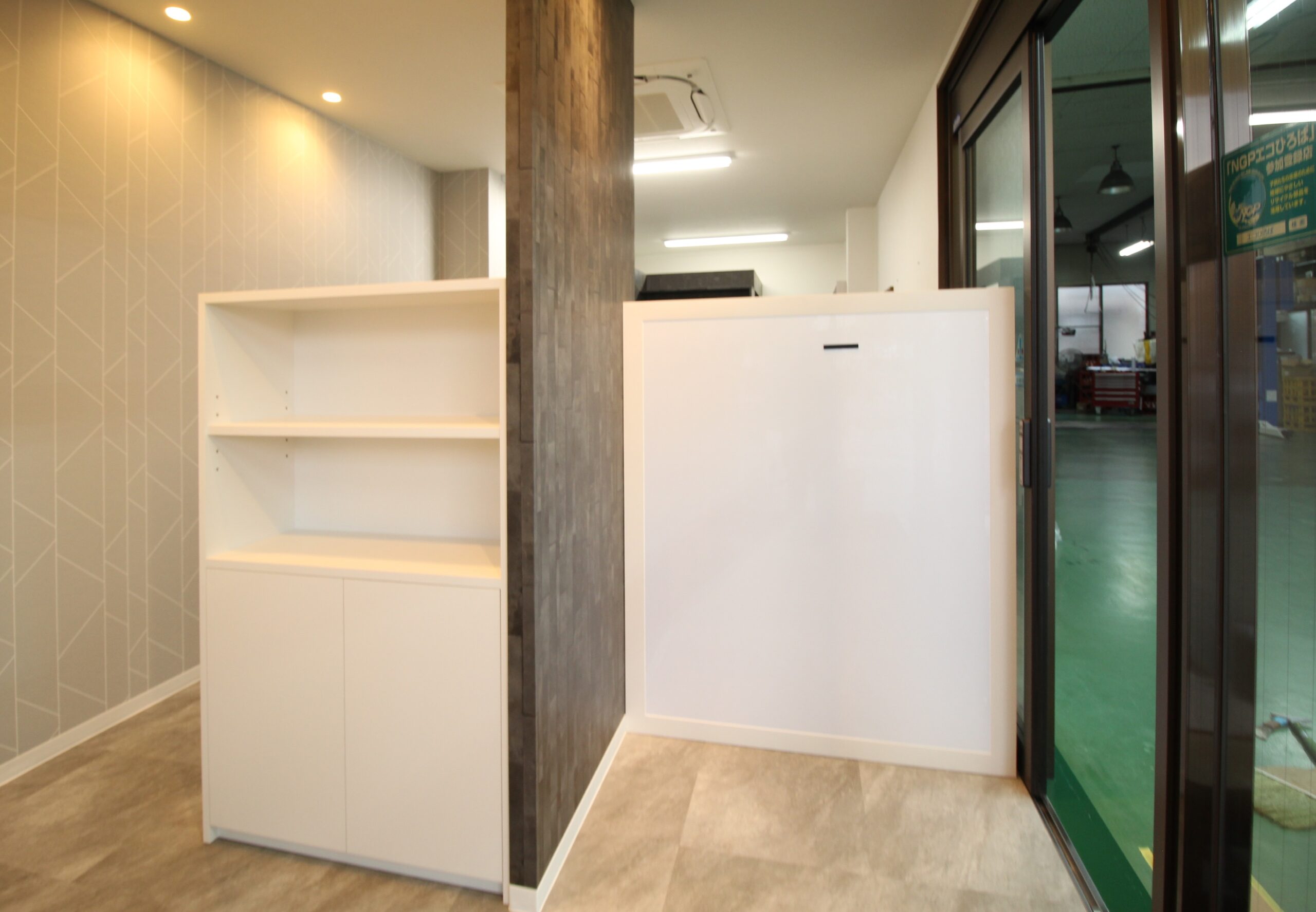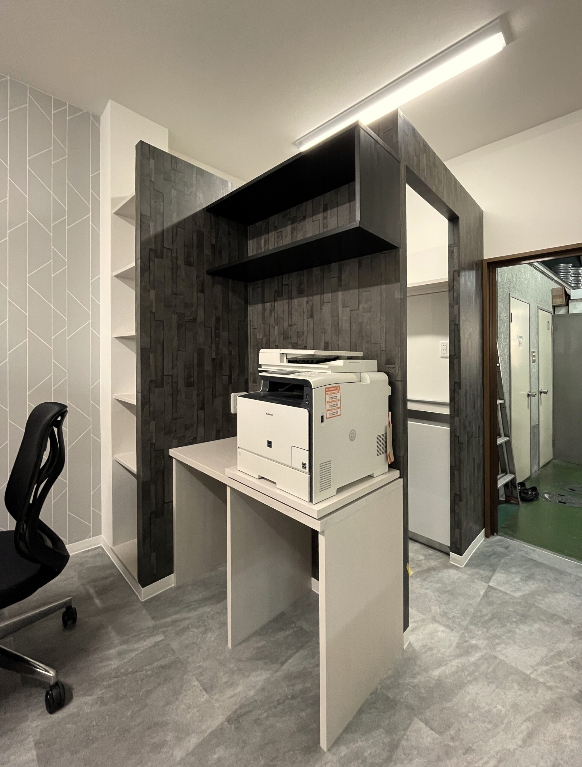 事務所内の内装改装工事をさせていただきました。元は入口からお客様が入ってくると事務所内が丸見えになってしまっていたので、ある程度高さのある収納棚をもうけて来客スペースと事務所スペースを区切り丸見えにならないよう配慮しました。