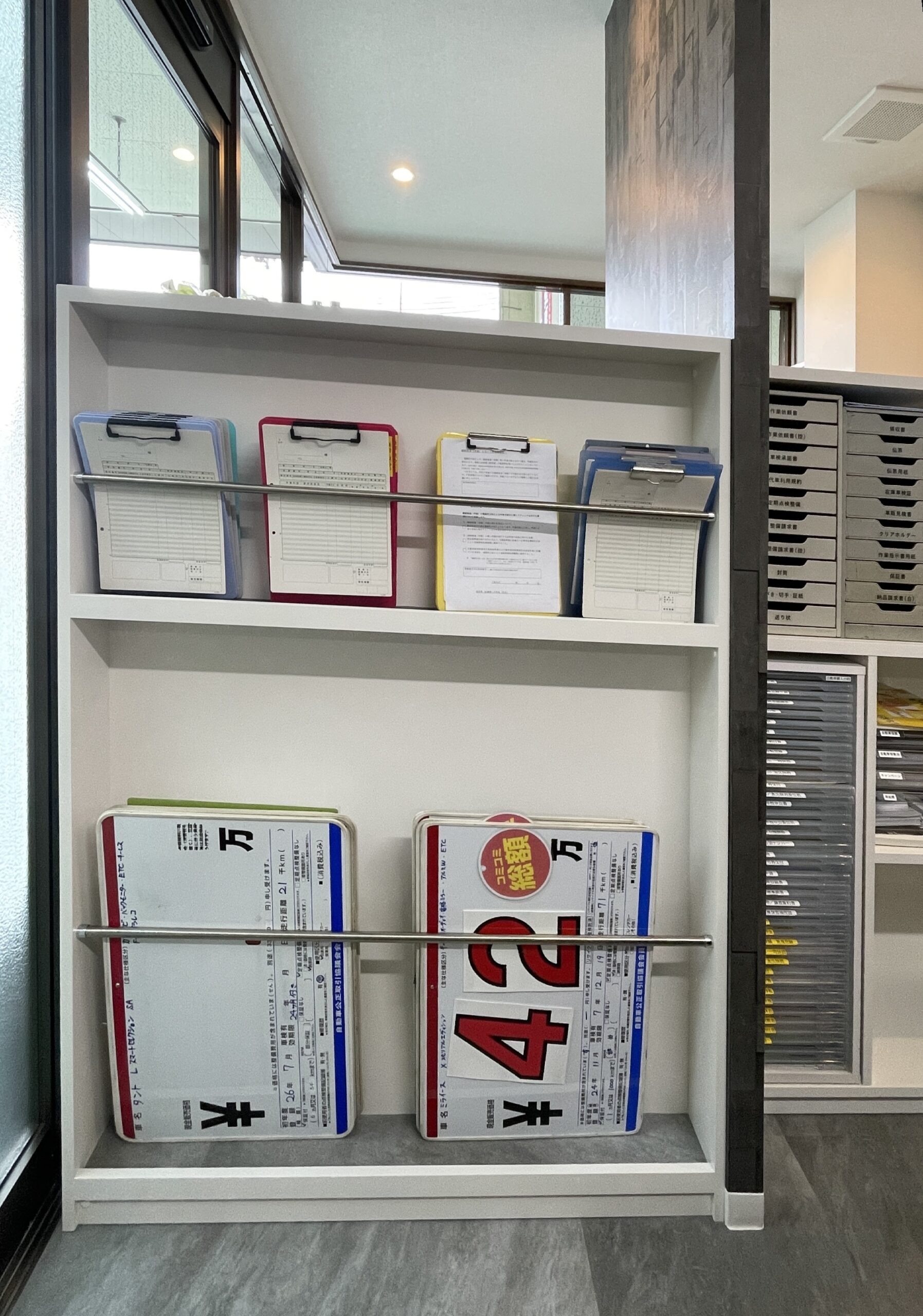 事務所内のいたるところにたっぷり造作収納棚をおつくりしました。大きなサイズのプライスボードや従来お使いだった引き出し収納ボックスなどもそのまま使えるようサイズを合わせて造作しましたので、ぴったり納まって使い勝手もばっちりです。