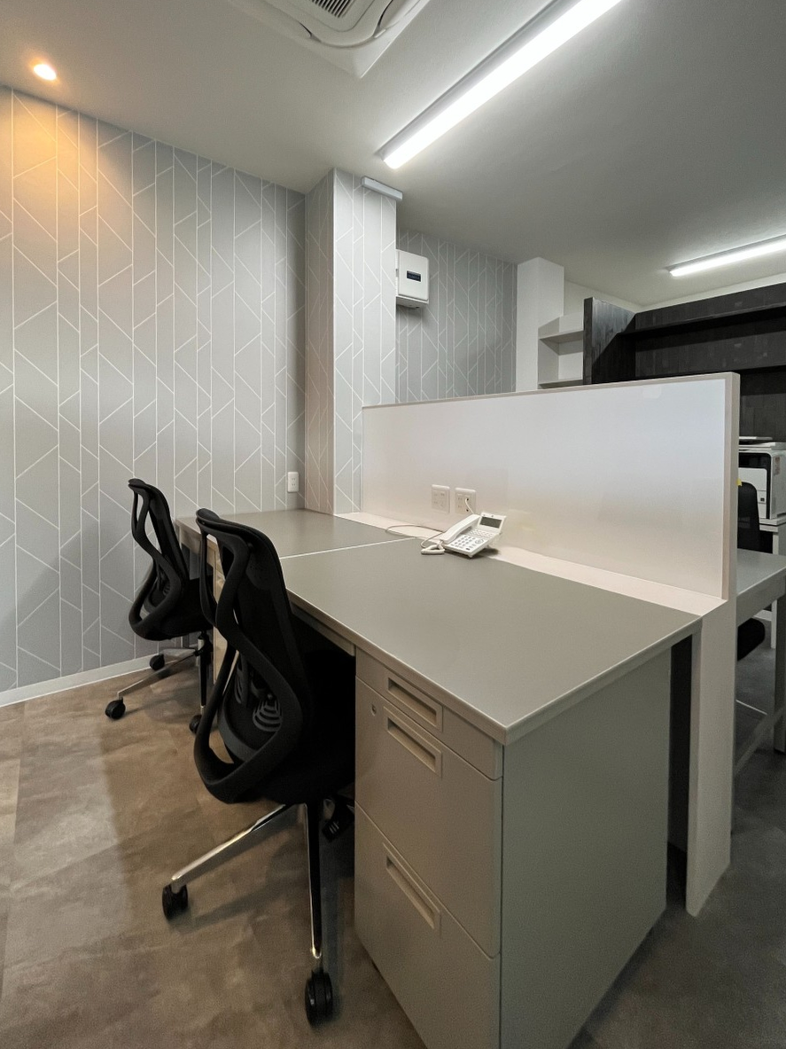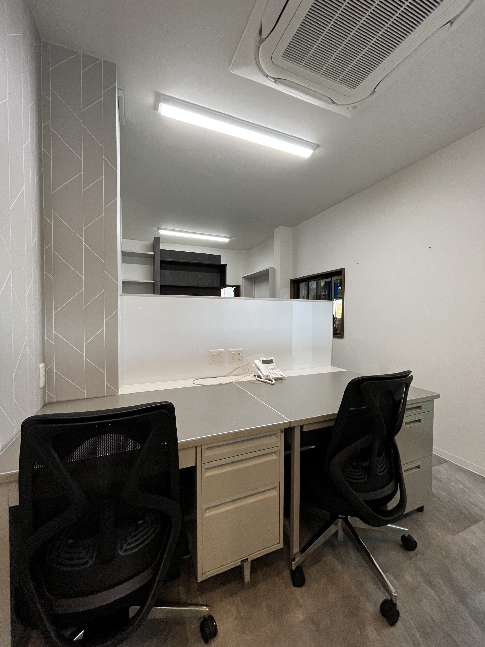 奥へ細長い事務所で元は4台のデスクを壁に向けて配置してあり、スタッフさんは背中合わせで仕事をするようなレイアウトでした。対面式レイアウトにしたいというご希望でしたので、現地で採寸→図面・パースを作成して検討し、2台ずつが向かい合って座れるようなレイアウトを叶えました。デスクの中央にはマグネットが貼れるシートをつかったパーテーションを造作しました。資料を貼ったり機能性よく使っていただけるかと思います。