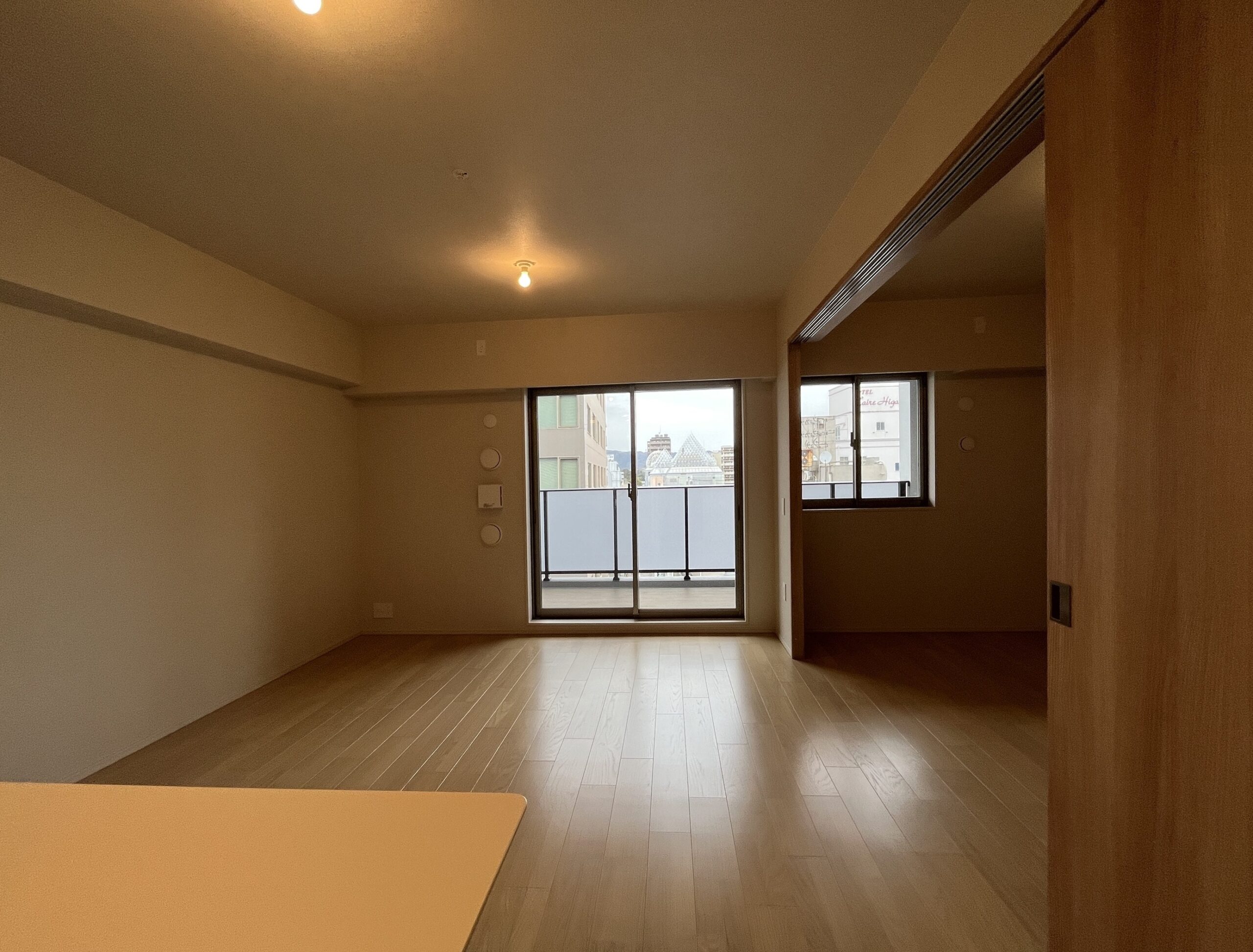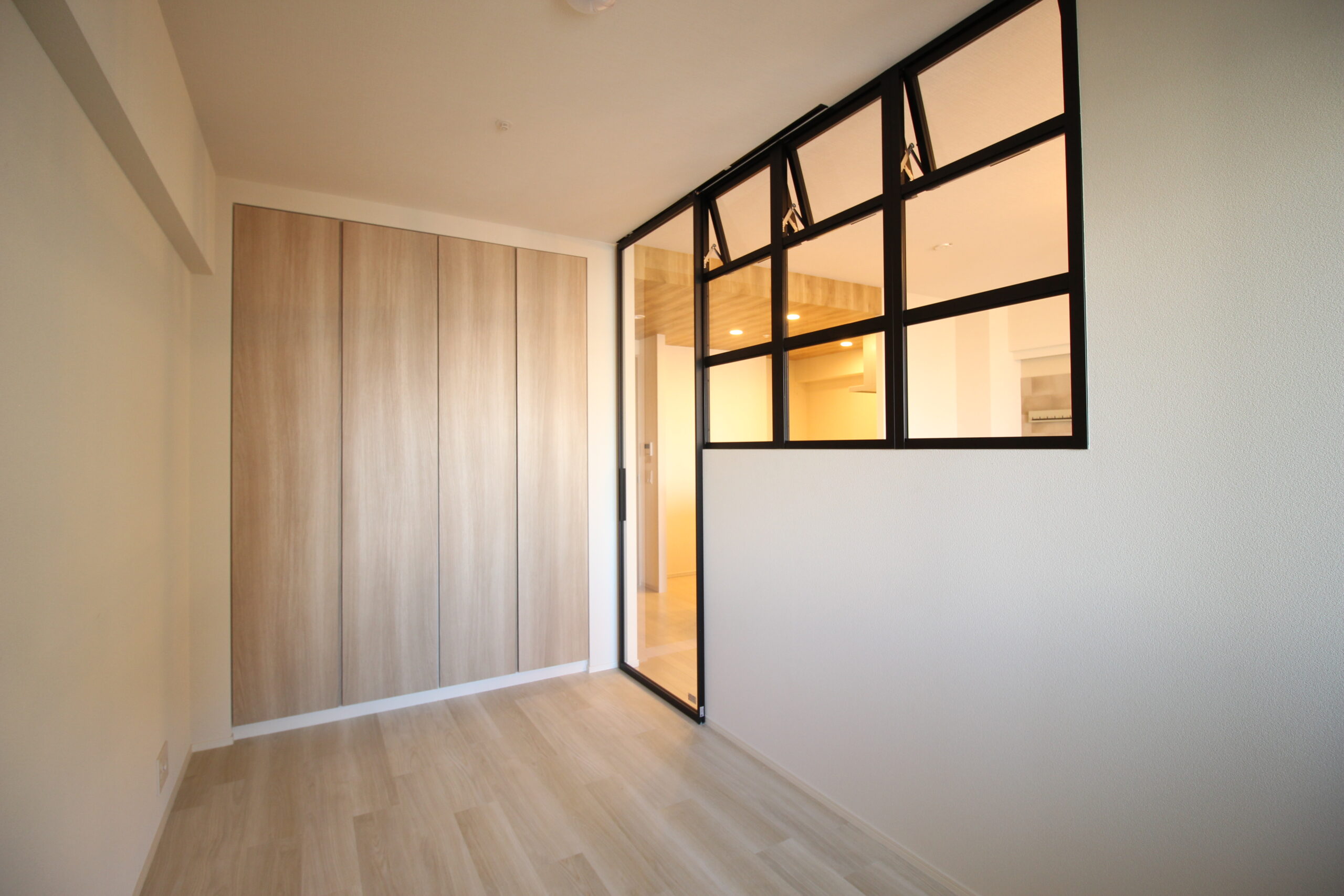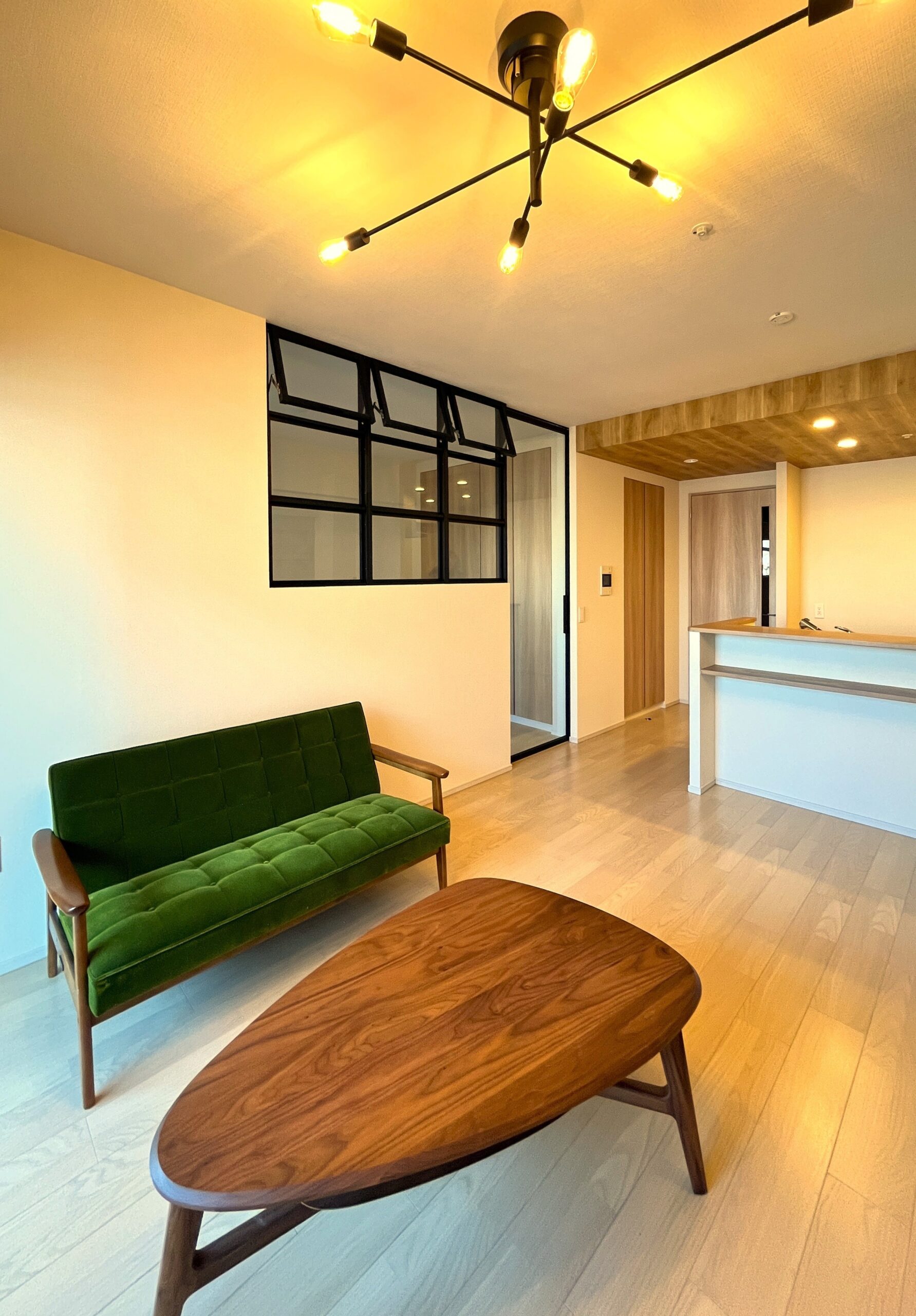 もともとリビングと洋室のあいだにはとても大きな3枚建ての引き戸があったのですが、壁をつくりなおして室内窓とアルミ製建具を入れました。空間のアクセントとなっておしゃれで人気な室内窓、そしてフルハイトですっきり洗練されたイメージのアルミ製建具を取り入れて、開放感あるリビング空間に生まれ変わりました。