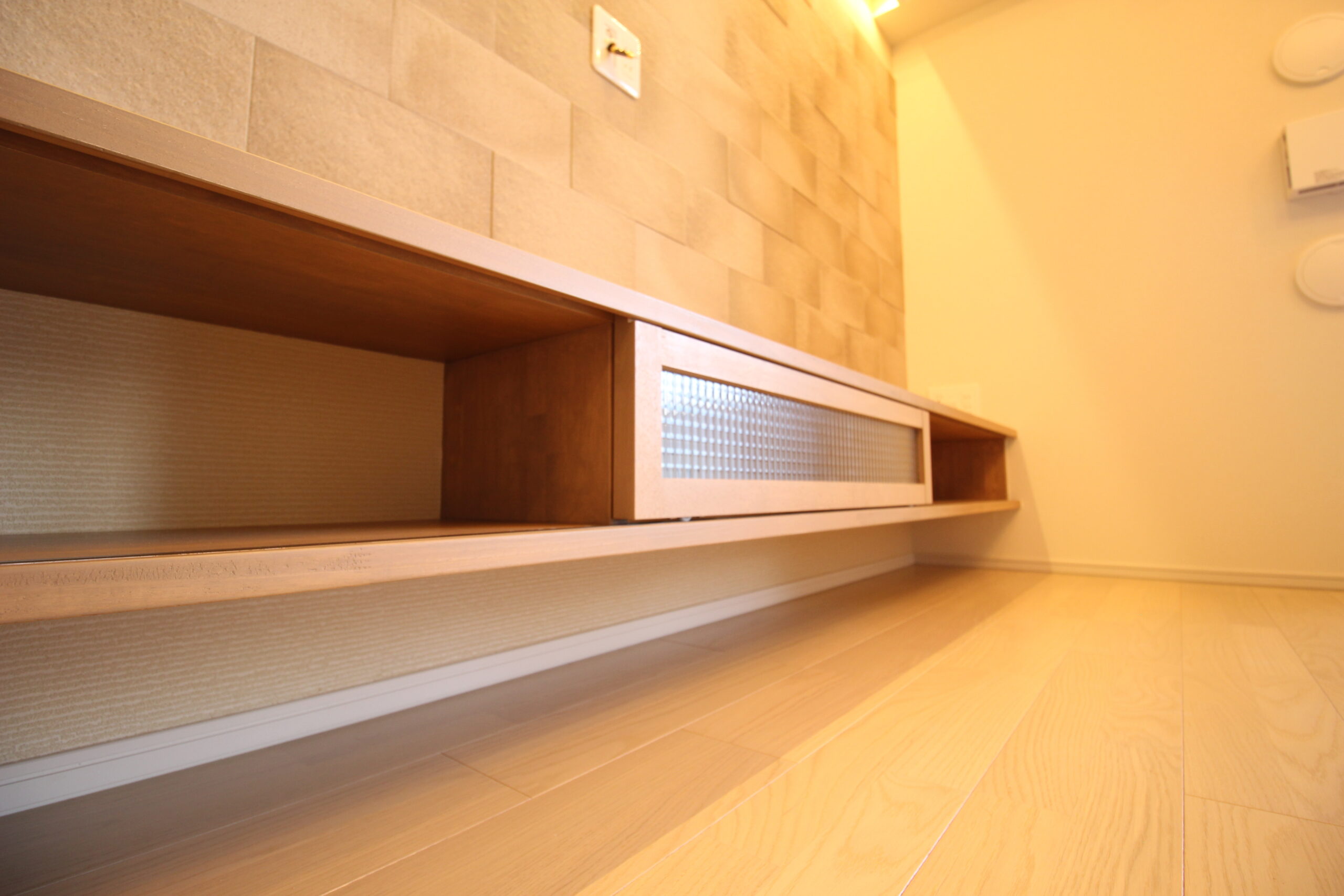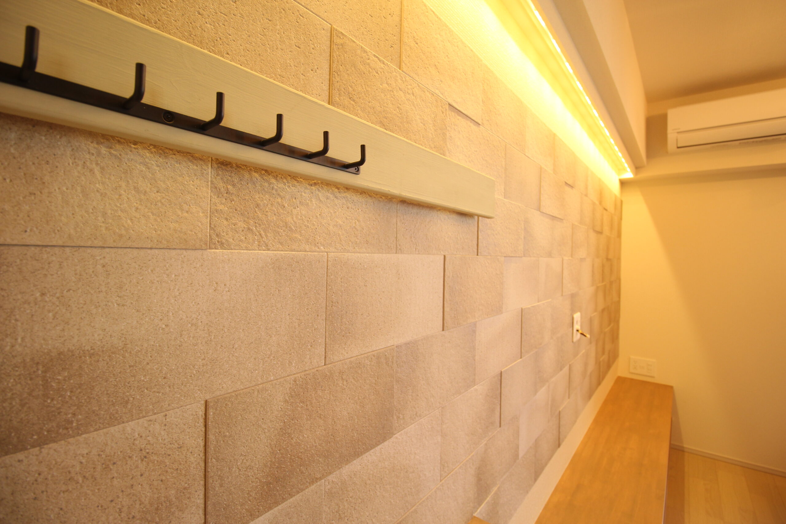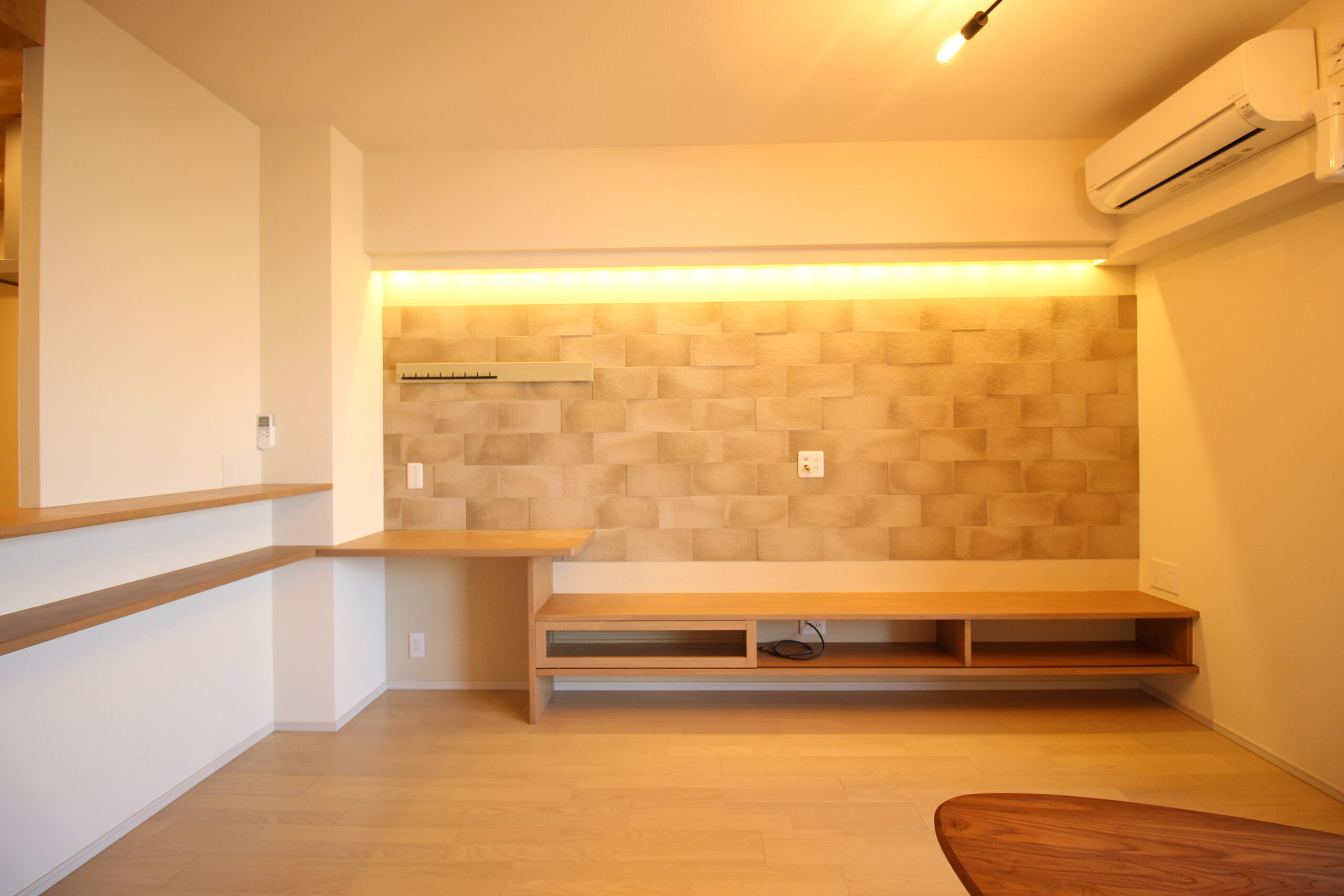 なんにもなかったリビングの壁面には、造作家具・エコカラット・間接照明をトッピングしました。キッチン側のカウンターからつながるワークスペースとテレビボードを造作し、壁面には端から端まで調湿・脱臭にすぐれたタイル『エコカラット』を施して機能面だけでなく意匠面にもこだわりました。また、上部には間接照明を取り入れたので、エコカラットの凹凸を光が照らして趣ある表情を楽しめるようになりました。